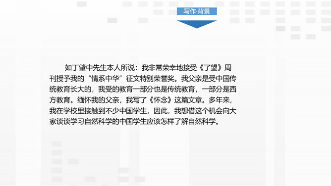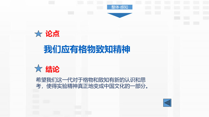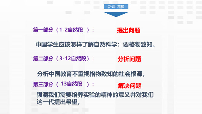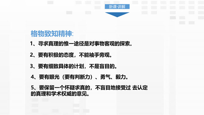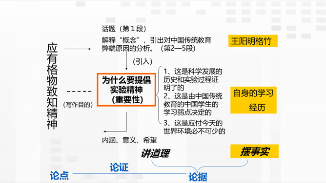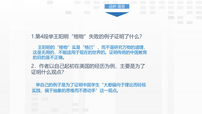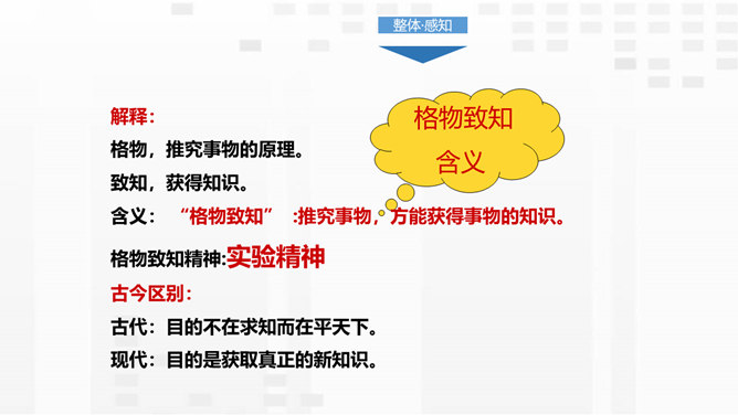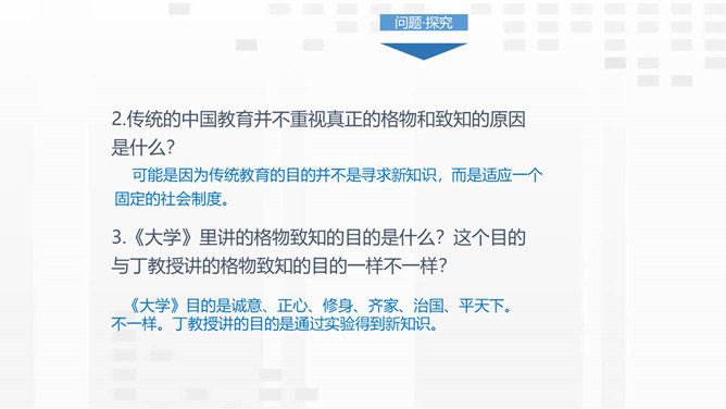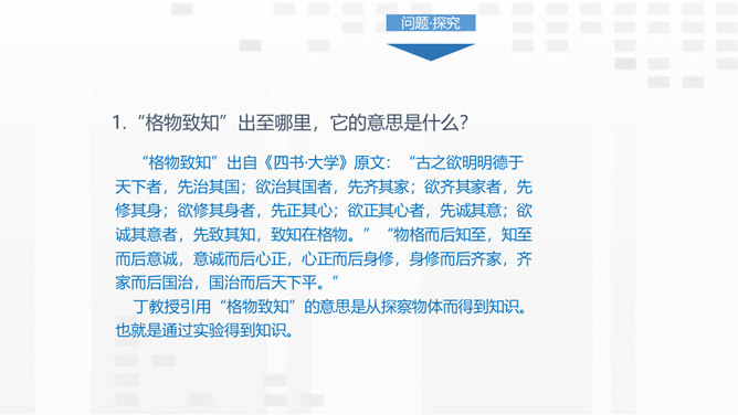 丁教授引用“格物致知”的意思是从探察物体而得到知识。也就是通过实验得到知识。传统的中国教育并不重视真正的格物和致知的原因是什么?可能是因为传统教育的目的并不是寻求新知识,而是适应一个固定的社会制度。 《大学》里讲的格物致知的目的是什么?这个目的与丁教授讲的格物致知的目的一样不一样?《大学》目的是诚意、正心、修身、齐家、治国、平天下。不一样。丁教授讲的目的是通过实验得到新知识。 第4段举王阳明“格物”失败的例子证明了什么? 王阳明的“格物”实是“格已”,而不是研究万物的道理,这是无用的。所属专题:应有格物致知精神ppt。