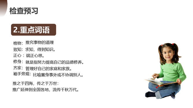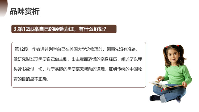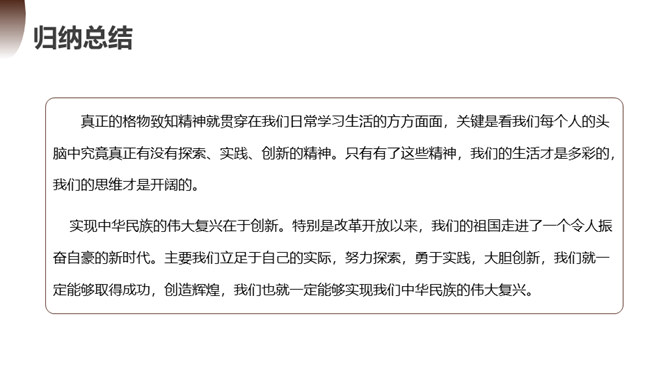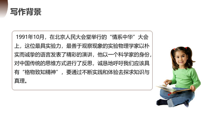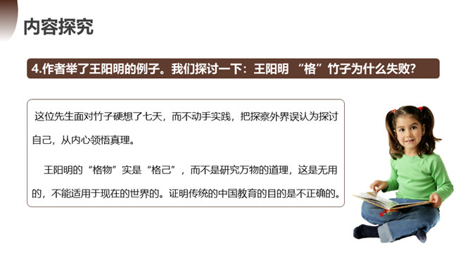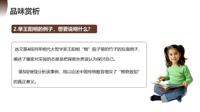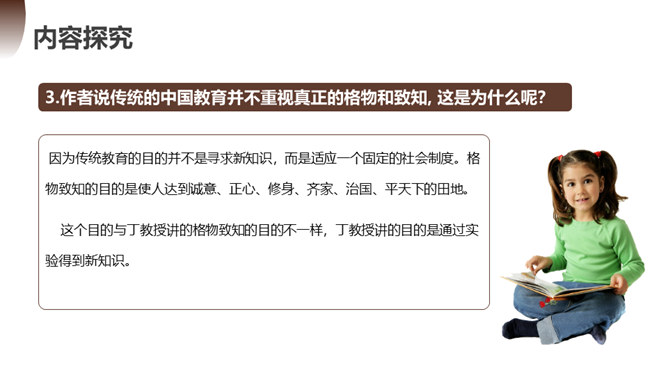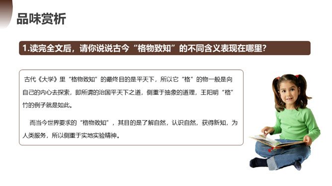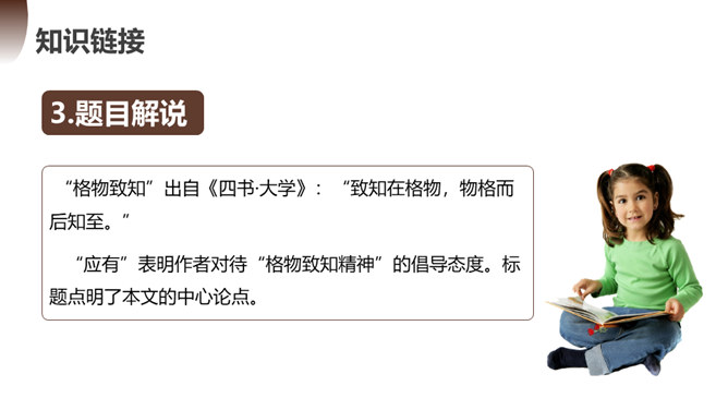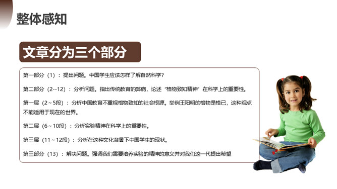 第一部分(1):提出问题。中国学生应该怎样了解自然科学?第二部分(2--12):分析问题。指出传统教育的弊病,论述“格物致知精神”在科学上的重要性。第一层(2~5段):分析中国教育不重视格物致知的社会根源。举例王阳明的格物是格已,这种观点不能适用于现在的世界。第二层(6~10段):分析实验精神在科学上的重要性。第三层(11~12段):分析在这种文化背景下中国学生的现状。第三部分(13):解决问题。强调我们需要培养实验的精神的意义并对我们这一代提出希望。所属专题:应有格物致知精神ppt。