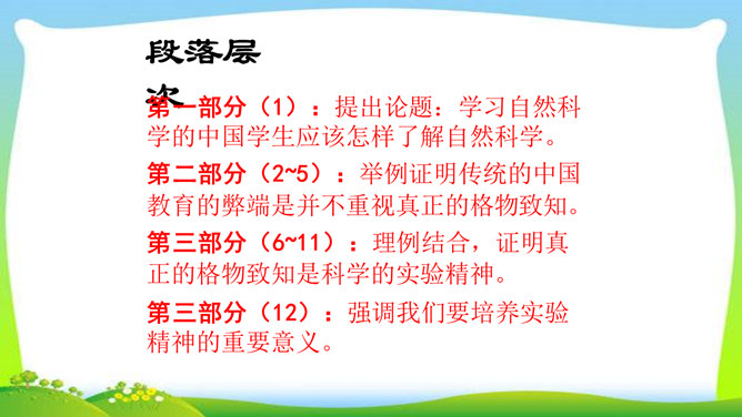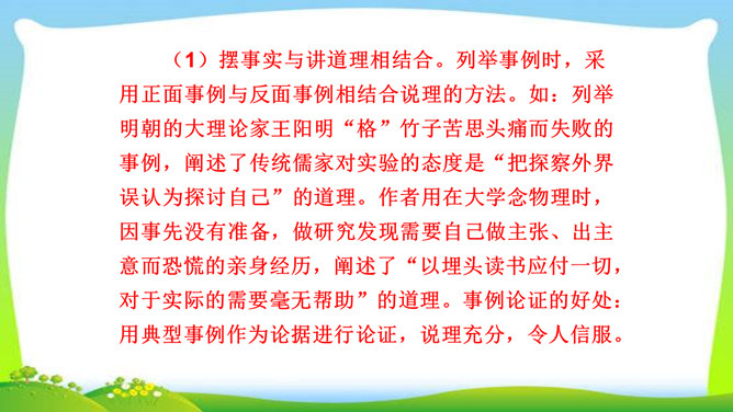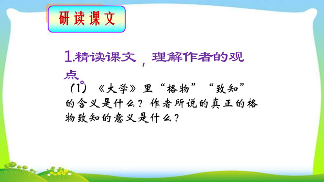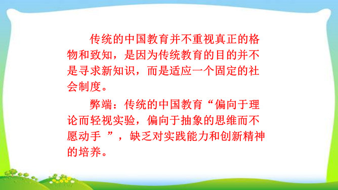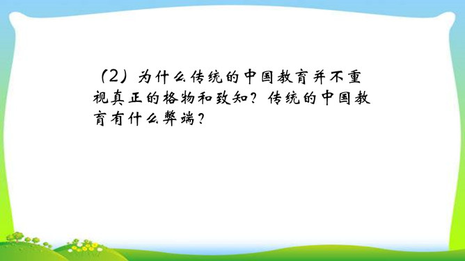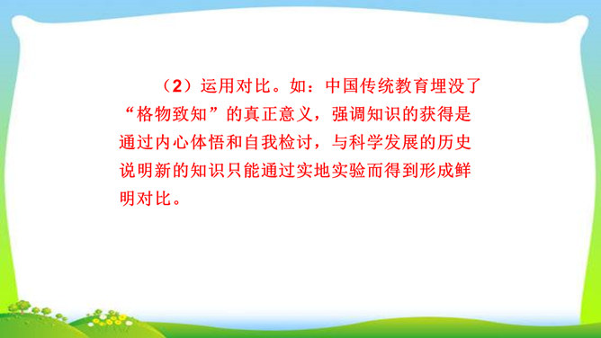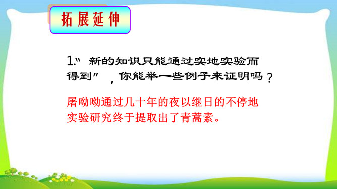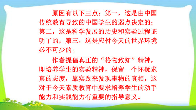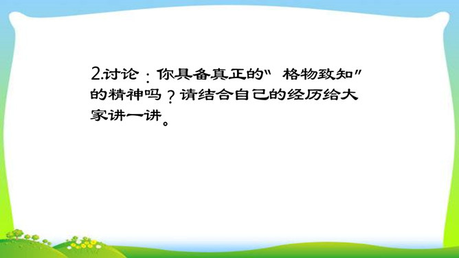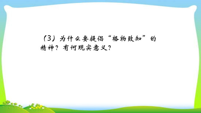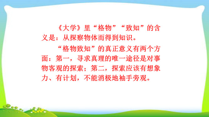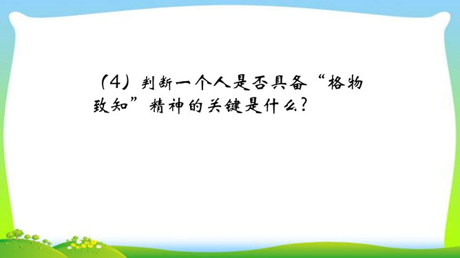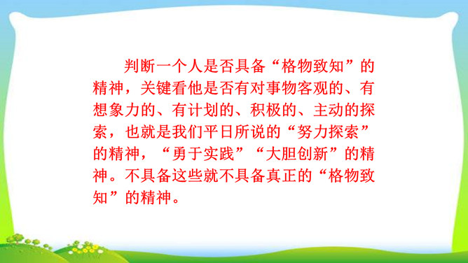 判断一个人是否具备“格物致知”的精神,关键看他是否有对事物客观的、有想象力的、有计划的、积极的、主动的探索,也就是我们平日所说的“努力探索”的精神,“勇于实践”“大胆创新”的精神。不具备这些就不具备真正的“格物致知”的精神。摆事实与讲道理相结合。列举事例时,采用正面事例与反面事例相结合说理的方法。如:列举明朝的大理论家王阳明“格”竹子苦思头痛而失败的事例,阐述了传统儒家对实验的态度是“把探察外界误认为探讨自己”的道理。“新的知识只能通过实地实验而得到”,你能举一些例子来证明吗?所属专题:应有格物致知精神ppt。