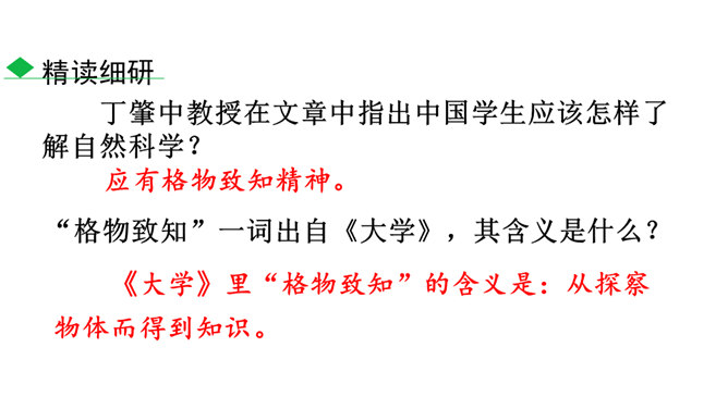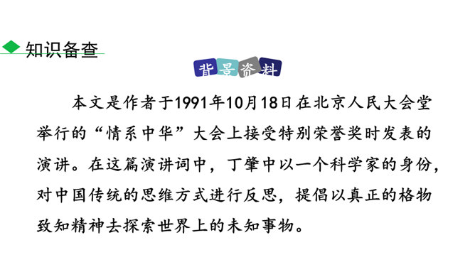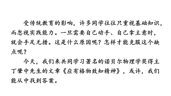 演讲者在演讲过程中举自己的亲身经验为证,有什么好处?我们一般写议论文时,不太可能举自己的经验为证,但这里的情况不太一样。一来这并不是一篇严格意义上的议论文,而是一篇演讲,演讲注重沟通、交流,用自己的经历“现身说法”,真实而亲切,有助于拉近与听众的距离,取得更好的演讲效果。二来演讲者作为一位德高望重的科学家,自己求学时代的经历对于广大青年学子来说,本身就具有很大的示范和参考意义。作者在“情系中华”征文颁奖活动中发表这样的演讲有什么现实意义?所属专题:应有格物致知精神ppt。