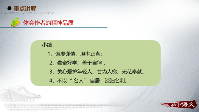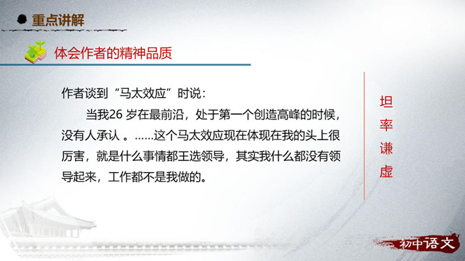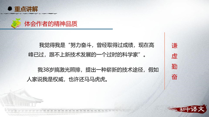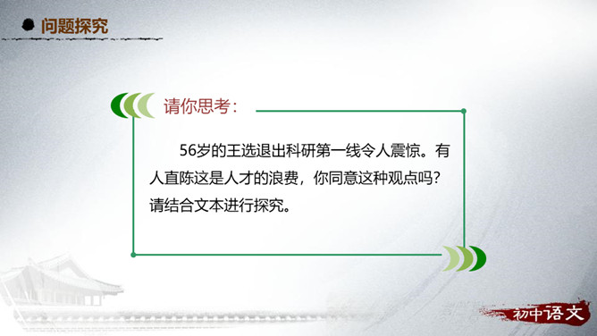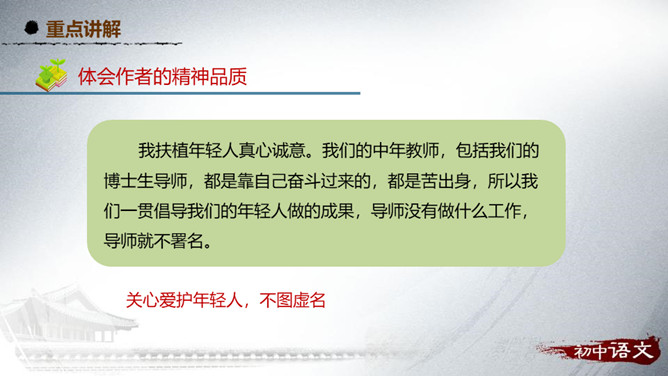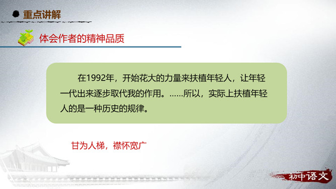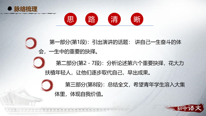 第一部分(第1段):引出演讲的话题: 讲自己一生奋斗的体会,一生中的重要的抉择。第二部分(第2-7段):分析论述第六个重要抉择,花大力扶植年轻人,让他们逐步取代自己,早出成果。第三部分(第8段):总结全文,希望青年学生溶入大集体里,体现自我价值。体会作者的精神品质,小结:1、谦虚谨慎、坦率正直;2、勤奋好学、善于自律 ;3、关心爱护年轻人、甘为人梯、无私奉献。4、不以“ 名人” 自居,淡泊名利。56岁的王选退出科研第一线令人震惊。有人直陈这是人才的浪费,你同意这种观点吗?请结合文本进行探究。所属专题:我一生中的重要抉择ppt。