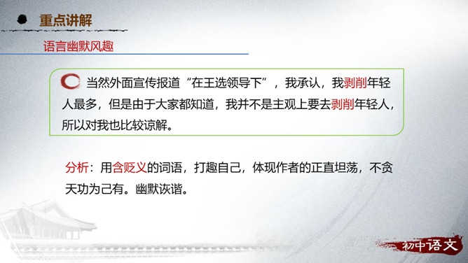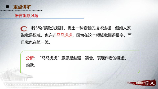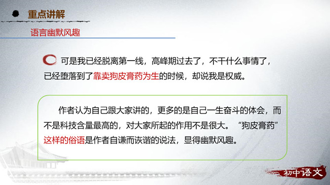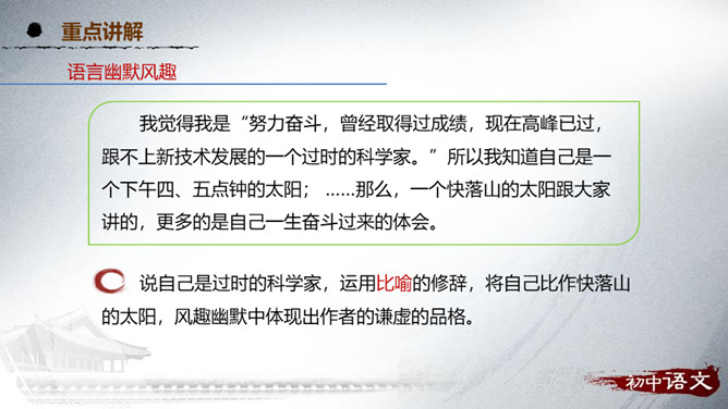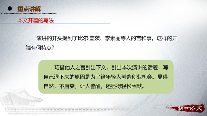 演讲的开头提到了比尔·盖茨、李素丽等人的言和事。这样的开端有何特点?巧借他人之言引出下文,引出本次演讲的话题,写自己退下来的原因是为了给年轻人创造创业机会。显得自然,不唐突,让人警醒,还显得轻松幽默。说自己是过时的科学家,运用比喻的修辞,将自己比作快落山的太阳,风趣幽默中体现出作者的谦虚的品格。不可设想”意思是事情的结果不能想象,指向很坏、很危险的方向发展。这里指发展迅速的新技术,尤其是计算机技术需要不断创新,需要富有创造力的年轻人。也幽默含蓄地体现出王选大力扶植年轻人的想法。所属专题:我一生中的重要抉择ppt。