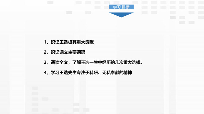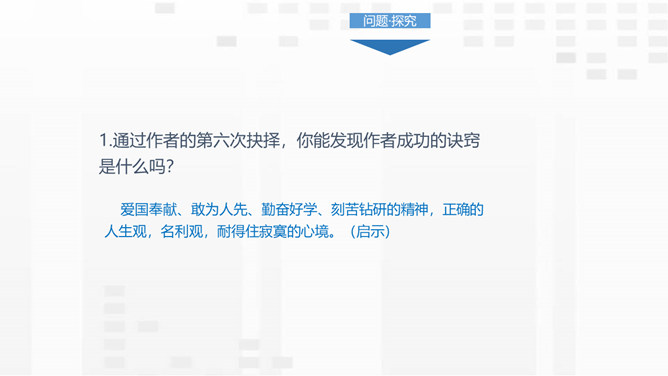 通过作者的第六次抉择,你能发现作者成功的诀窍是什么吗?爱国奉献、敢为人先、勤奋好学、刻苦钻研的精神,正确的人生观,名利观,耐得住寂寞的心境。课文逻辑严密是如何体现的?举国内成功人士和国外卡文迪许实验室是为了证明大力扶植年轻人这一观点是正确可行的。并且前一次抉择是后面抉择的基础;后面的抉择是前面抉择的必然结果,并验证了前面抉择的正确与明智。 透过王选的这些抉择,我们可以清晰地看到他的崇高品质:爱国是他忘我工作的感情基石;善于把握机遇,勇于创造机遇是他事业成功的关键。所属专题:我一生中的重要抉择ppt。
