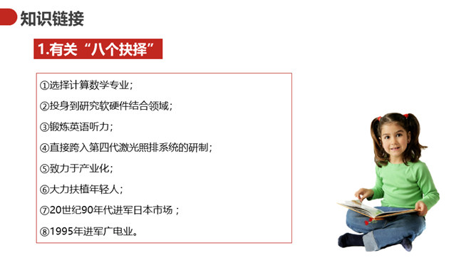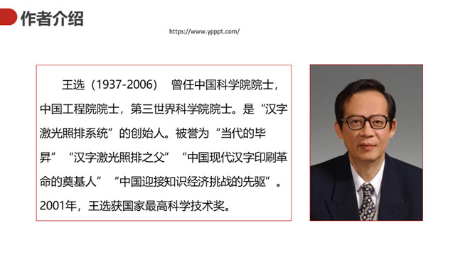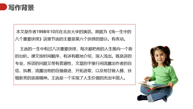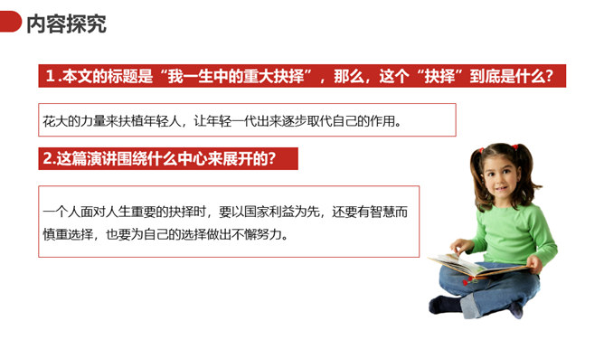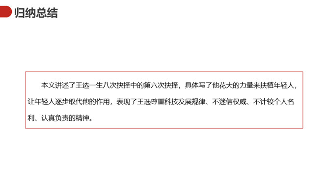 王选的一生中有过八次重要抉择,每次都把他的人生推向一个新的台阶。课文按时间顺序,有详有略地介绍,深入浅出。既是讲的专业,所谈的问题又带有普遍性,文章的字里行间流露出作者的自信、执着,流露出他的自强奋进、开拓进取,以及他甘做人梯,扶植新秀的崇高精神。王选是一个实现了人生价值的杰出中国人。本文的标题是“我一生中的重大抉择”,那么,这个“抉择”到底是什么?花大的力量来扶植年轻人,让年轻一代出来逐步取代自己的作用。这篇演讲围绕什么中心来展开的?所属专题:我一生中的重要抉择ppt。