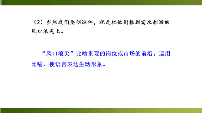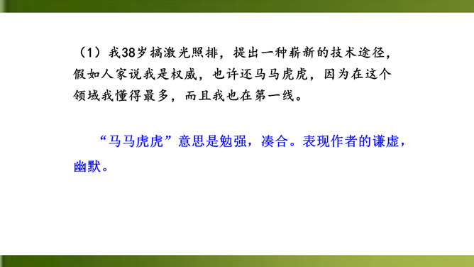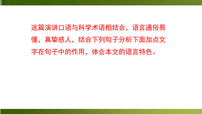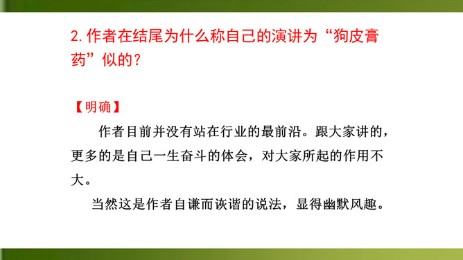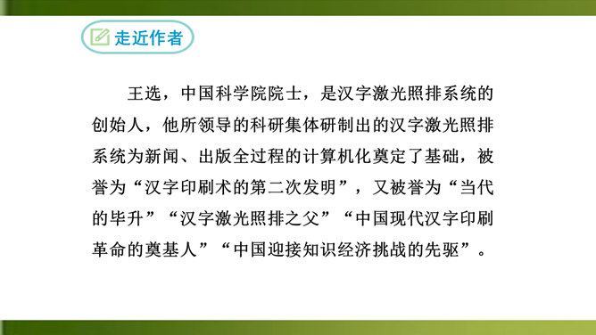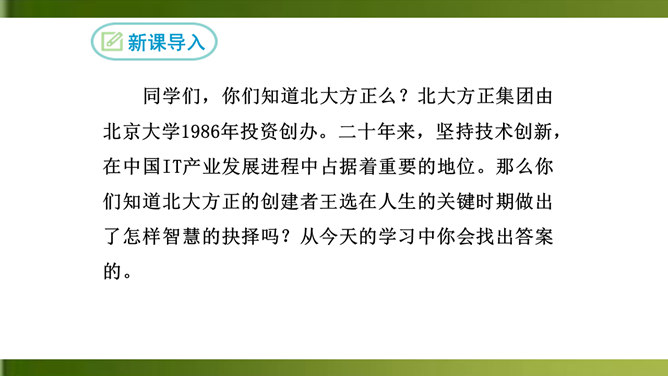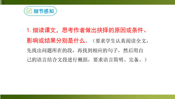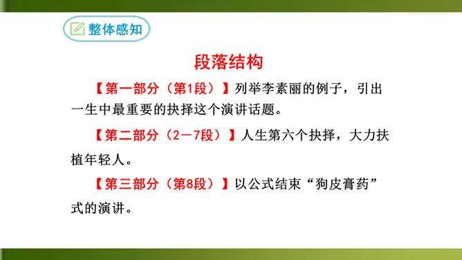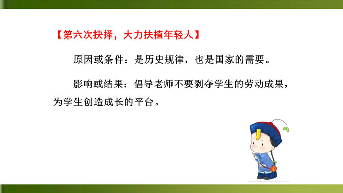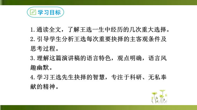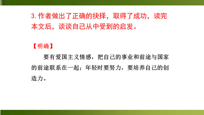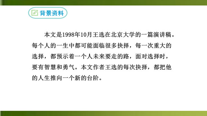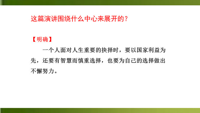 这篇演讲围绕什么中心来展开的?一个人面对人生重要的抉择时,要以国家利益为先,还要有智慧而慎重选择,也要为自己的选择做出不懈努力。细读课文,思考作者做出抉择的原因或条件、影响或结果分别是什么。(要求学生认真阅读全文,先找出问题所在的段,再找到相应的句子,然后用自己的语言结合文段进行概括,要求语言简明、完备。)第六次抉择,大力扶植年轻人。原因或条件:是历史规律,也是国家的需要。影响或结果:倡导老师不要剥夺学生的劳动成果,为学生创造成长的平台。所属专题:我一生中的重要抉择ppt。