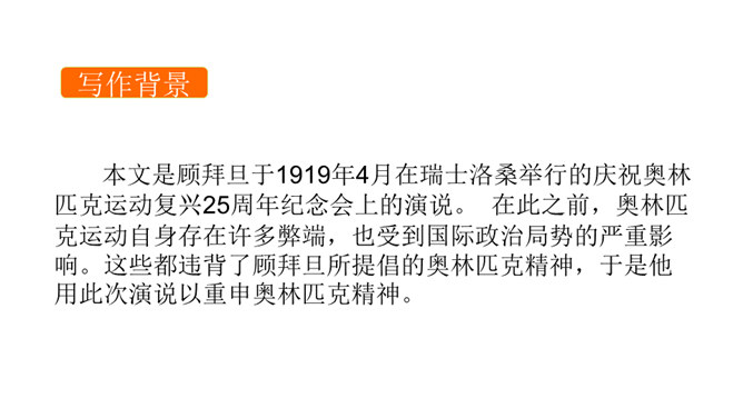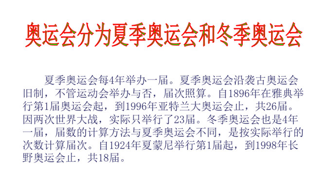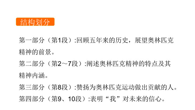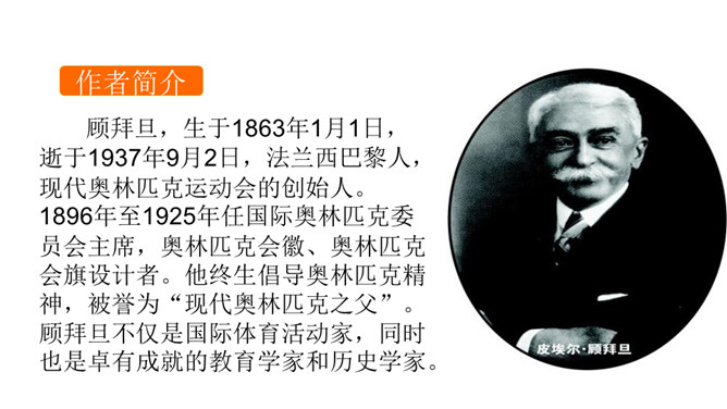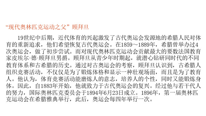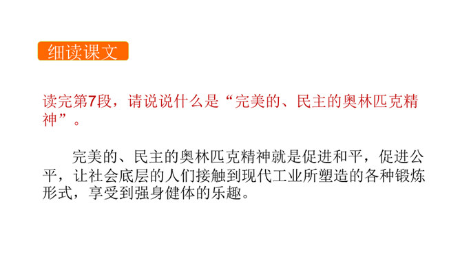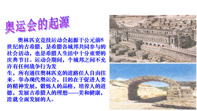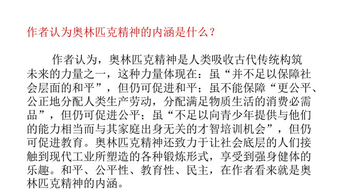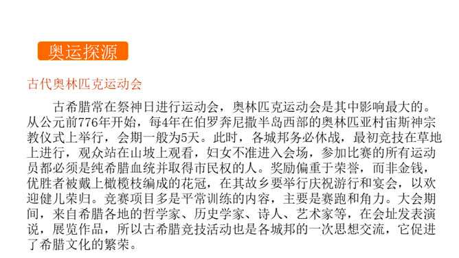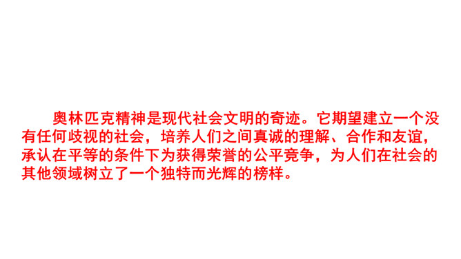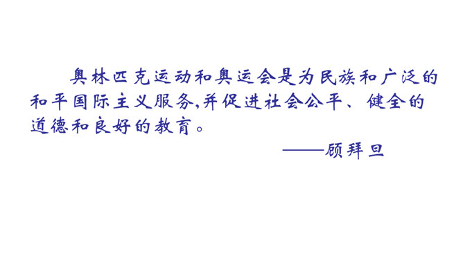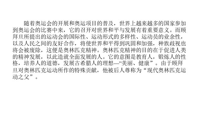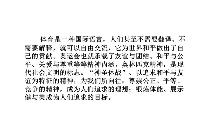 奥林匹克精神是现代社会文明的奇迹。它期望建立一个没有任何歧视的社会,培养人们之间真诚的理解、合作和友谊,承认在平等的条件下为获得荣誉的公平竞争,为人们在社会的其他领域树立了一个独特而光辉的榜样。体育是一种国际语言,人们甚至不需要翻译、不需要解释,就可以自由交流,它为世界和平做出了自己的贡献。奥运会也就承载了友谊与团结、和平与公平、关爱与尊重等等精神内涵,奥林匹克精神,是现代社会文明的标志。“神圣休战”、以追求和平与友谊为特征的精神,为我们所向往;尊崇公正、平等、竞争的精神,成为人们追求的理想。所属专题:庆祝奥林匹克运动复兴25周年ppt。