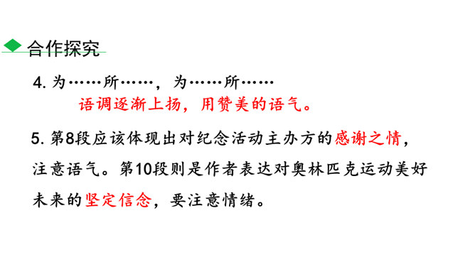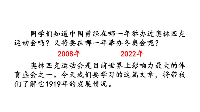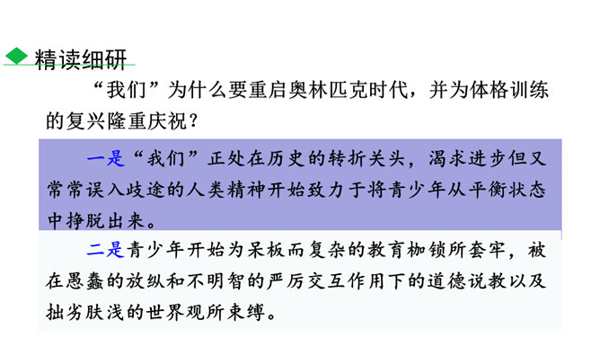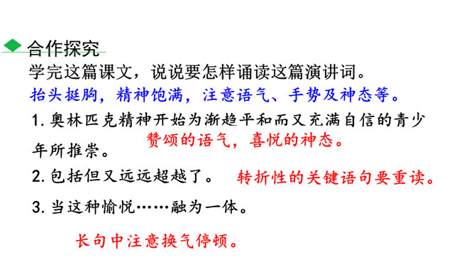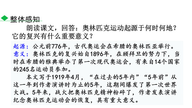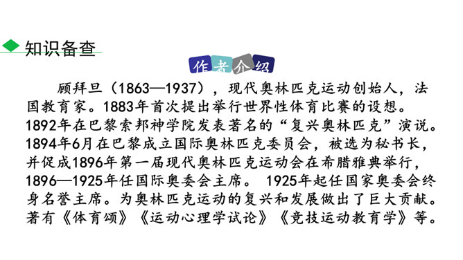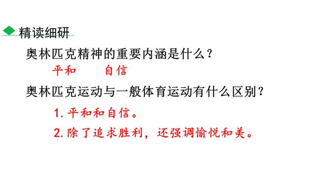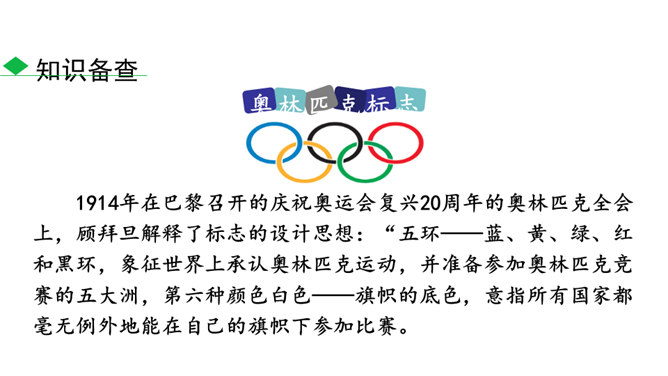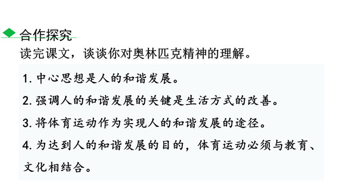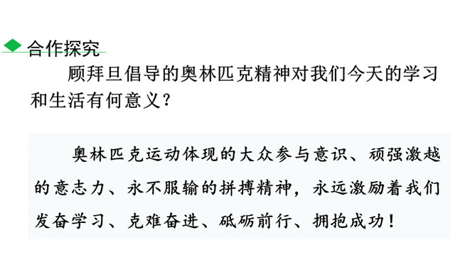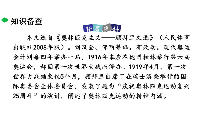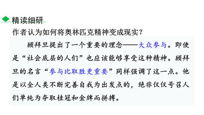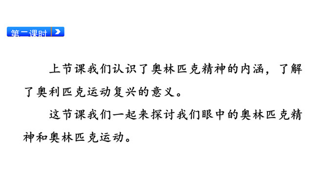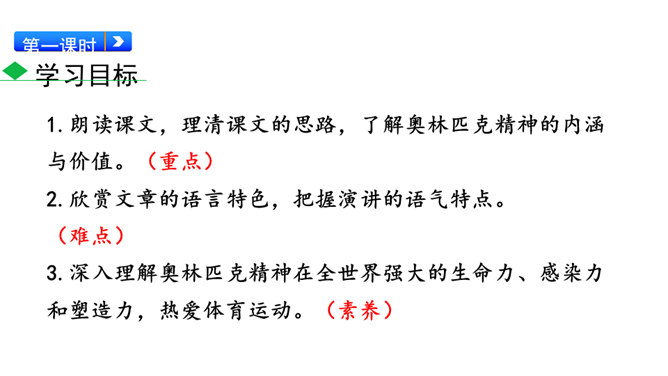 1.朗读课文,理清课文的思路,了解奥林匹克精神的内涵与价值。(重点)2.欣赏文章的语言特色,把握演讲的语气特点。(难点)3.深入理解奥林匹克精神在全世界强大的生命力、感染力和塑造力,热爱体育运动。(素养)作者认为如何将奥林匹克精神变成现实?顾拜旦提出了一个重要的理念——大众参与。即使是“社会底层的人们”也应该能够享受这种精神。顾拜旦的名言“参与比取胜更重要”同样强调了这一点。他是以全人类不断完善自我为出发点的,绝非仅仅号召人们单纯为夺取桂冠和金牌而拼搏。所属专题:庆祝奥林匹克运动复兴25周年ppt。