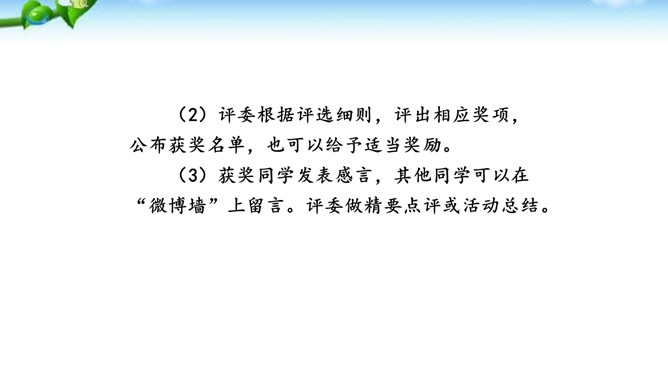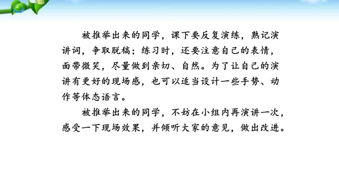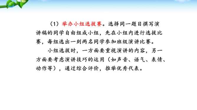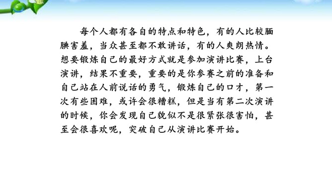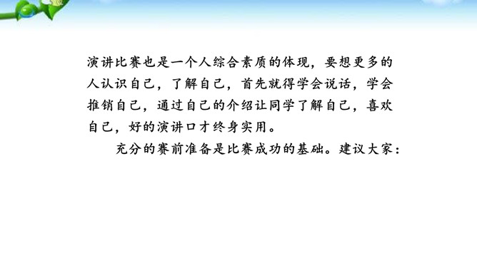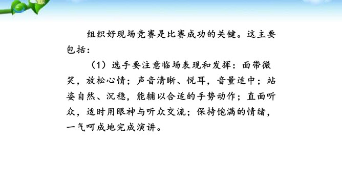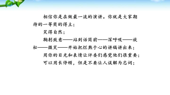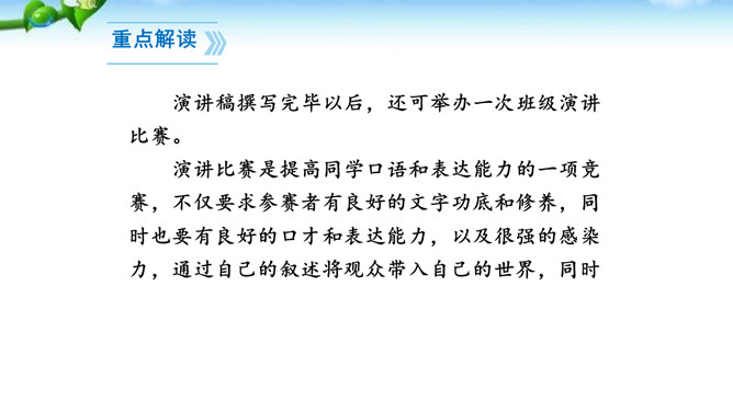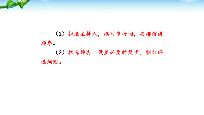 1.理解命题演讲的概念,知晓演讲和朗诵的区别,努力提高阅读、理解、鉴赏的能力。2.探究演讲的表达技巧,能从声音、情感、表情、动作等方面来予以个性化的展现,进一步提升表达、交流、竞争的能力。3.能围绕选定的主题进行演讲,心态良好,自尊自信,陶冶情操,树立正确、高尚的人生观。演讲稿撰写完毕以后,还可举办一次班级演讲比赛。演讲比赛是提高同学口语和表达能力的一项竞赛,不仅要求参赛者有良好的文字功底和修养,同时也要有良好的口才和表达能力,以及很强的感染力,通过自己的叙述将观众带入自己的世界。所属专题:举办演讲比赛ppt。