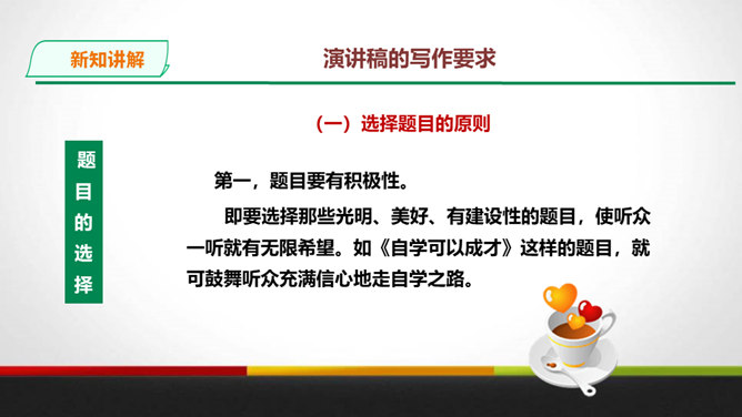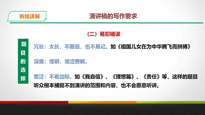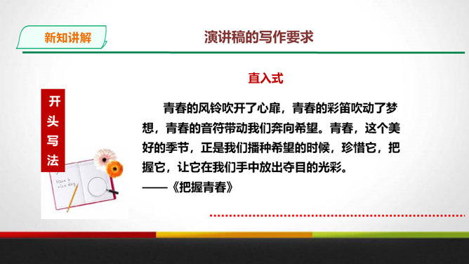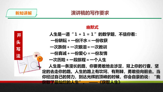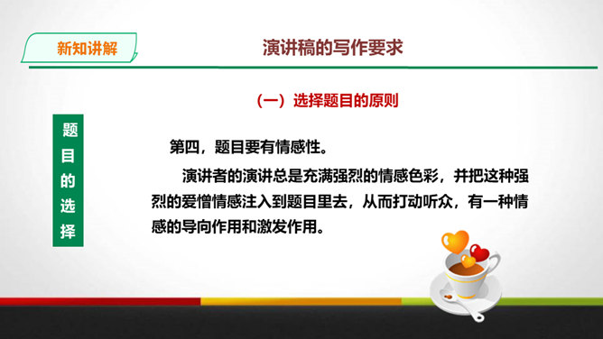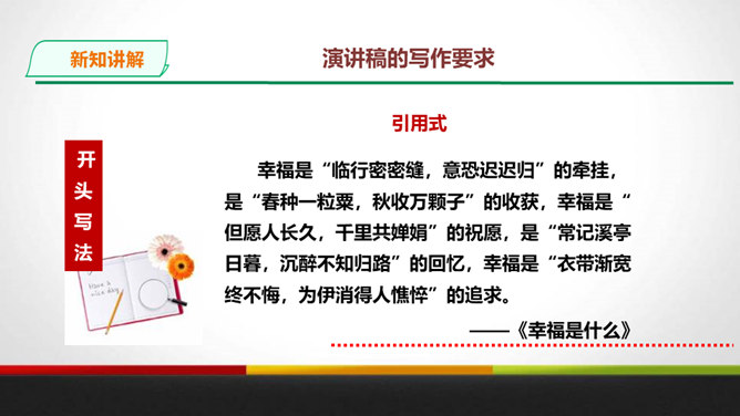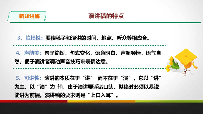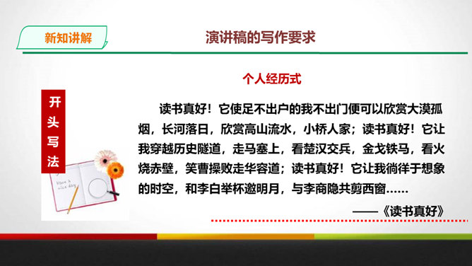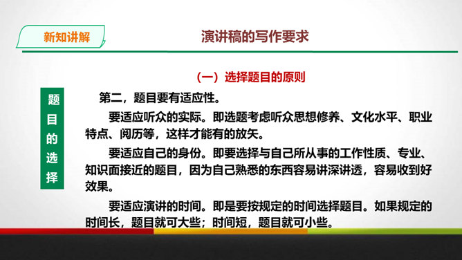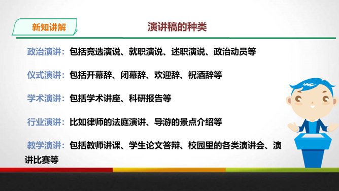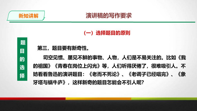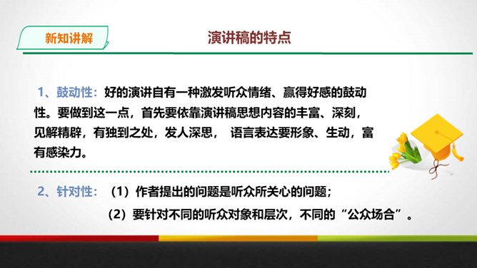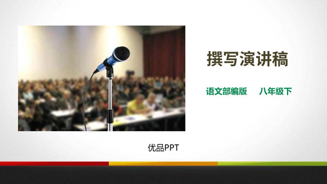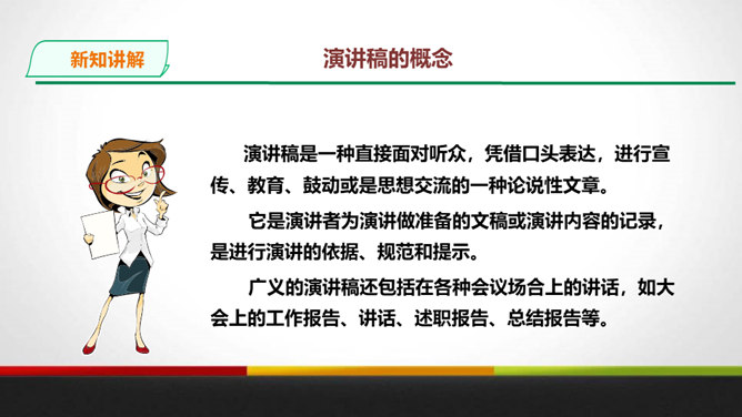 演讲稿是一种直接面对听众,凭借口头表达,进行宣传、教育、鼓动或是思想交流的一种论说性文章。 它是演讲者为演讲做准备的文稿或演讲内容的记录,是进行演讲的依据、规范和提示。 广义的演讲稿还包括在各种会议场合上的讲话,如大会上的工作报告、讲话、述职报告、总结报告等。演讲稿的特点。鼓动性:好的演讲自有一种激发听众情绪、赢得好感的鼓动性。要做到这一点,首先要依靠演讲稿思想内容的丰富、深刻,见解精辟,有独到之处,发人深思, 语言表达要形象、生动,富有感染力。所属专题:撰写演讲稿ppt。