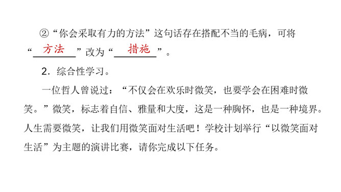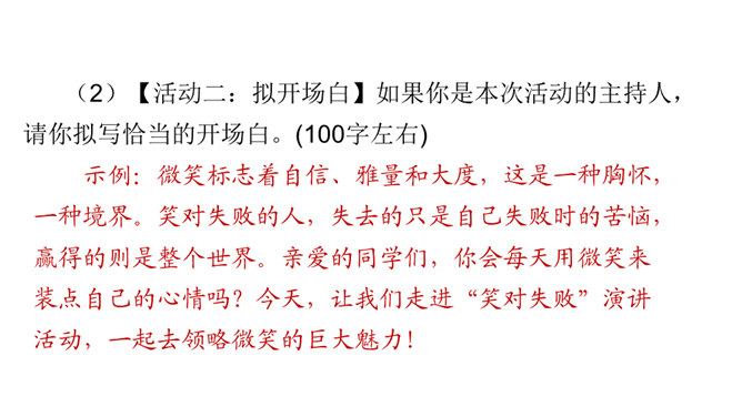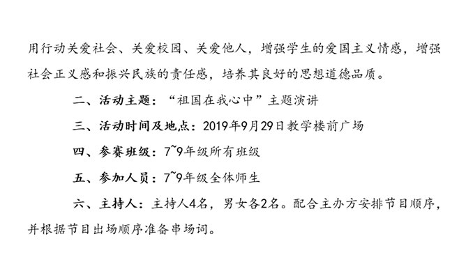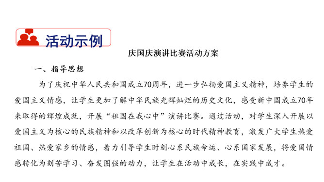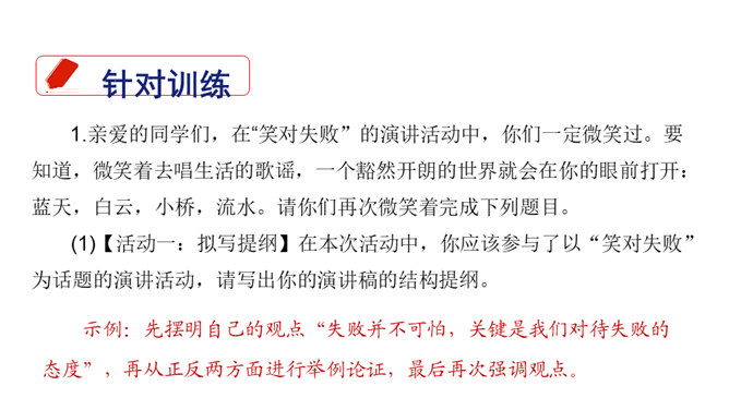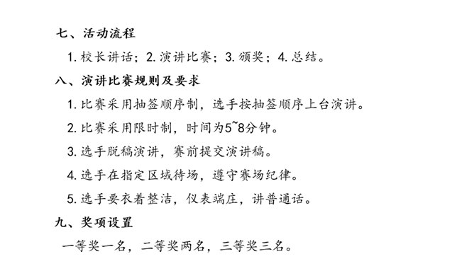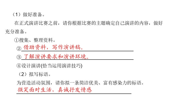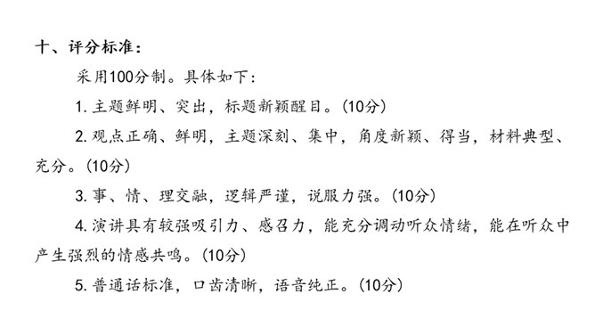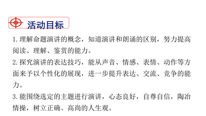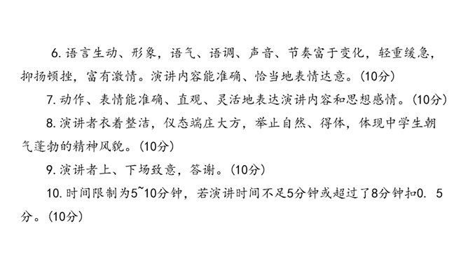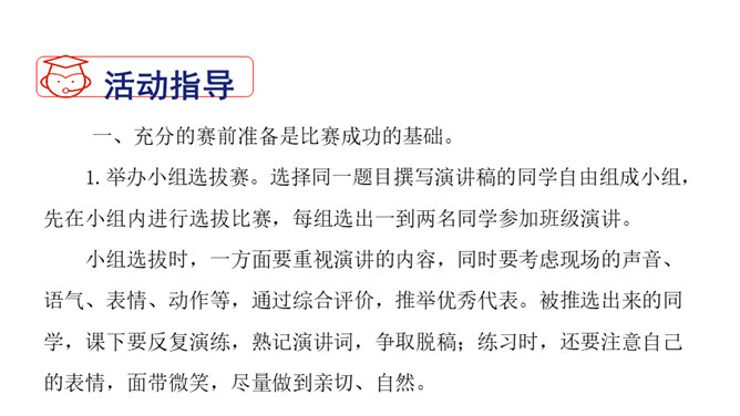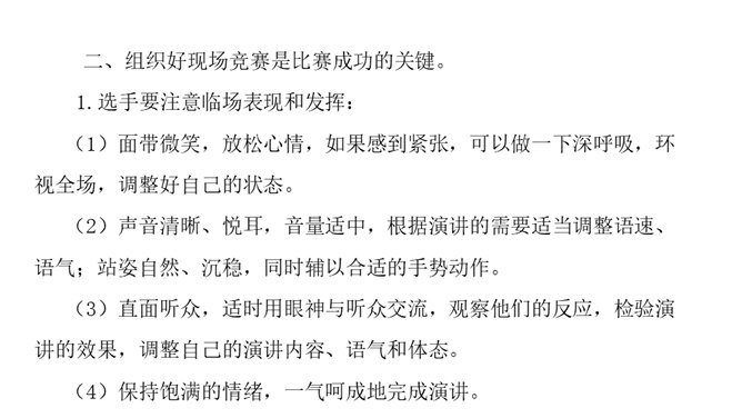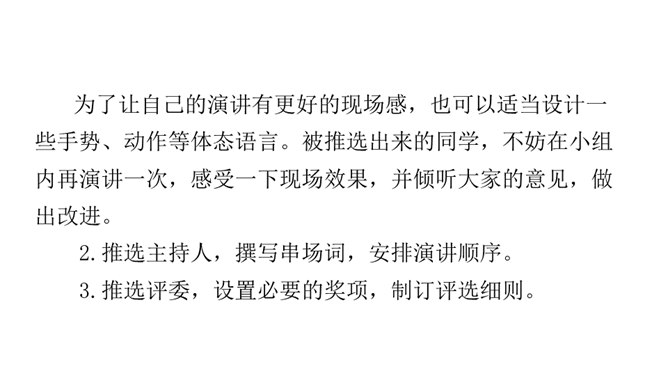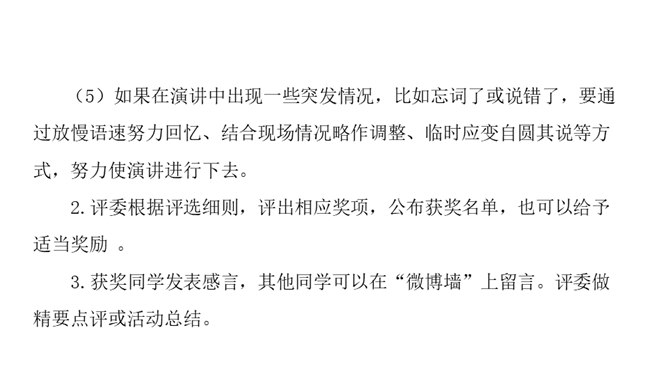 充分的赛前准备是比赛成功的基础。举办小组选拔赛。选择同一题目撰写演讲稿的同学自由组成小组,先在小组内进行选拔比赛,每组选出一到两名同学参加班级演讲。小组选拔时,一方面要重视演讲的内容,同时要考虑现场的声音、语气、表情、动作等,通过综合评价,推举优秀代表。被推选出来的同学,课下要反复演练,熟记演讲词,争取脱稿;练习时,还要注意自己的表情,面带微笑,尽量做到亲切、自然。为了让自己的演讲有更好的现场感,也可以适当设计一些手势、动作等体态语言。所属专题:举办演讲比赛ppt。