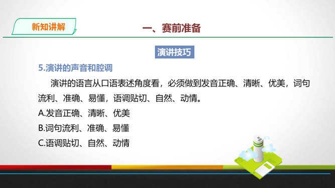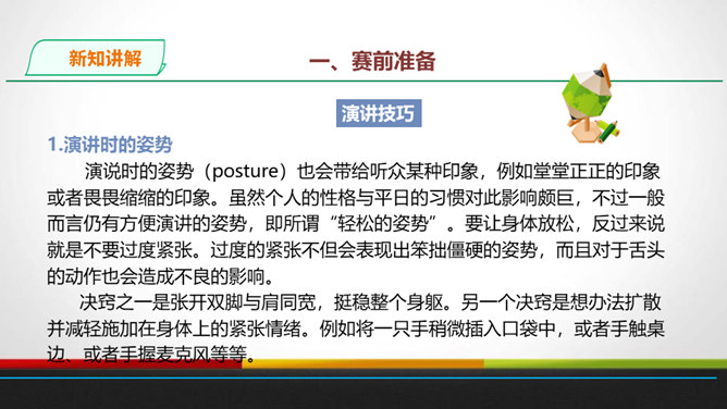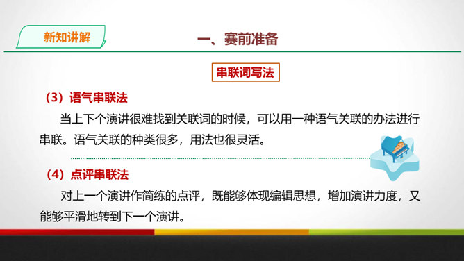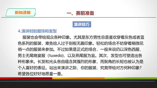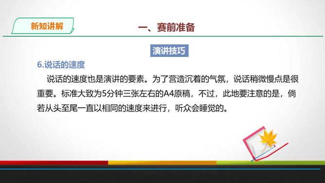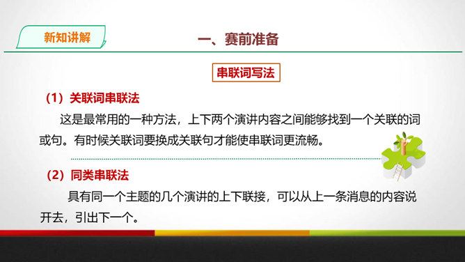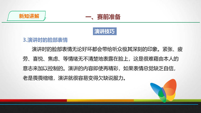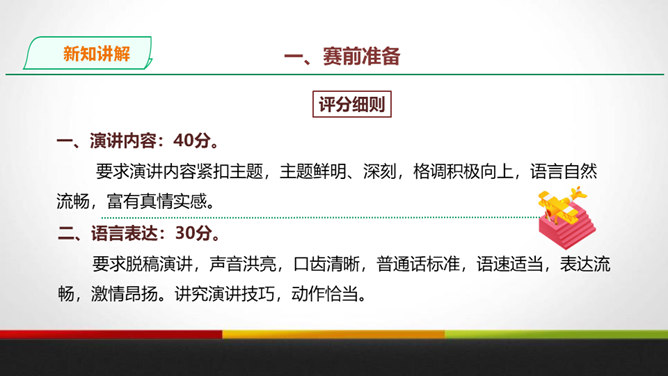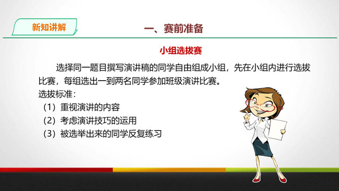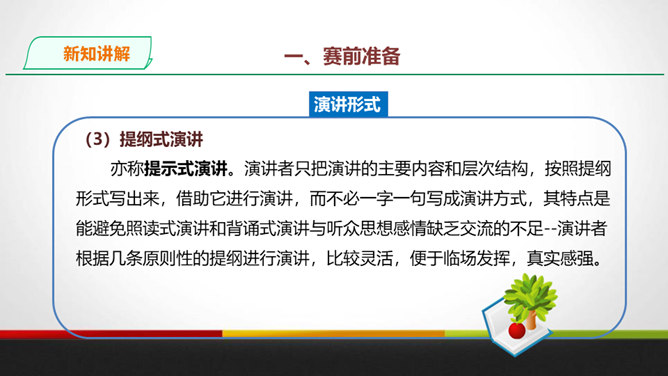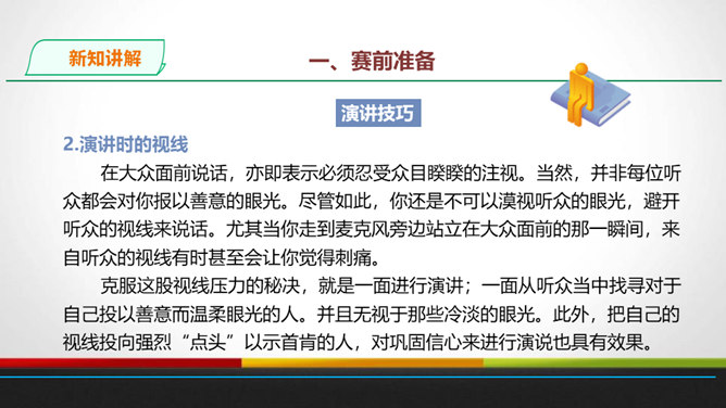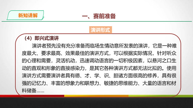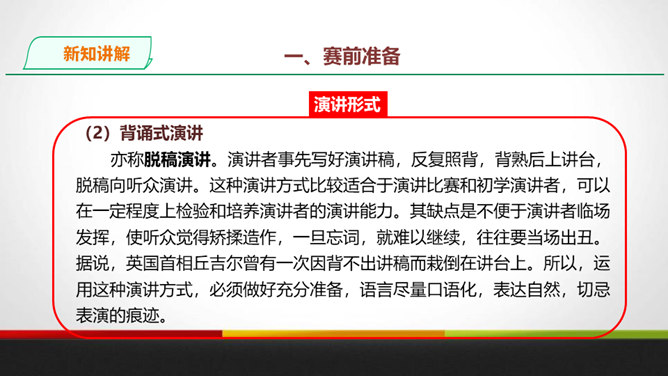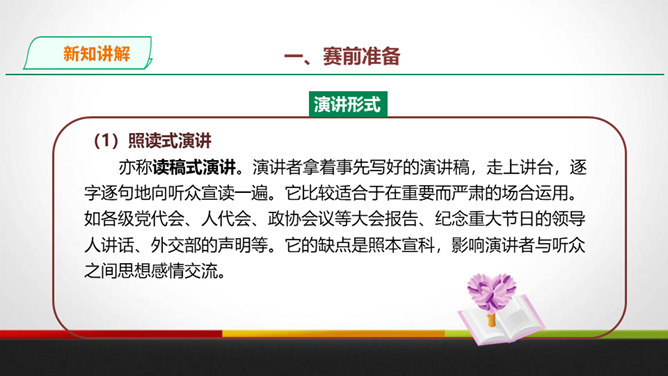 (1)照读式演讲。亦称读稿式演讲。演讲者拿着事先写好的演讲稿,走上讲台,逐字逐句地向听众宣读一遍。它比较适合于在重要而严肃的场合运用。如各级党代会、人代会、政协会议等大会报告、纪念重大节日的领导人讲话、外交部的声明等。它的缺点是照本宣科,影响演讲者与听众之间思想感情交流。(2)背诵式演讲。亦称脱稿演讲。演讲者事先写好演讲稿,反复照背,背熟后上讲台,脱稿向听众演讲。这种演讲方式比较适合于演讲比赛和初学演讲者,可以在一定程度上检验和培养演讲者的演讲能力。所属专题:举办演讲比赛ppt。