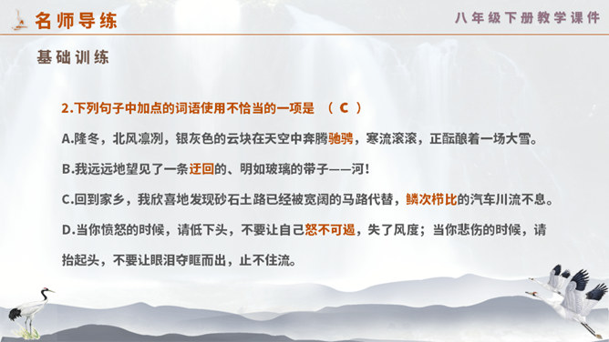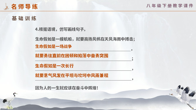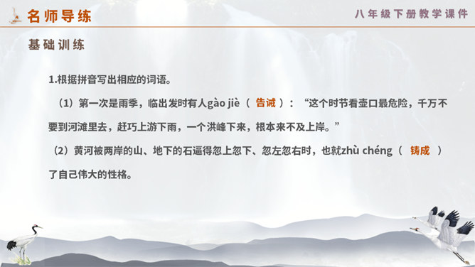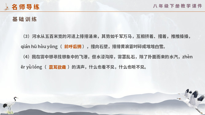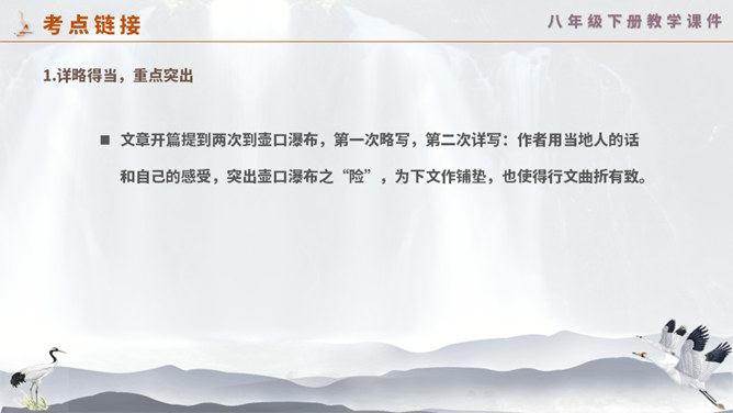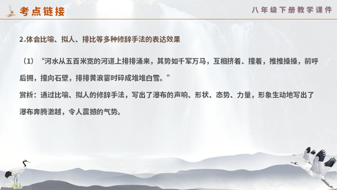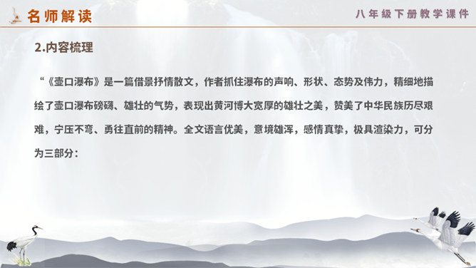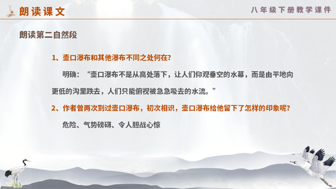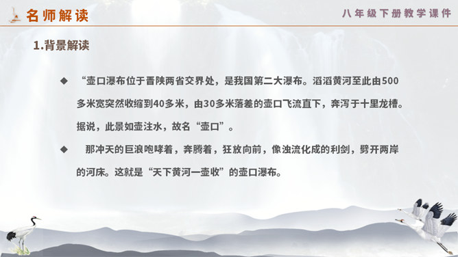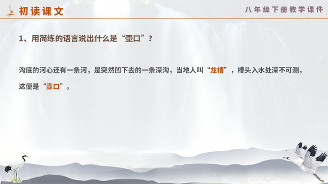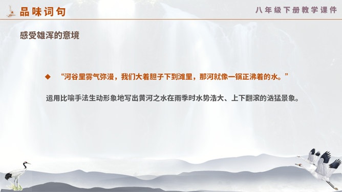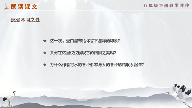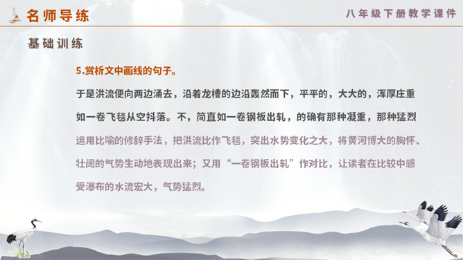 这一次,壶口瀑布给你留下怎样的印象? 黄河在这里仅仅展现它的阳刚之美吗? 为什么作者将水的各种形态与人的各种感情联系起来?运用比喻手法生动形象地写出黄河之水在雨季时水势浩大、上下翻滚的汹猛景象。运用比喻的修辞手法,把洪流比作飞毯,突出水势变化之大,将黄河博大的胸怀、壮阔的气势生动地表现出来;又用“一卷钢板出轧”作对比,让读者在比较中感受瀑布的水流宏大,气势猛烈。怎样理解文章最后一个自然段?借对黄河的赞美,表达出对中华民族百折不挠、勇往直前精神的歌颂。所属专题:壶口瀑布ppt。