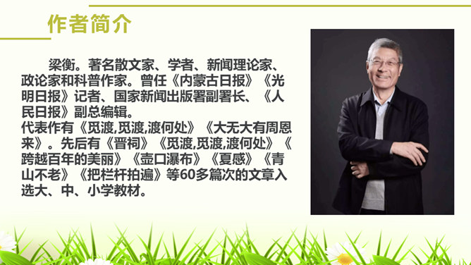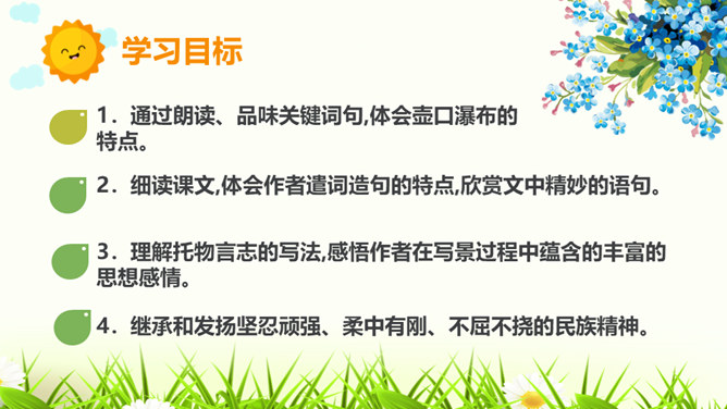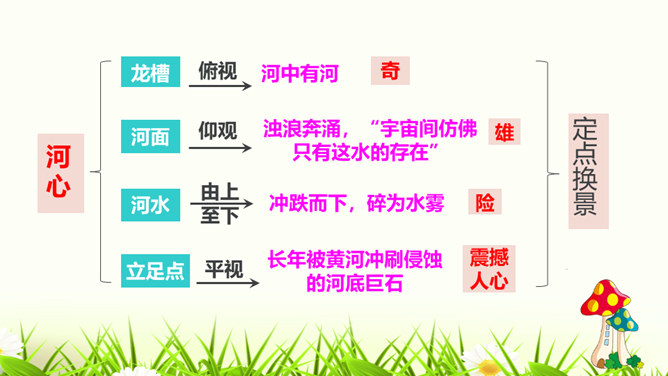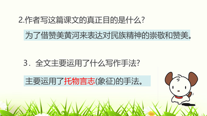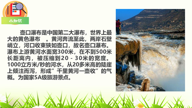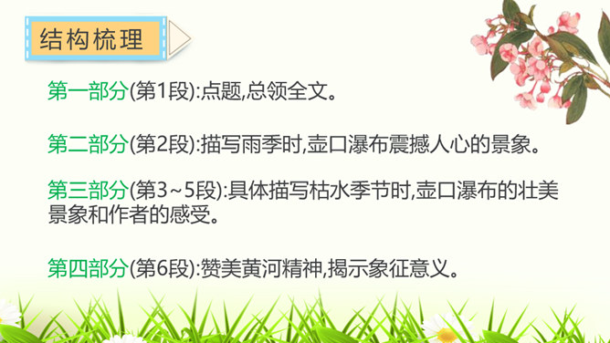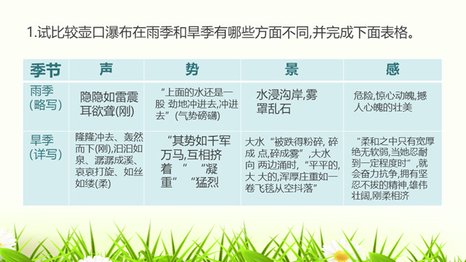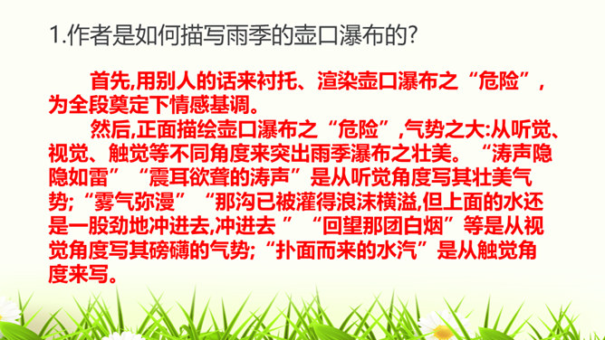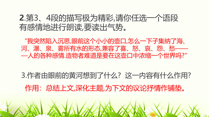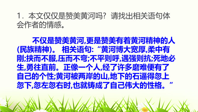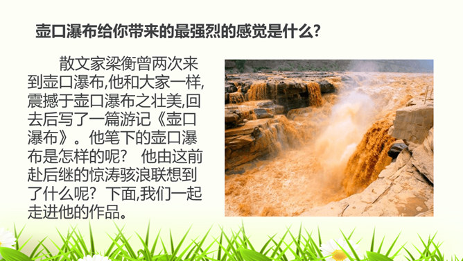 请试着赏析文章最后一段中的首句。该句运用排比、拟人的修辞手法,并将议论与抒情的表达方式相结合,以借物喻人、借景抒情的手法,表现了黄河水宽厚的雄壮之美,前仆后继、勇往直前的精神。抒发了对自然的热爱,对中华民族百折不挠、勇往直前的精神的赞美之情。作者为什么要描写脚下的石头?坚硬的石头有的被水凿得千疮百孔,有的被水齐齐切下去,柔弱的水却能切断石头,可见“这柔和之中只有宽厚绝无软弱,当她忍耐到一定程度时就会以力相较,奋力抗争”。作者描写石头,是为了反衬黄河水柔中有刚、坚忍不拔、奋力抗争的性格。所属专题:壶口瀑布ppt。