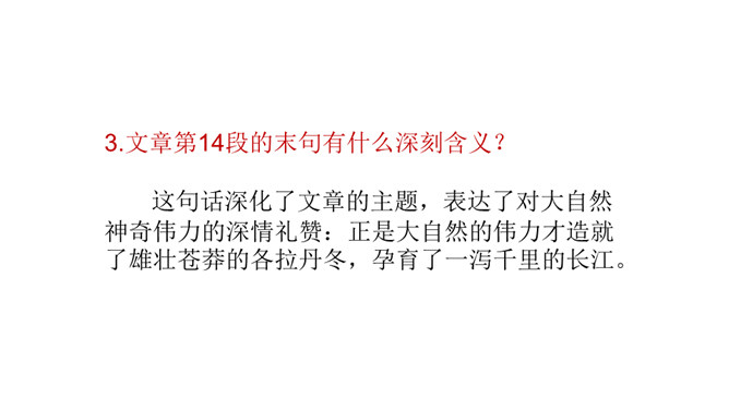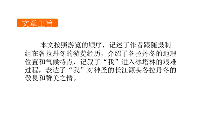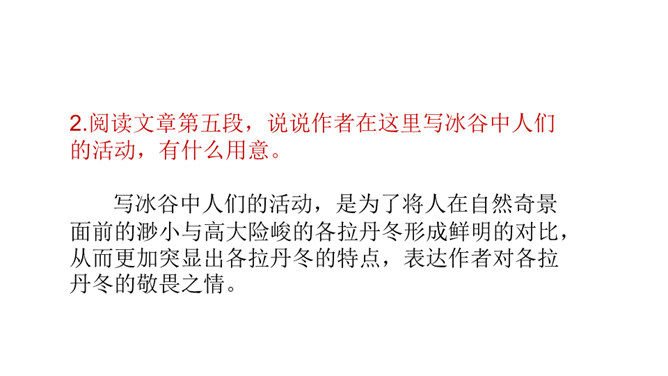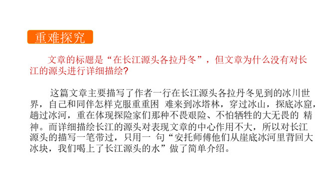 为什么文章开头要写近些年来骤然掀起的一股长江考察热?文章开头交代了近些年来骤然掀起了一股长江考察热,许多探险健儿为了找长江源头,不畏艰险,有人甚至为此献出了自己的生命,但探险家对探险事业的执着与追求一直未停。这正是作者在表明自己的决心,说明她也做好了准备,随时准备为探险事业献出自己的一切。阅读文章第五段,说说作者在这里写冰谷中人们的活动,有什么用意。写冰谷中人们的活动,是为了将人在自然奇景面前的渺小与高大险峻的各拉丹冬形成鲜明的对比,从而更加突显出各拉丹冬的特点,表达作者对各拉丹冬的敬畏之情。所属专题:在长江源头各拉丹冬ppt。