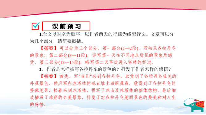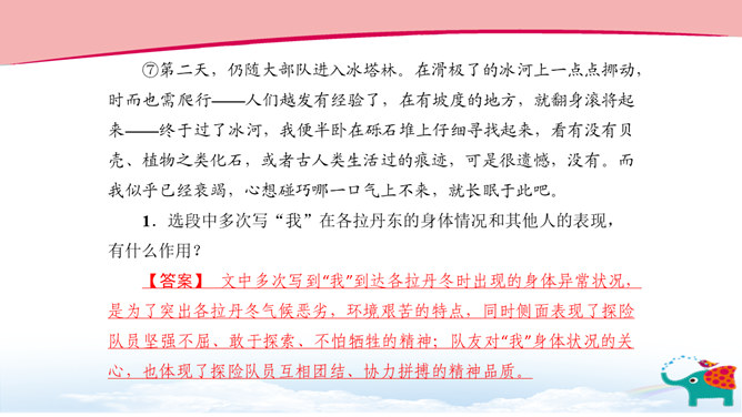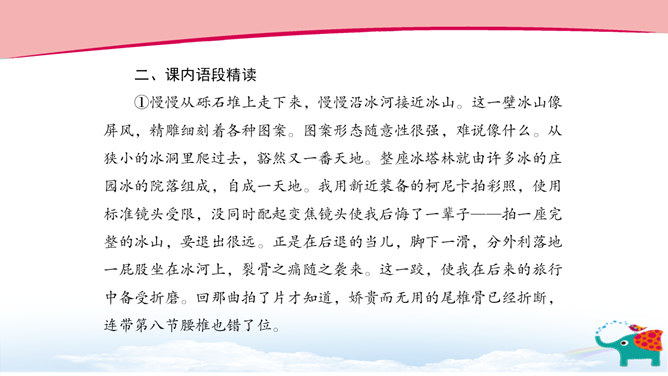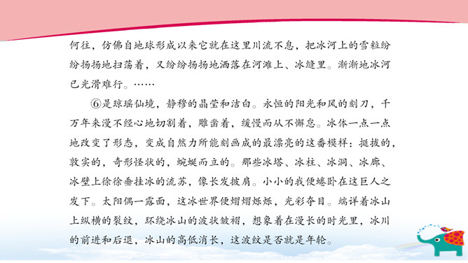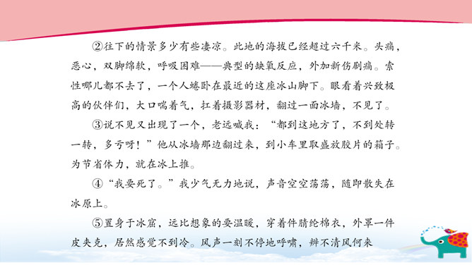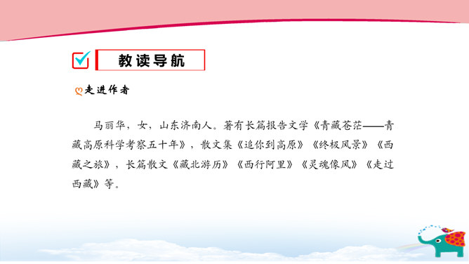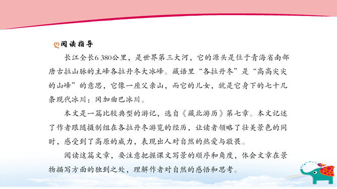 长江全长6 380公里,是世界第三大河,它的源头是位于青海省南部唐古拉山脉的主峰各拉丹冬大冰峰。藏语里“各拉丹冬”是“高高尖尖的山峰”的意思,它像一座父亲山,而它的儿女,就是它身下的七十几条现代冰川:冈加曲巴冰川。本文是一篇比较典型的游记,选自《藏北游历》第七章。本文记述了作者跟随摄制组在各拉丹冬游览的经历,让读者领略了壮美景色的同时,感受到了高原的威力,表现出人对自然的热爱与敬畏。阅读这篇文章,要注意把握课文写景的顺序和角度,体会文章在景物描写方面的独到之处,理解作者对自然的感悟和思考。所属专题:在长江源头各拉丹冬ppt。