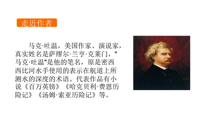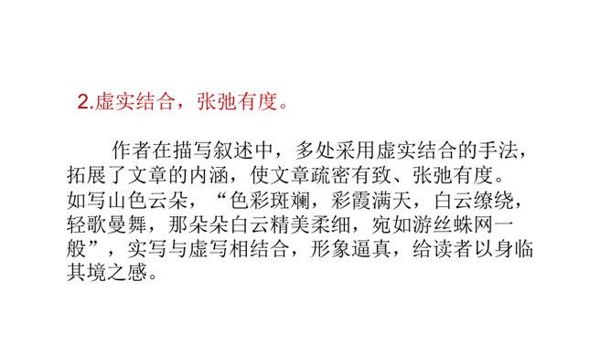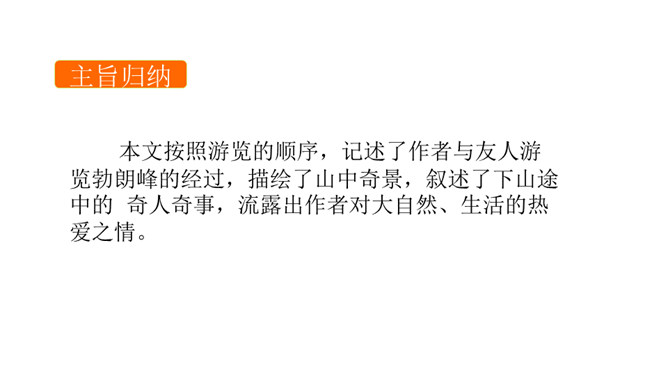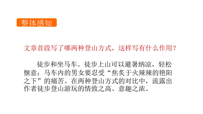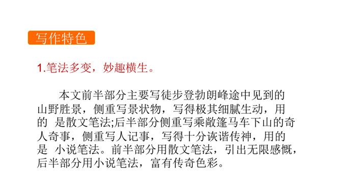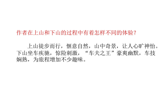 课文是一篇游记散文,字里行间也体现了作者诙谐幽默的语言风格,请结合相关语句加以分析。作者是语言大师,文中多处体现了作者诙谐幽默的语言风格,给文章增添了不一样的情趣之美。 如首段中“既然花了钱坐车,就一定要使他们的旅行物有所值”一句,调侃坐车人忍受炙烤的痛苦,而徒 步登山则有避暑纳凉、欣赏山景的惬意,在调侃中,流露出作者的诙谐幽默之感。再如,下山时既写颠 簸之苦、不测之险,又写意外之喜,尤其是通过对车夫的神态、动作、语言的描写,表现其豪爽的性格、娴 熟的车技,读来让读者忍俊不禁。所属专题:登勃朗峰ppt。