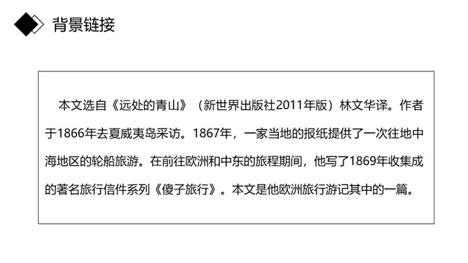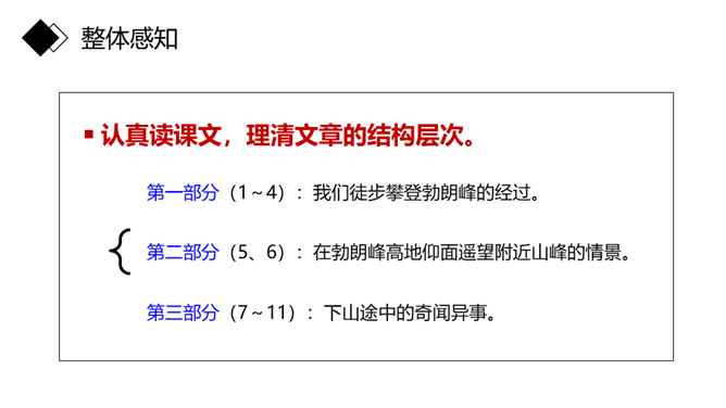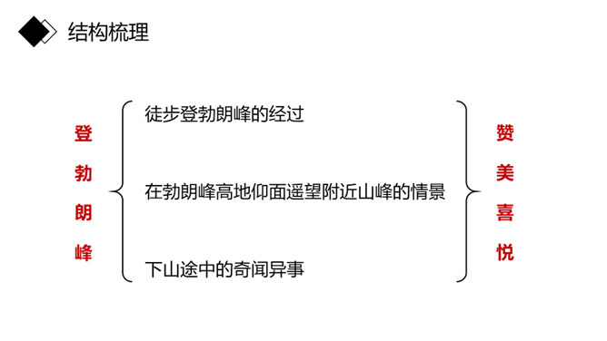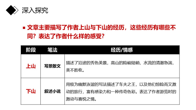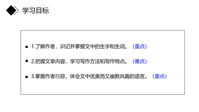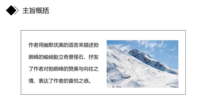 1.了解作者,识记并掌握文中的生字和生词。(重点)2.把握文章内容,学习写作方法和写作特点。(难点)3.掌握作者行踪,体会文中优美而又幽默风趣的语言。(重点)文章主要描写了作者上山与下山的经历,这些经历有哪些不同?表达了作者什么样的感受?上山:描述了沿途的秀色美景,高山的险峻陡峭,水流的清澈急湍,美不胜收。下山:用极为幽默诙谐的写法描述了车夫之王,以及他们惊险而又激动的旅行,富有感染力和一种传奇色彩。表达了作者游览时的激动与喜悦之情。所属专题:登勃朗峰ppt。