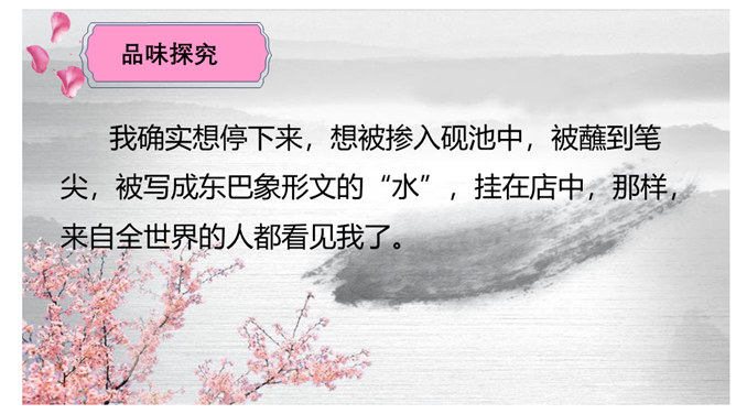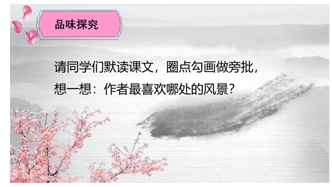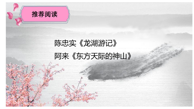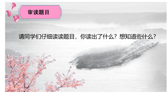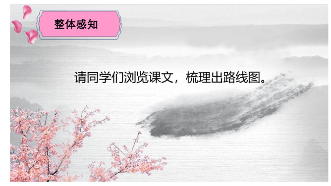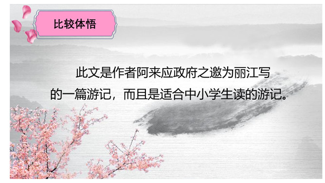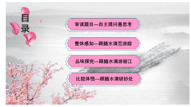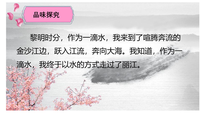 请同学们仔细读读题目,你读出了什么?想知道些什么?请同学们浏览课文,梳理出路线图。游记须有“游踪”,有不同的“视角”。请同学们默读课文,圈点勾画做旁批,想一想:作者最喜欢哪处的风景?能把题目中的“一滴水”换成“一只鸟”“一朵云”吗?此文是作者阿来应政府之邀为丽江写的一篇游记,而且是适合中小学生读的游记。请仿照此文写一篇以物(一只猫、一株花……)为叙述角度的文章。所属专题:一滴水经过丽江ppt。