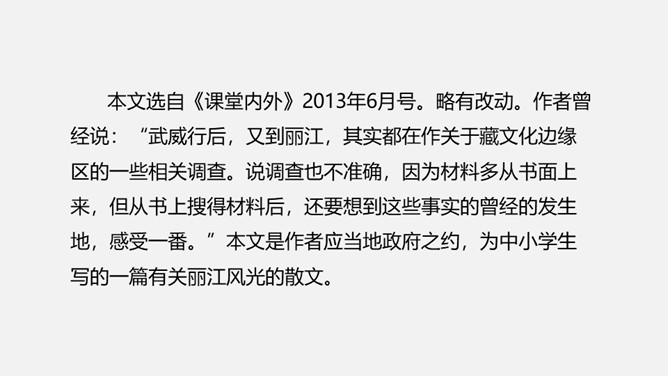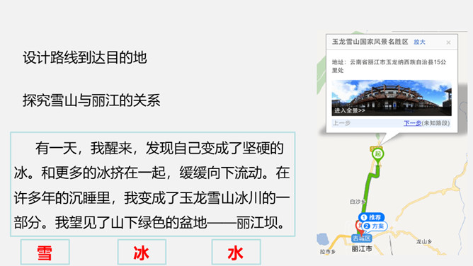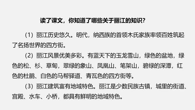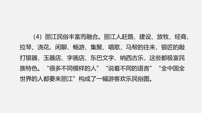 (1)丽江历史悠久。明代,纳西族的首领木氏家族率领百姓筑起了名扬世界的四方街。(2)丽江风景优美多彩。有蓝天下的玉龙雪山,绿色的盆地,绿色的松、杉、草甸,翠绿的象山、凤凰山、笔架山,碧绿的深潭,红色的杜鹃、白色的马帮驿道、青瓦色的四方街等。(3)丽江建筑富有地域特色。丽江是少数民族古镇,城里的街道、宫殿、水车、小桥,都具有鲜明的地域特色。(4)丽江民俗丰富而融合。丽江人赶路、建设、放牧、经商、拉琴、浇花、闲聊、畅游、集聚、唱歌,马帮的往来,银匠的敲打银器,玉器店、字画店、东巴文字、纳西古乐。所属专题:一滴水经过丽江ppt。