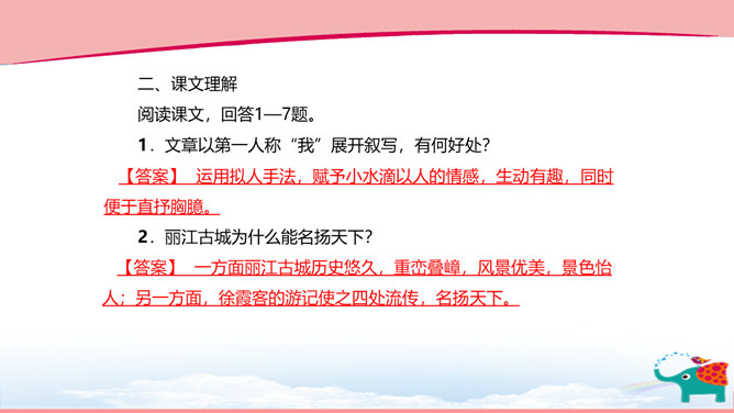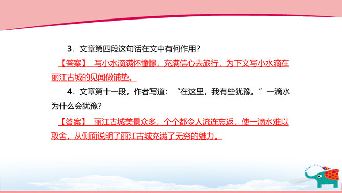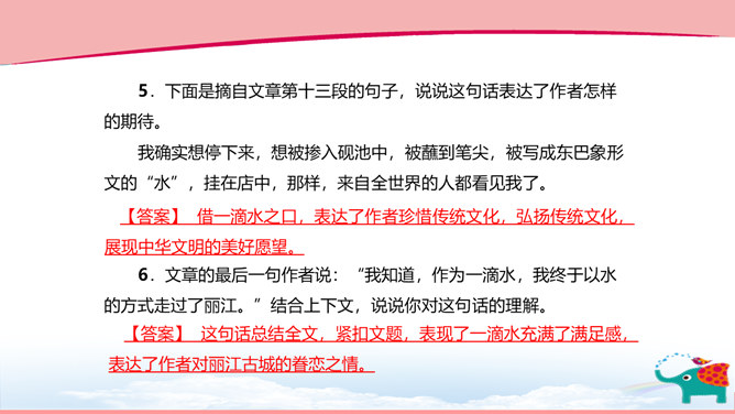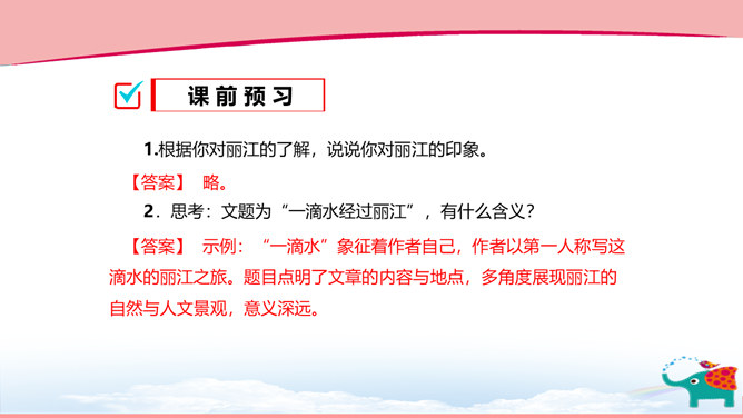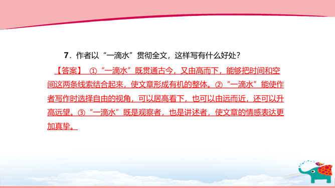 作者以“一滴水”贯彻全文,这样写有什么好处? ①“一滴水”既贯通古今,又由高而下,能够把时间和空间这两条线索结合起来,使文章形成有机的整体。②“一滴水”能使作者写作时选择自由的视角,可以居高看下,也可以由远而近,还可以升高远望。③“一滴水”既是观察者,也是讲述者,使文章的情感表达更加真挚。下面是摘自文章第十三段的句子,说说这句话表达了作者怎样的期待。借一滴水之口,表达了作者珍惜传统文化,弘扬传统文化,展现中华文明的美好愿望。“我知道,作为一滴水,我终于以水的方式走过了丽江。”说说你对这句话的理解。所属专题:一滴水经过丽江ppt。