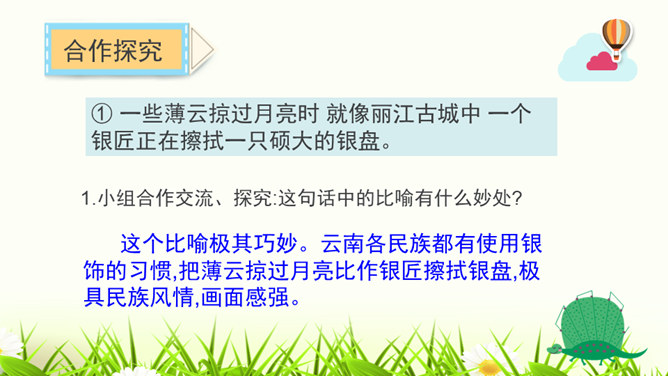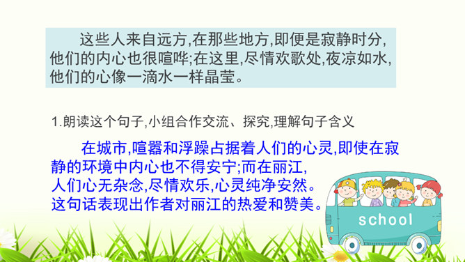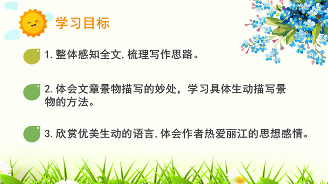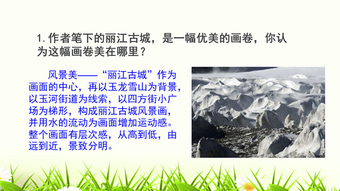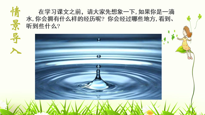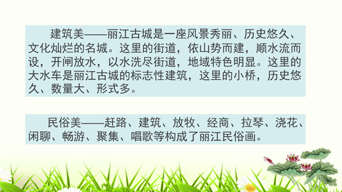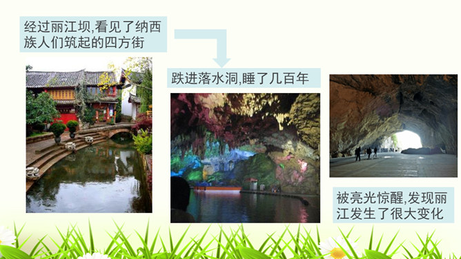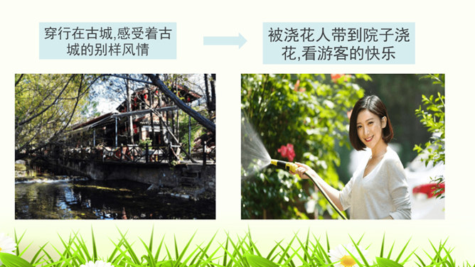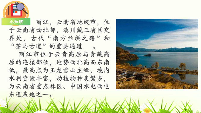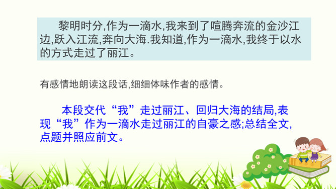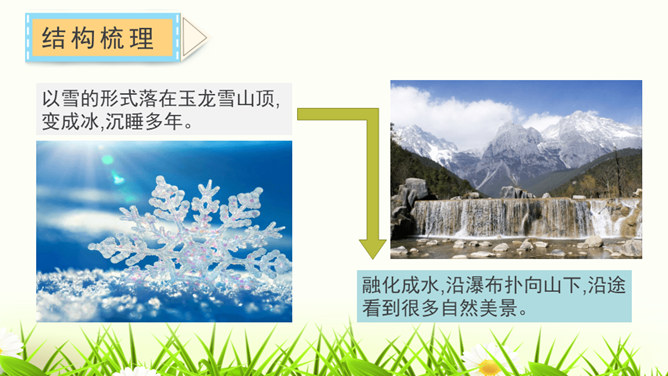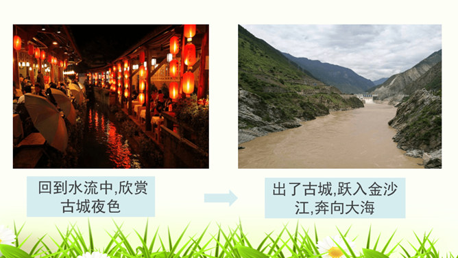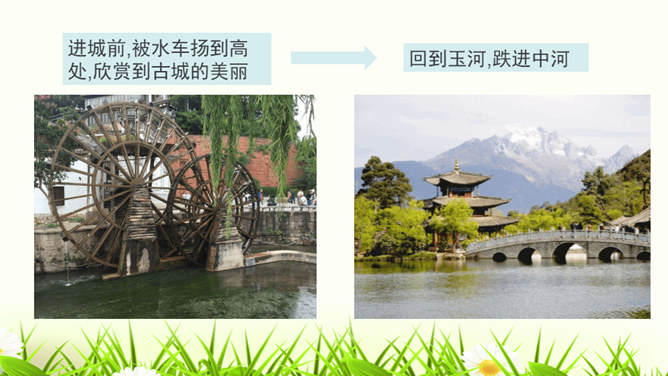 1.构思新颖,视角独特。本文作者以第一人称写一滴水的旅行,从古代到现代,从雪山到平原,全方位多角度地展现了丽江的自然景物、人文风情,构思新颖,视角独特,读来令人倍感亲切。2.线索清晰,借物抒情。文章以“小水滴”为线索,通过“雪花——冰川——小水滴——跌入、跌出落水洞—经玉河流入四方街—经中河流经丽江古城并流出古城进入金沙江”,完成了“一滴水经过丽江”的历程。作者以风趣幽默的方式讲述了“小水滴”经过丽江的情形,流露出作者对丽江无限喜爱的真挚情感。所属专题:一滴水经过丽江ppt。