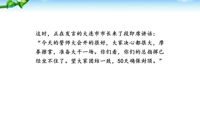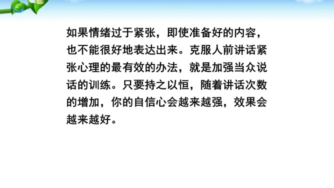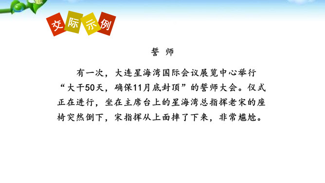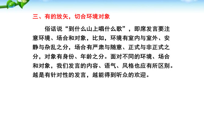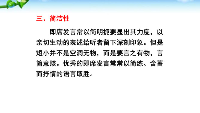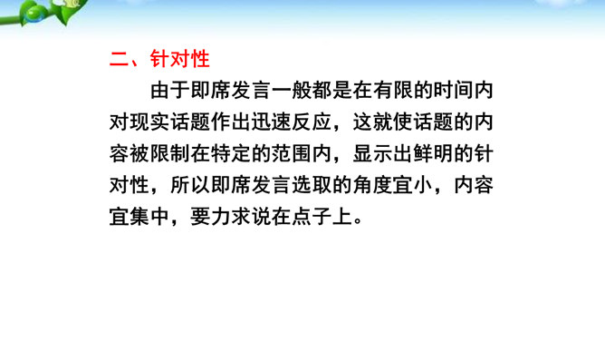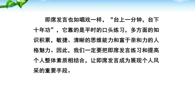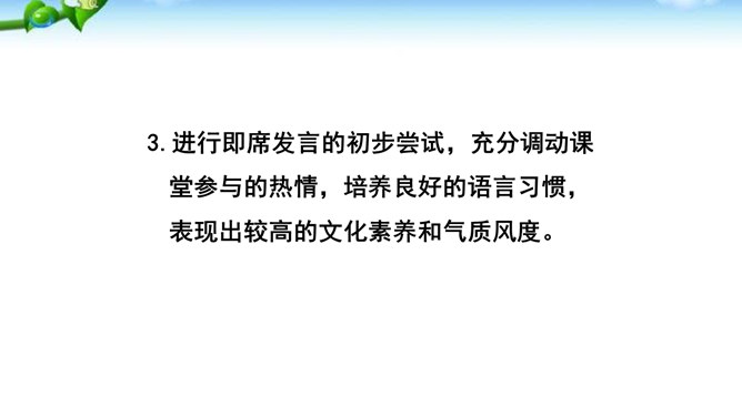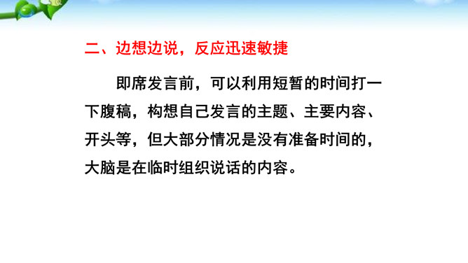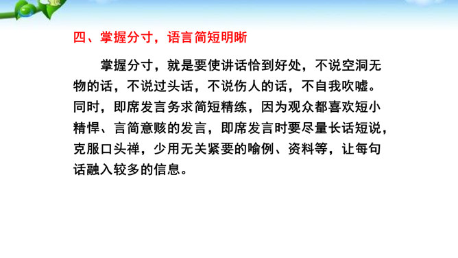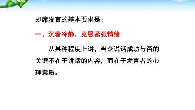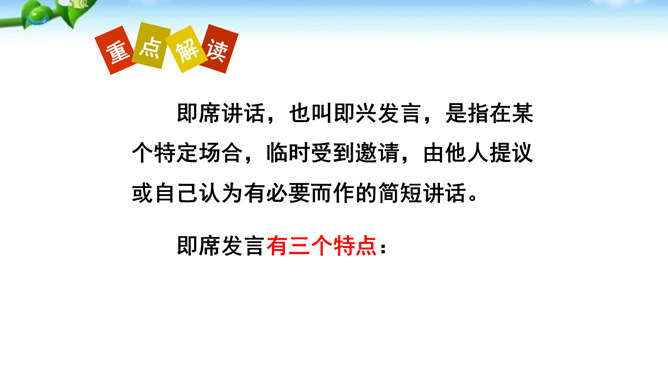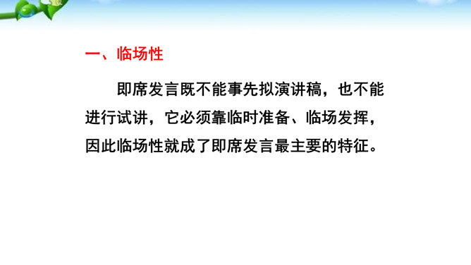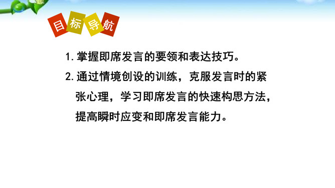 掌握即席发言的要领和表达技巧。通过情境创设的训练,克服发言时的紧张心理,学习即席发言的快速构思方法,提高瞬时应变和即席发言能力。进行即席发言的初步尝试,充分调动课堂参与的热情,培养良好的语言习惯,表现出较高的文化素养和气质风度。即席讲话,也叫即兴发言,是指在某个特定场合,临时受到邀请,由他人提议或自己认为有必要而作的简短讲话。即席发言有三个特点:临场性。即席发言既不能事先拟演讲稿。针对性由于即席发言一般都是在有限的时间内对现实话题作出迅速反应,这就使话题的内容被限制在特定的范围内,显示出鲜明的针对性。所属专题:即席讲话ppt。