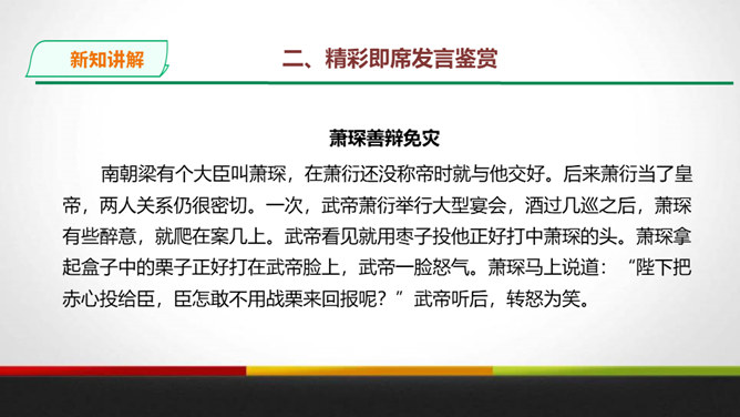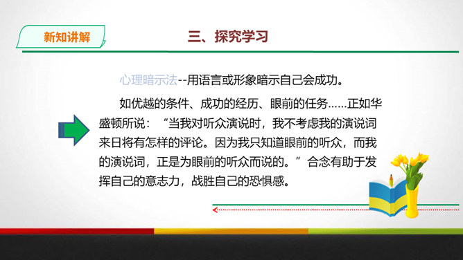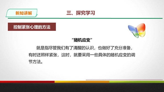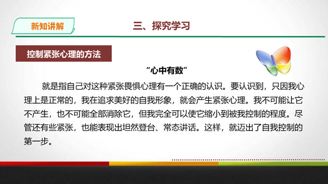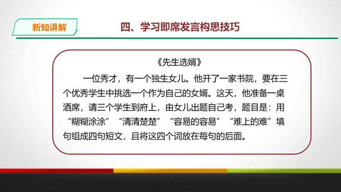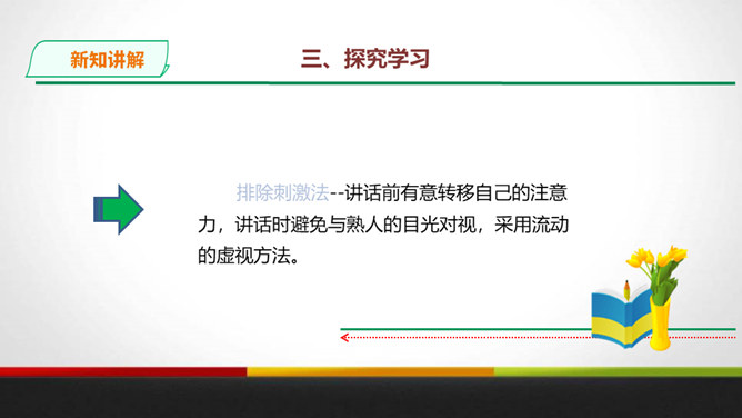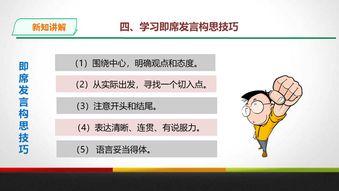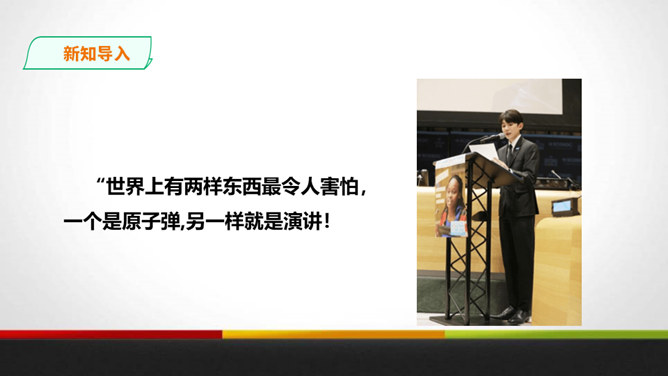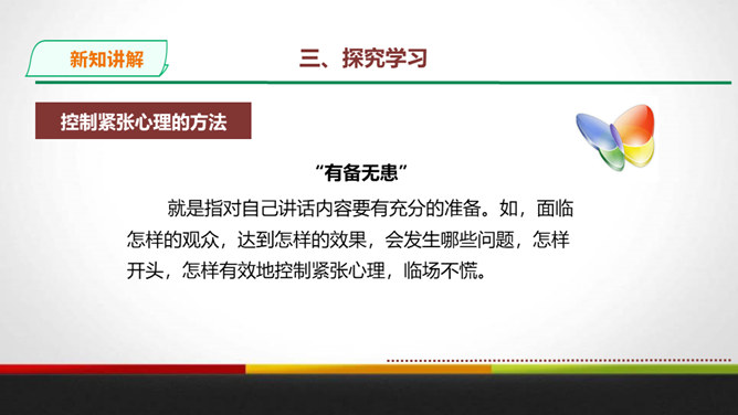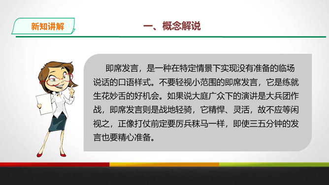 一种在特定情景下实现没有准备的临场说话的口语样式。不要轻视小范围的即席发言,它是练就生花妙舌的好机会。如果说大庭广众下的演讲是大兵团作战,即席发言则是战地轻骑,它精悍、灵活,故不应等闲视之,正像打仗前定要厉兵秣马一样,即使三五分钟的发言也要精心准备。就是指自己对这种紧张畏惧心理有一个正确的认识。要认识到,只因我心理上是正常的,我在追求美好的自我形象,就会产生紧张心理。我不可能让它不产生,也不可能全部消除它,但我完全可以使它缩小到被我控制的程度。尽管还有些紧张,也能表现出坦然登台、常态讲话。所属专题:即席讲话ppt。