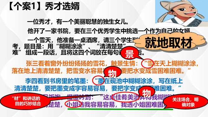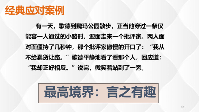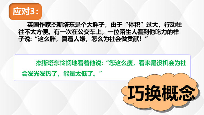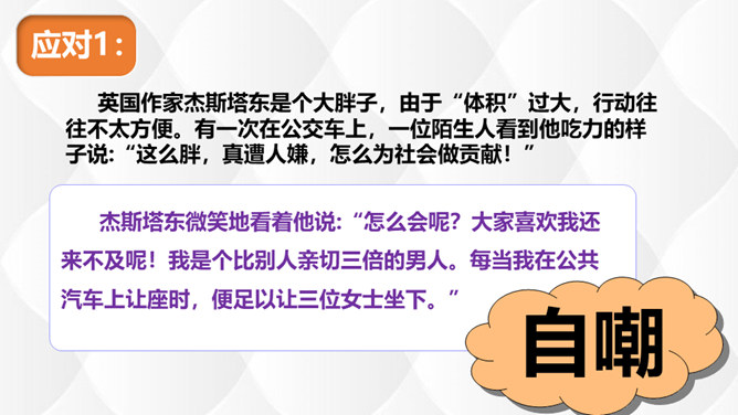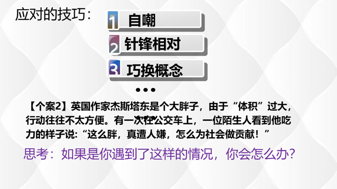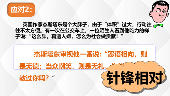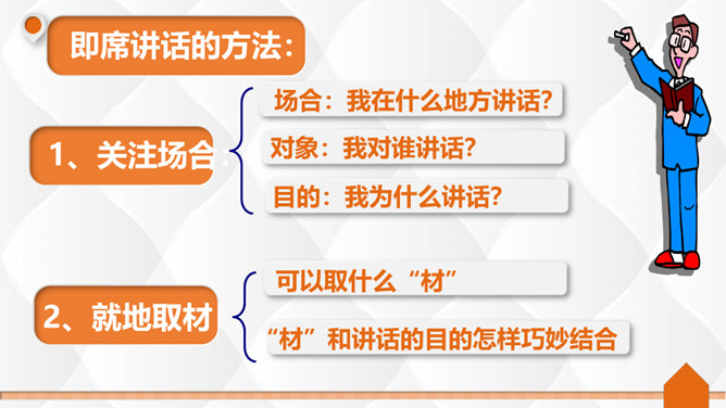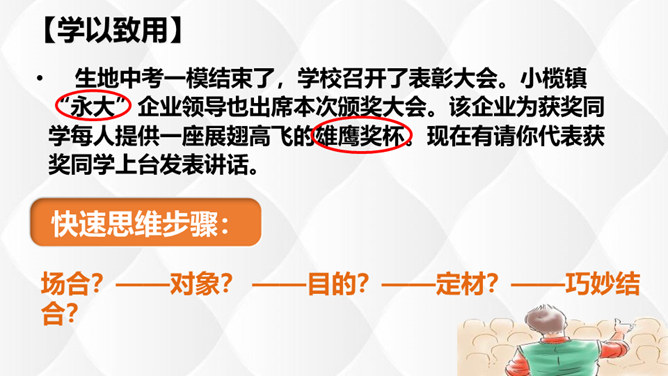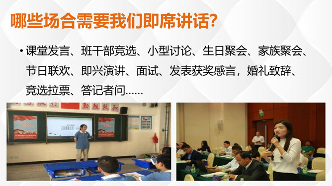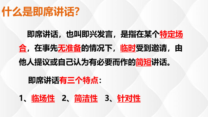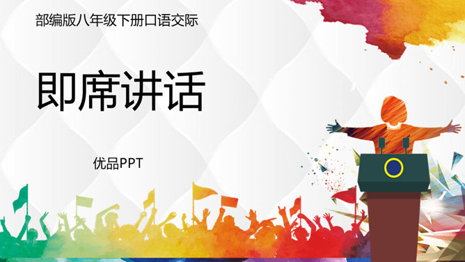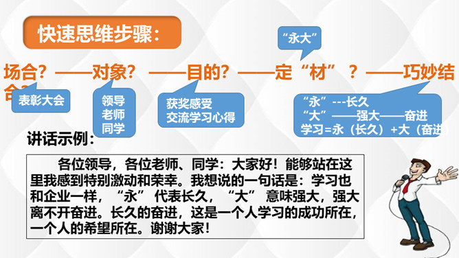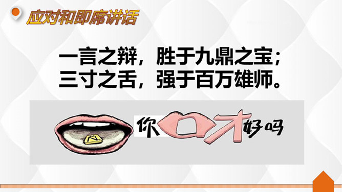 1、了解应对和即席讲话的特点;2、探究应对和即席讲话的技巧;3、在实践训练中提高瞬时应变和即席讲话的能力。同学们,嘴巴是大脑的传声筒。出众的口才背后,其实是强大的逻辑思维能力。所以,我们说口才并不是天生的,而是通过后天的刻苦练习可以得来的。 “临渊羡鱼,不如退而结网。”要相信,只要掌握科学的方法,加上自己勤奋的练习,你也可以像孟子一样雄辩无敌,像苏秦一样言动六国,甚至可以像孔明一样舌战群儒。最后希望大家:掌握方法,言之有物,口吐珠玑;随机应变,言之有趣,舌灿莲花。所属专题:即席讲话ppt。