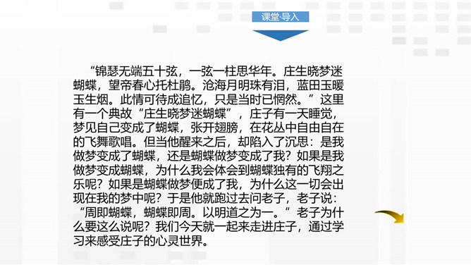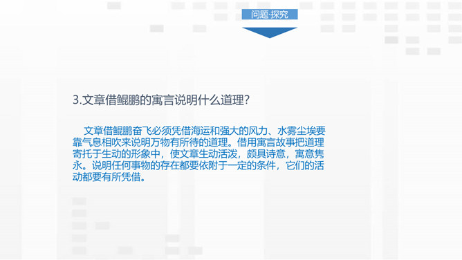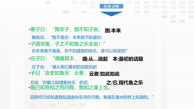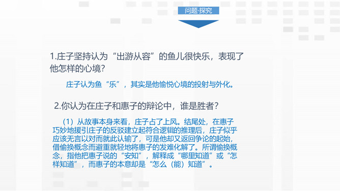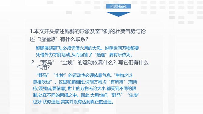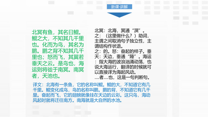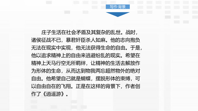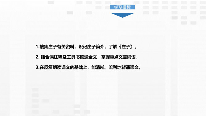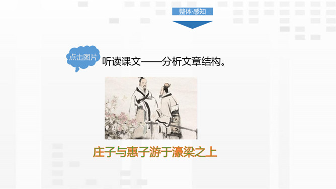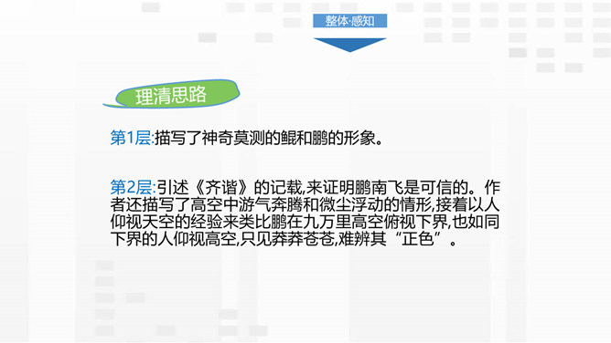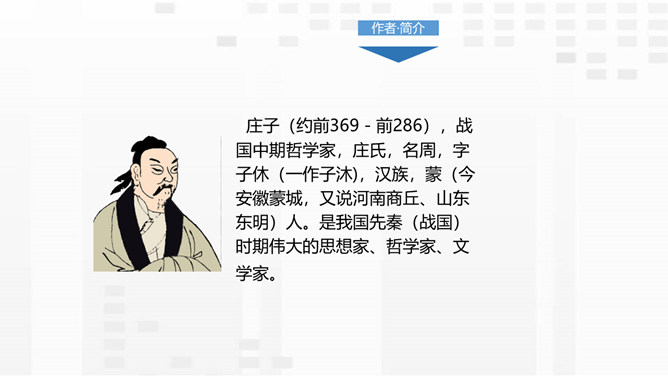 1.搜集庄子有关资料,识记庄子简介,了解《庄子》。2. 结合课注释及工具书读通全文,掌握重点文言词语。3.在反复朗读课文的基础上,能清晰、流利地背诵课文。这两则故事集中表现了庄子的思想和《庄子》散文的寓言特色,形象生动,耐人寻味,如甘醴似琼浆,让人百品不厌。希望大家课后阅读《庄子•秋水》,全面了解庄子,包括他的人生观、政治观、社会观,探究庄子与孔孟的区别。引述《齐谐》的记载,来证明鹏南飞是可信的。作者还描写了高空中游气奔腾和微尘浮动的情形。所属专题:北冥有鱼ppt、庄子与惠子游于濠梁之上ppt。