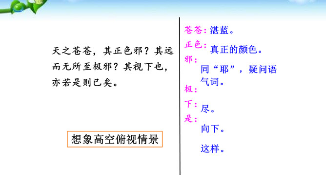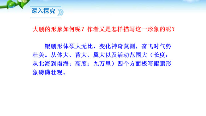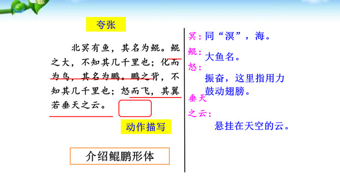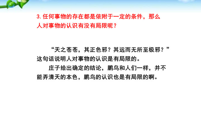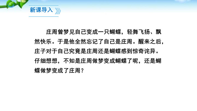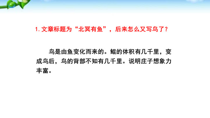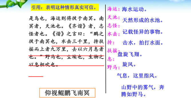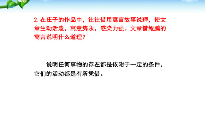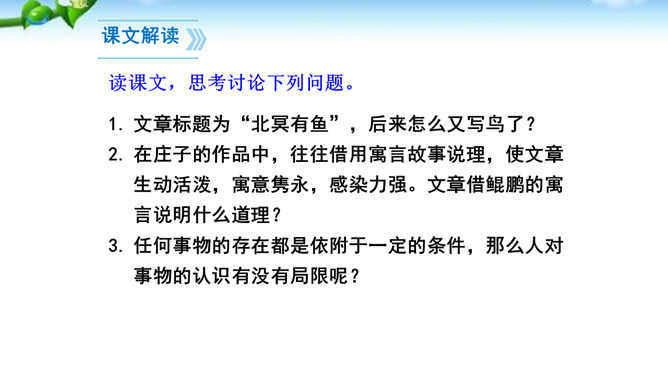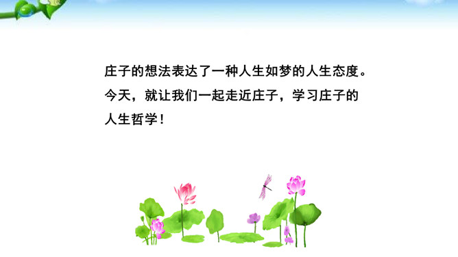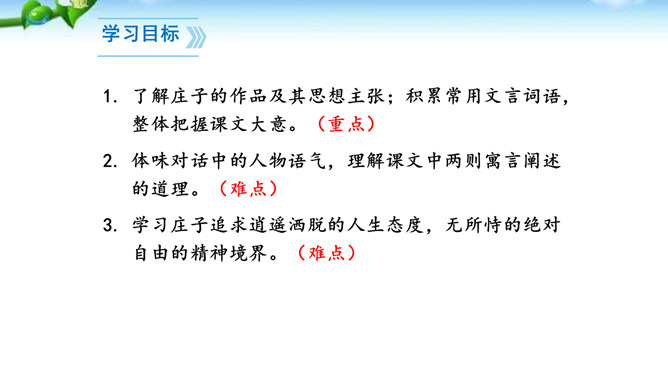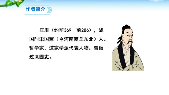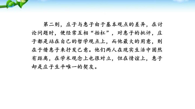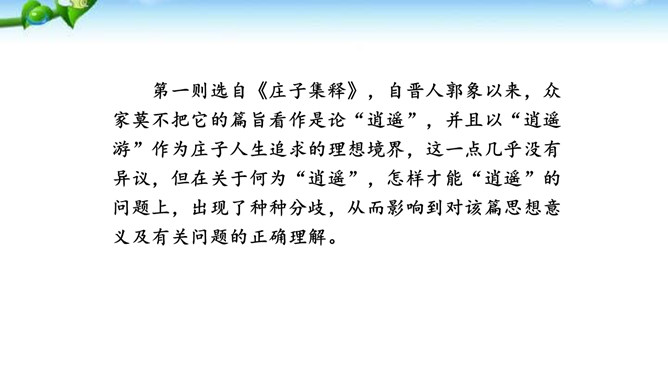 第一则选自《庄子集释》,自晋人郭象以来,众家莫不把它的篇旨看作是论“逍遥”,并且以“逍遥游”作为庄子人生追求的理想境界,这一点几乎没有异议,但在关于何为“逍遥”,怎样才能“逍遥”的问题上,出现了种种分歧,从而影响到对该篇思想意义及有关问题的正确理解。第二则,庄子与惠子由于基本观点的差异,在讨论问题时,便经常互相“抬杠”,对惠子的批评,庄子都是站在自己的哲学观点上,而他最大的用意,则在于借惠子来抒发己意。他们两人在现实生活中固然有距离,在学术观念上也很对立,但在情谊上,惠子却是庄子生平唯一的契友。所属专题:北冥有鱼ppt、庄子与惠子游于濠梁之上ppt。