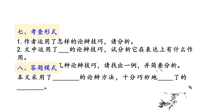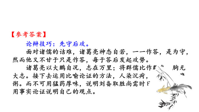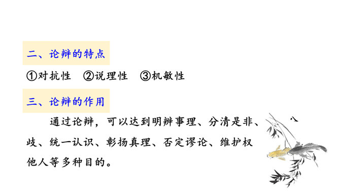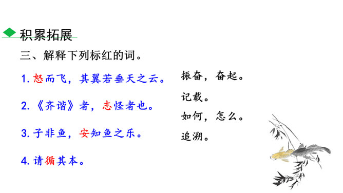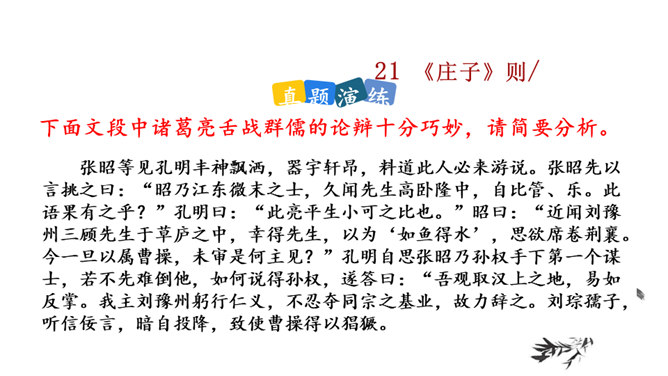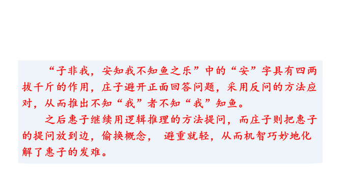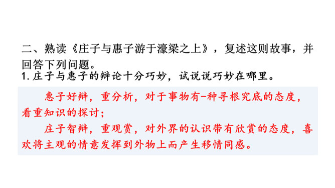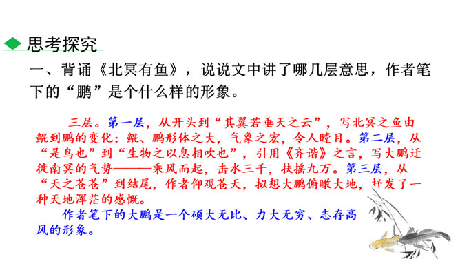 说说文中讲了哪几层意思,作者笔下的“鹏”是个什么样的形象。三层。第一层,从开头到“其翼若垂天之云”,写北冥之鱼由鲲到鹏的变化:鲲、鹏形体之大,气象之宏,令人瞠目。第二层,从“是鸟也”到“生物之以息相吹也”,引用《齐谐》之言,写大鹏迁徙南冥的气势———乘风而起,击水三千,扶摇九万。第三层,从“天之苍苍”到结尾,作者仰观苍天,拟想大鹏俯瞰大地,抒发了一种天地浑茫的感慨。作者笔下的大鹏是一个硕大无比、力大无穷、志存高远、善借长风的形象。庄子与惠子的辩论十分巧妙,试说说巧妙在哪里。所属专题:北冥有鱼ppt、庄子与惠子游于濠梁之上ppt。