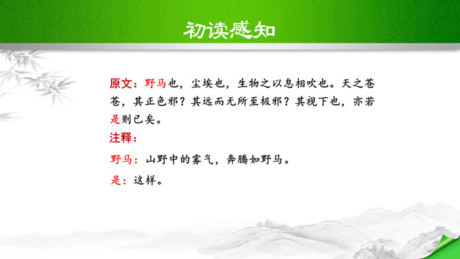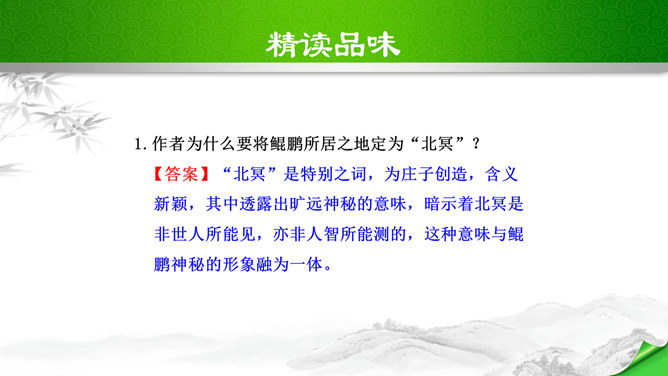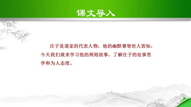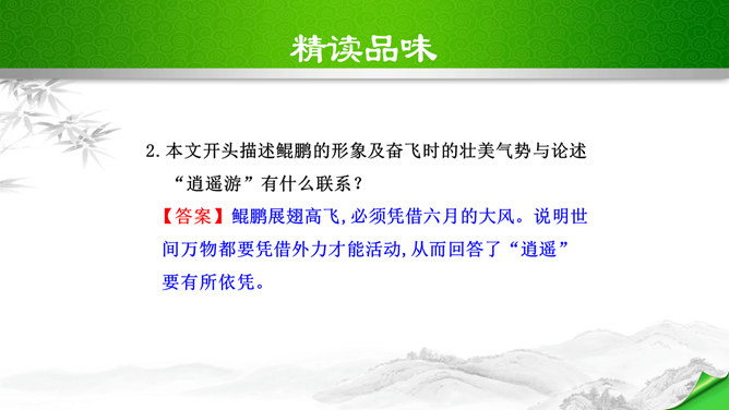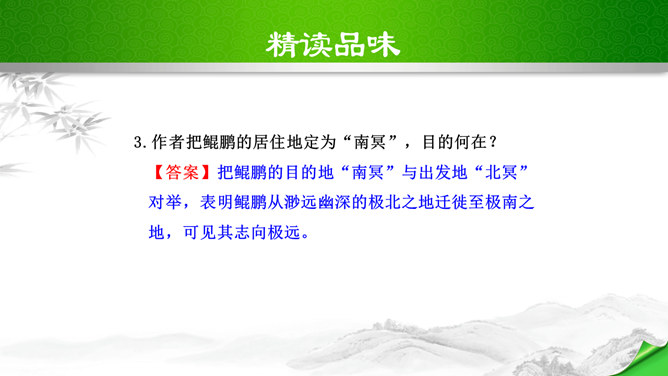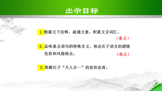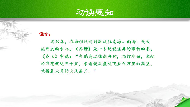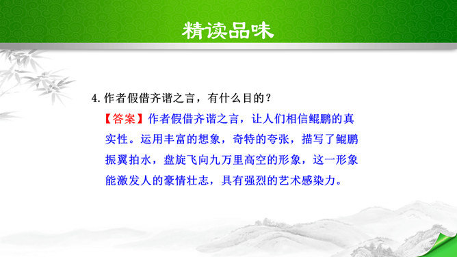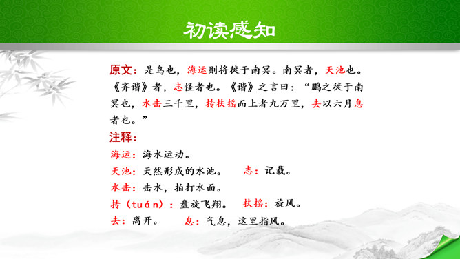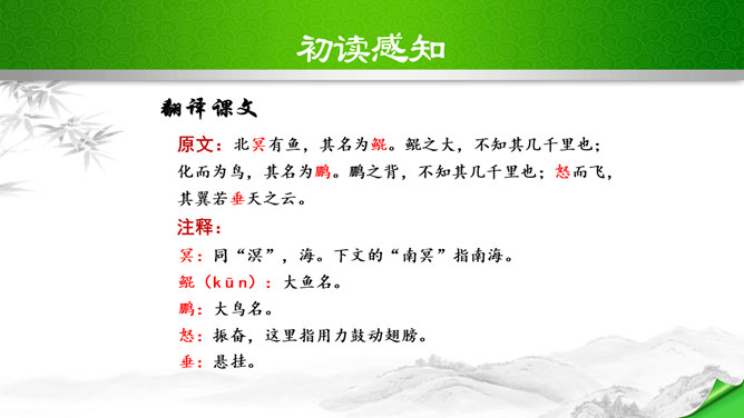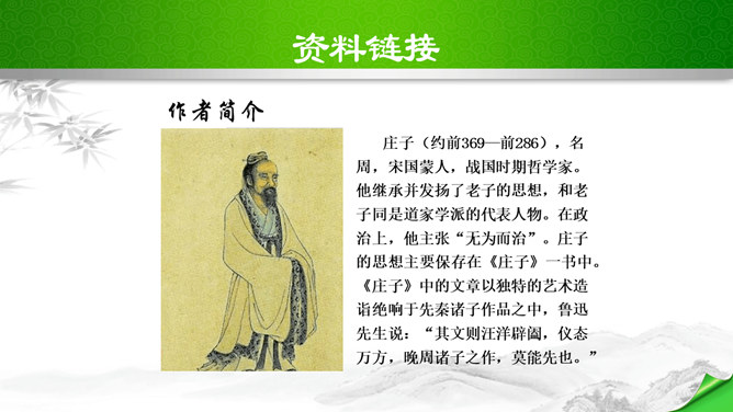 庄子是道家的代表人物,他的幽默睿智世人皆知,今天我们就来学习他的两则故事,了解庄子的处事哲学和为人态度。根据文下注释,疏通文意,积累文言词汇。品味重点语句的特殊含义,体会庄子语言的感情色彩和风格特点。理解庄子“天人合一”的处世态度。作者为什么要将鲲鹏所居之地定为“北冥”?“北冥”是特别之词,为庄子创造,含义新颖,其中透露出旷远神秘的意味,暗示着北冥是非世人所能见,亦非人智所能测的,这种意味与鲲鹏神秘的形象融为一体。本文开头描述鲲鹏的形象及奋飞时的壮美气势与论述 “逍遥游”有什么联系?所属专题:北冥有鱼ppt。
