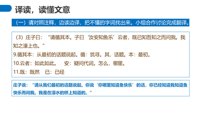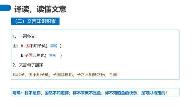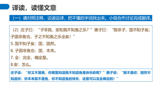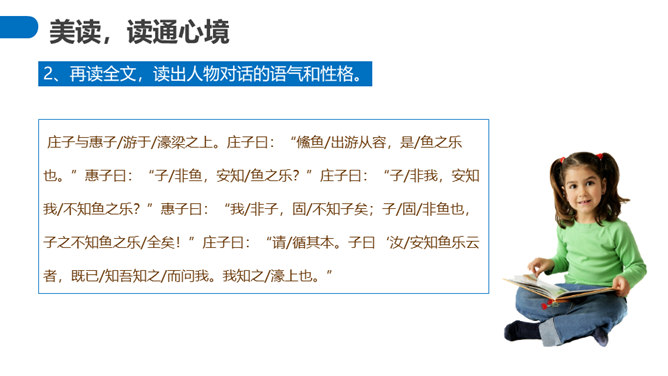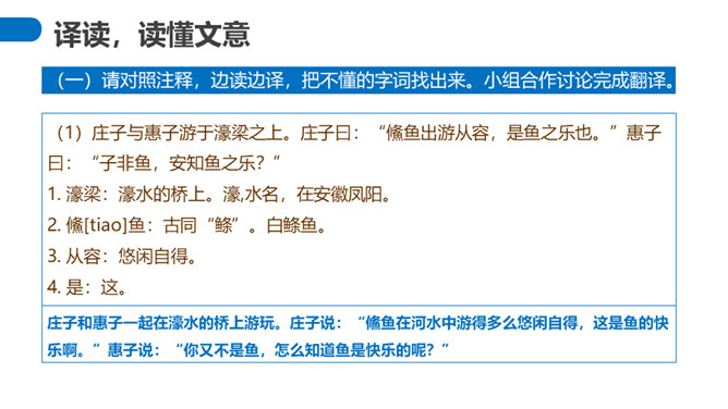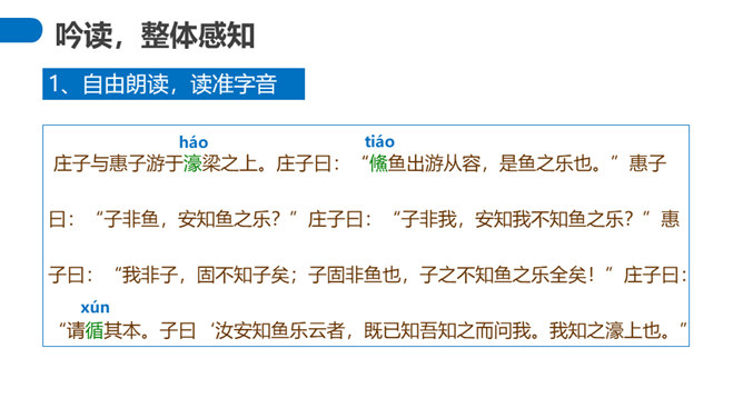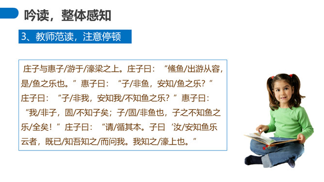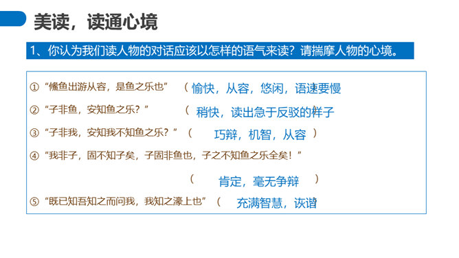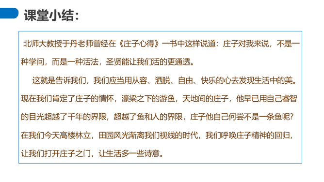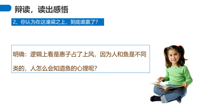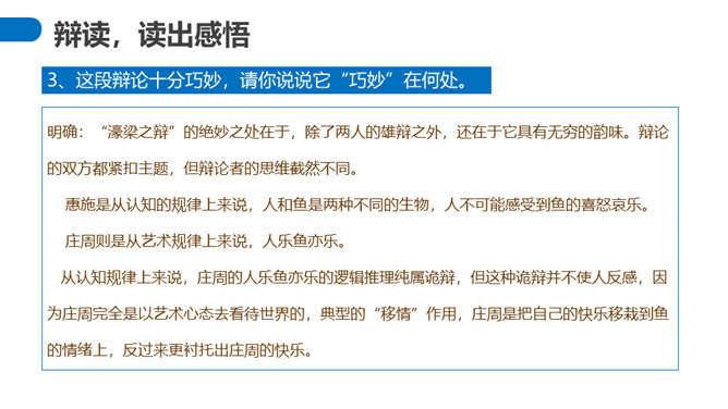 “濠梁之辩”的绝妙之处在于,除了两人的雄辩之外,还在于它具有无穷的韵味。辩论的双方都紧扣主题,但辩论者的思维截然不同。惠施是从认知的规律上来说,人和鱼是两种不同的生物,人不可能感受到鱼的喜怒哀乐。庄周则是从艺术规律上来说,人乐鱼亦乐。从认知规律上来说,庄周的人乐鱼亦乐的逻辑推理纯属诡辩,但这种诡辩并不使人反感,因为庄周完全是以艺术心态去看待世界的,典型的“移情”作用,庄周是把自己的快乐移栽到鱼的情绪上,反过来更衬托出庄周的快乐。所属专题:庄子与惠子游于濠梁之上ppt。