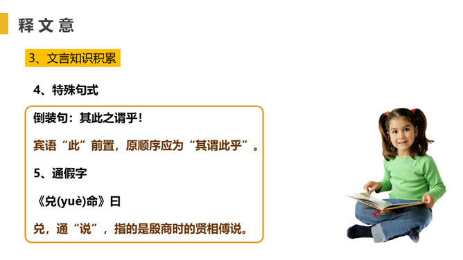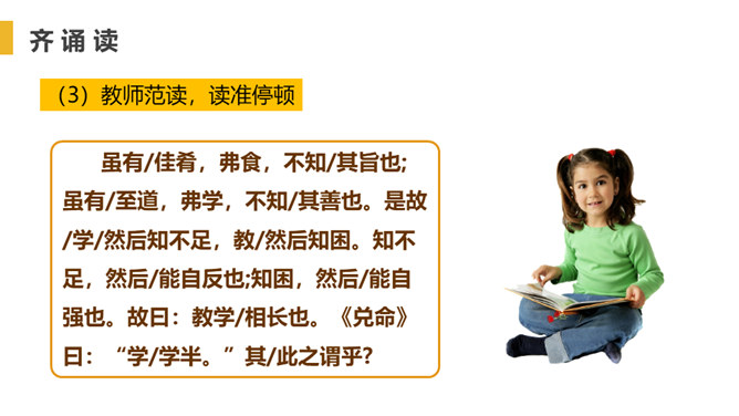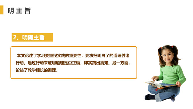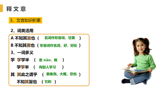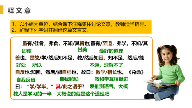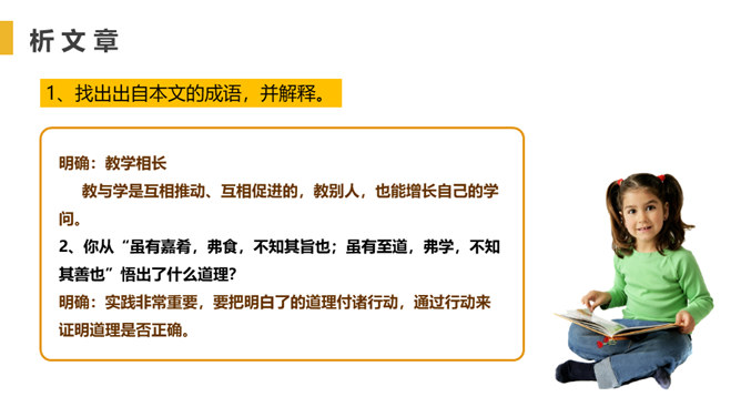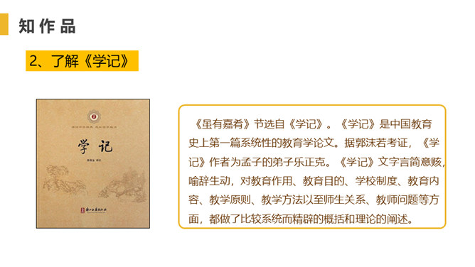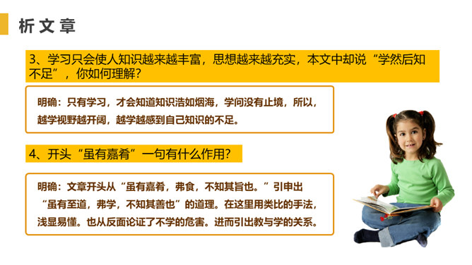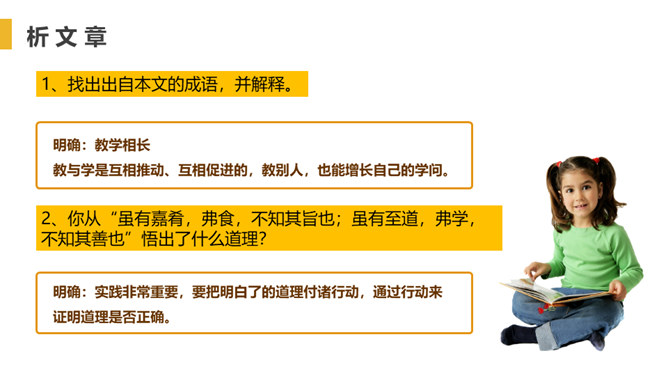 找出出自本文的成语,并解释。教学相长,教与学是互相推动、互相促进的,教别人,也能增长自己的学问。你从“虽有嘉肴,弗食,不知其旨也;虽有至道,弗学,不知其善也”悟出了什么道理?实践非常重要,要把明白了的道理付诸行动,通过行动来证明道理是否正确。学习只会使人知识越来越丰富,思想越来越充实,本文中却说“学然后知不足”,你如何理解?只有学习,才会知道知识浩如烟海,学问没有止境,所以,越学视野越开阔,越学越感到自己知识的不足。本文论述了学习要重视实践的重要性,要求把明白了的道理付诸行动。所属专题:虽有佳肴ppt。