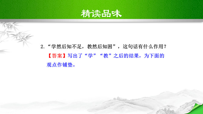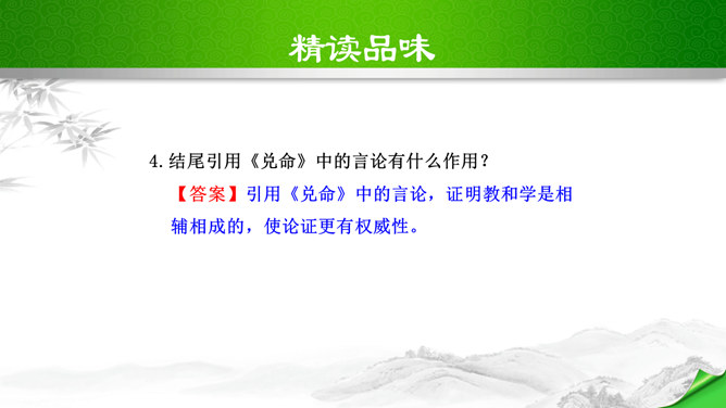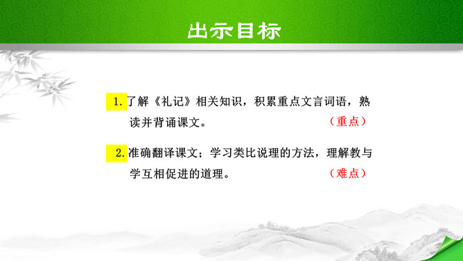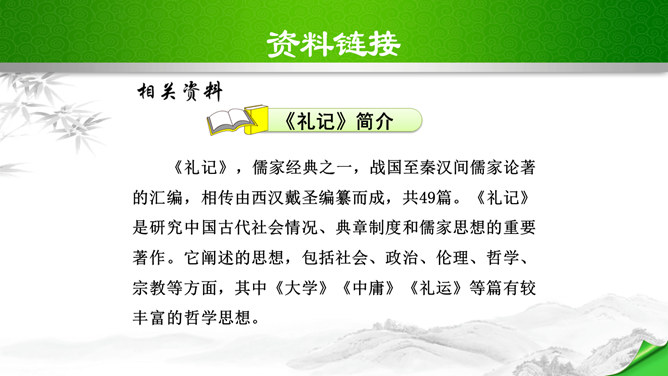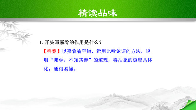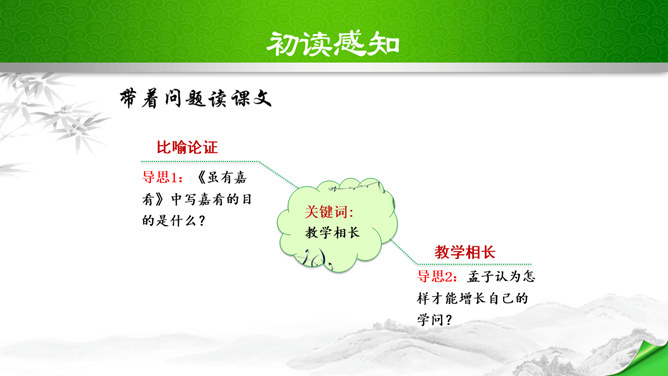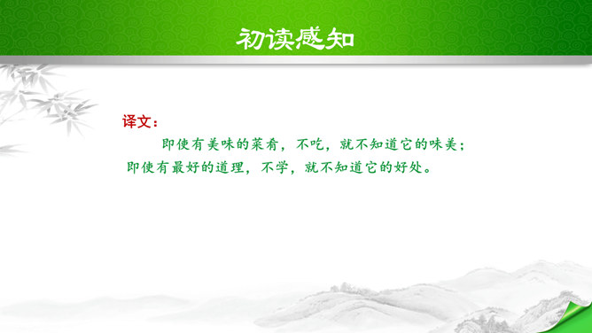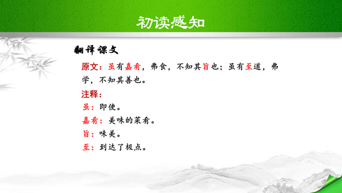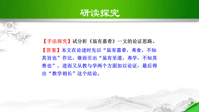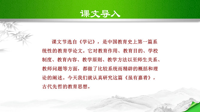 课文节选自《学记》,是中国教育史上第一篇系统性的教育学论文。它对教育作用、教育目的、学校制度、教育内容、教学原则、教学方法以至师生关系、教师问题等方面,都做了比较系统而精辟的概括和理论的阐述。今天我们就认真研究这篇《虽有嘉肴》,古代先哲的教育思想。了解《礼记》相关知识,积累重点文言词语,熟读并背诵课文。准确翻译课文;学习类比说理的方法,理解教与学互相促进的道理。以嘉肴喻至道,运用比喻论证的方法,说明“弗学,不知其善”的道理,将抽象的道理具体化,通俗易懂。所属专题:虽有佳肴ppt。