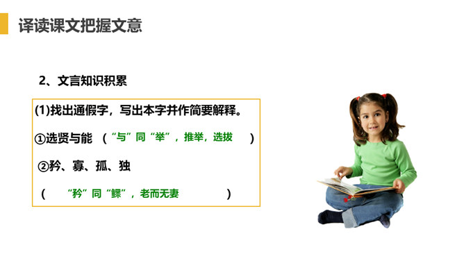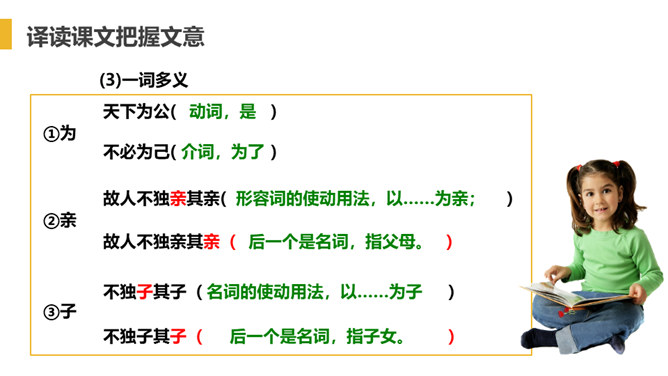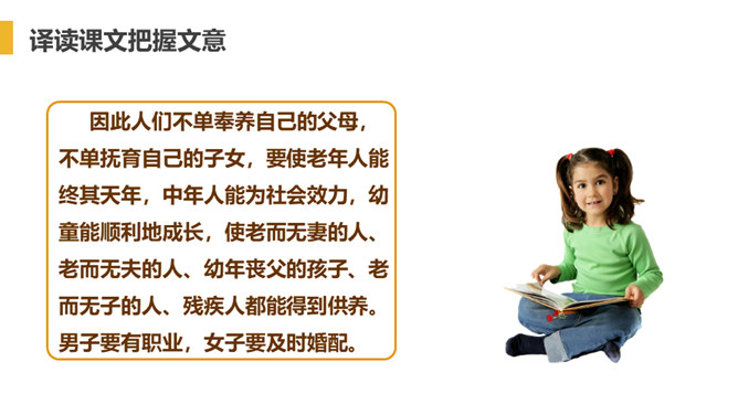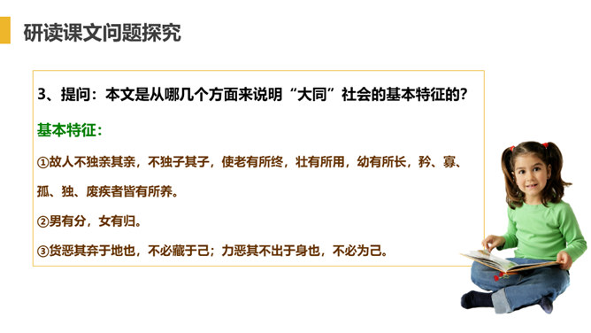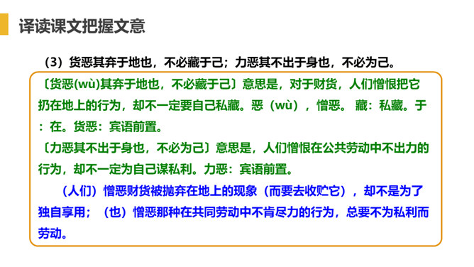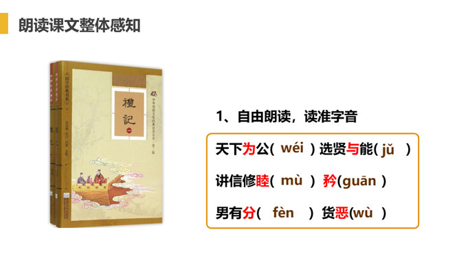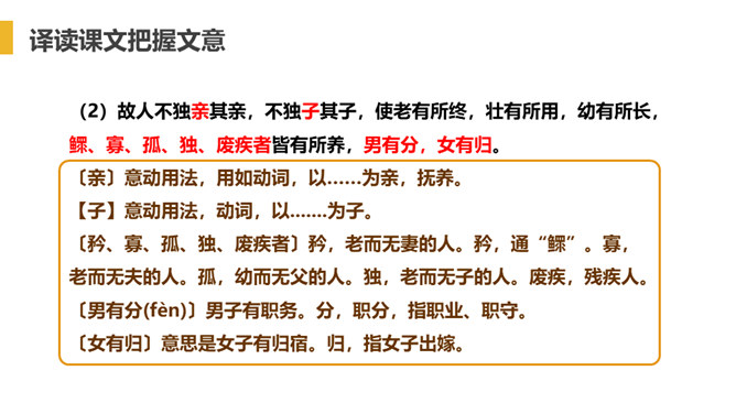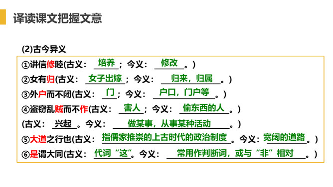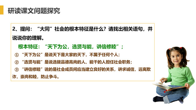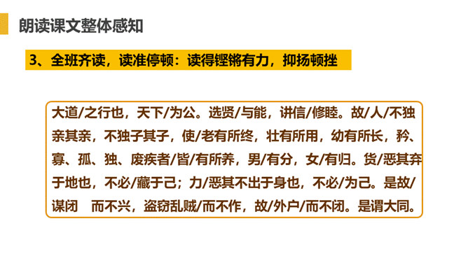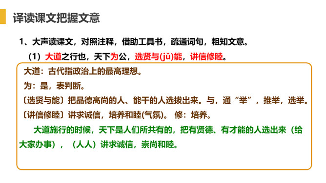“大道”什么意思呢?在古代指政治上的最高理想。“行”是施行的意思。 大道之行——是指执政者施行大道,则老百姓便可以生活在安定和平的社会环境中,这样的社会也叫大同社会。根据文义,全文可以分为几层?可分为三层:作者运用了总—分—总的论述方法。第一层:“大道之行也.....讲信修睦。”这一层是对“大同”社会的纲领性说明(根本特征),是总说。第二层:“故人不独亲其亲……不必为己。”详述“大同”社会的基本特征。第三层:“是故谋闭而不兴……是谓大同。”总结全文。所属专题:大道之行也ppt。