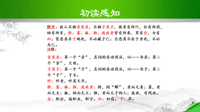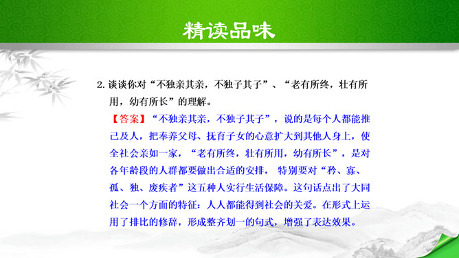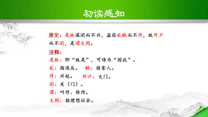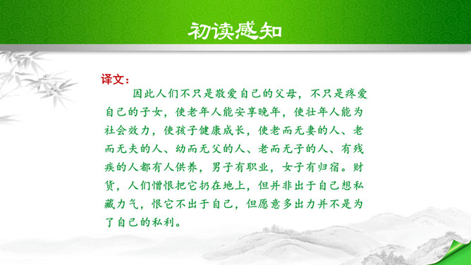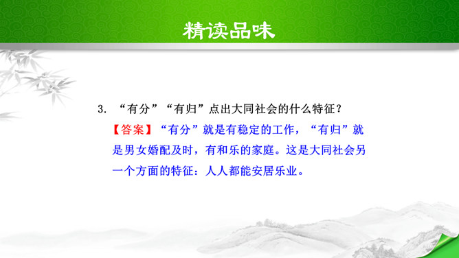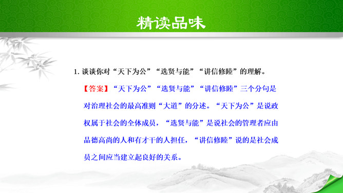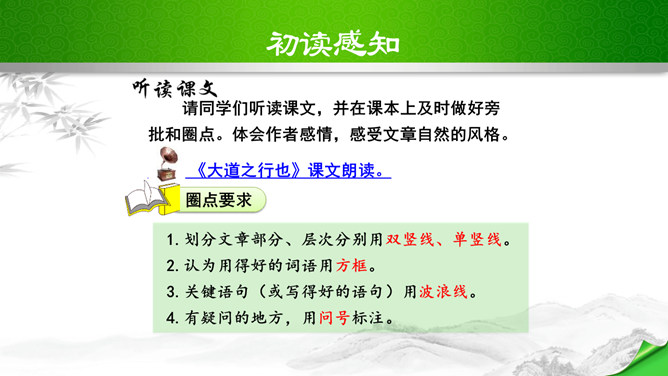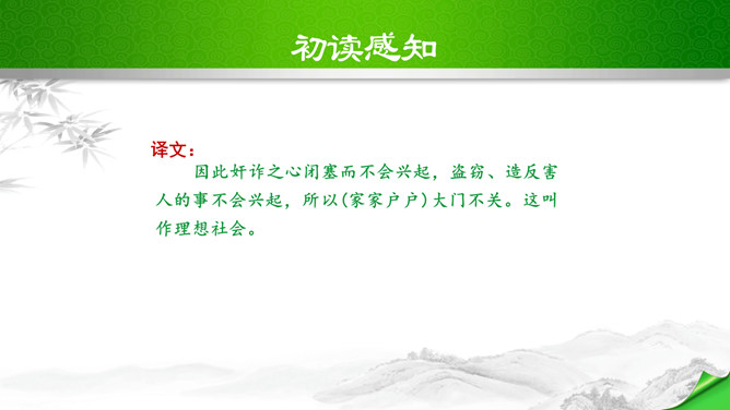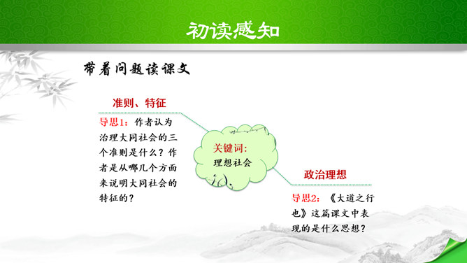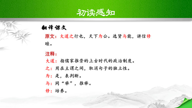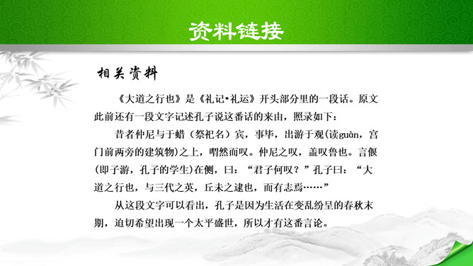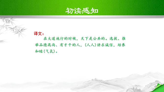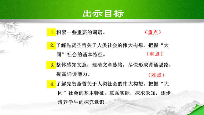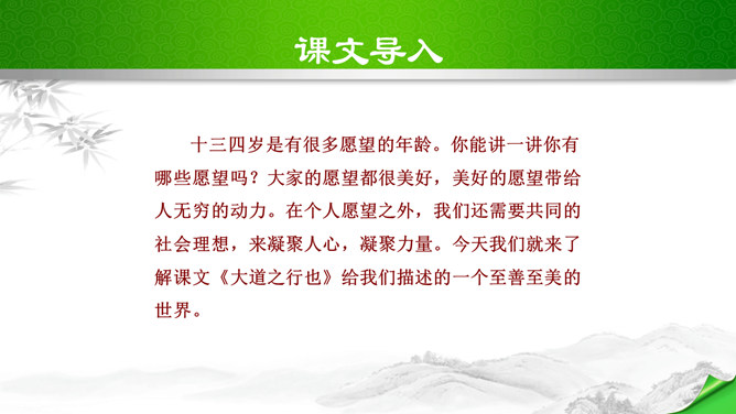 十三四岁是有很多愿望的年龄。你能讲一讲你有哪些愿望吗?大家的愿望都很美好,美好的愿望带给人无穷的动力。在个人愿望之外,我们还需要共同的社会理想,来凝聚人心,凝聚力量。今天我们就来了解课文《大道之行也》给我们描述的一个至善至美的世界。积累一些重要的词语。了解先贤圣哲关于人类社会的伟大构想,把握“大同”社会的基本特征。整体感知文意,理清文章脉络,尽快形成背诵思路,提高诵读能力。了解先贤圣哲关于人类社会的伟大构想,把握“大同”社会的基本特征。联系实际,探求未知,逐步培养学生的探究意识。所属专题:大道之行也ppt。