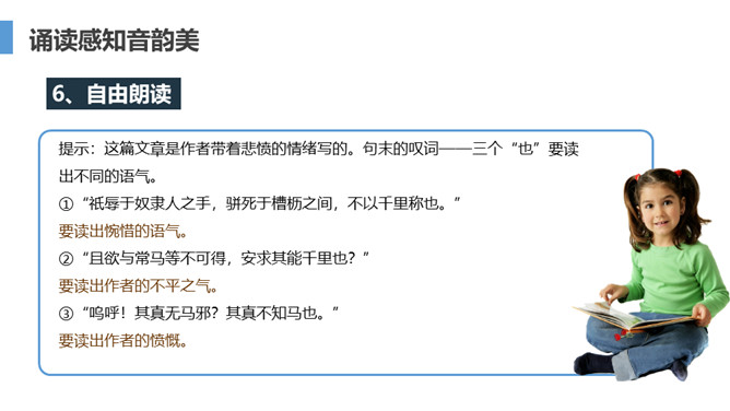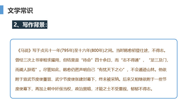 马是一种吉祥、神圣的动物,是人类的朋友,而且是十二生肖之一,哪些同学属马?请每一个人说一个有关马的成语。在作者笔下,马的遭遇是不幸的,因此我们要将对千里马的同情读出来。把这11个“不”字读好,它表现了千里马的遭遇,作者的不平,表现了作者的愤慨和嘲讽。下面大家各读各的,一定要慢一点,要旁若无人地读。写于贞元十一年(795年)至十六年(800年)之间。当时韩愈初登仕途,不得志。曾经三次上书宰相求擢用,但结果是“待命”四十余日,而“志不得通”,“足三及门,而阍人辞焉”。所属专题:马说ppt。