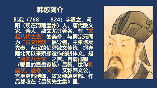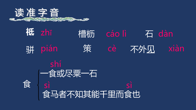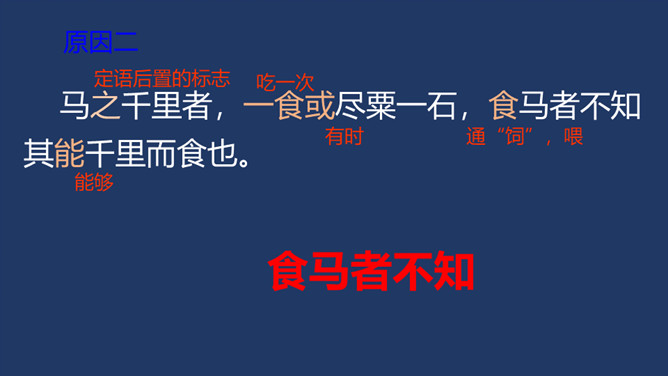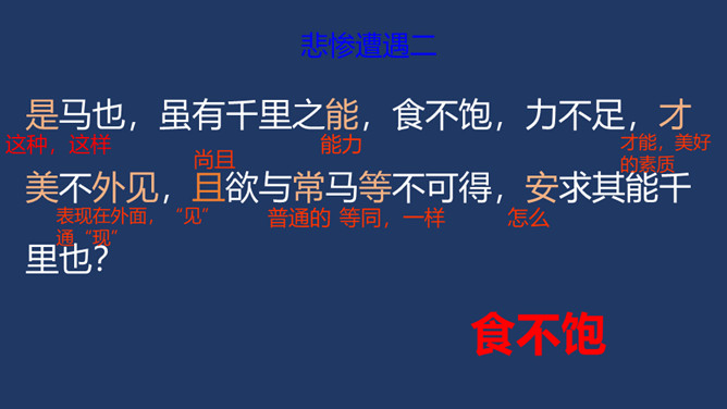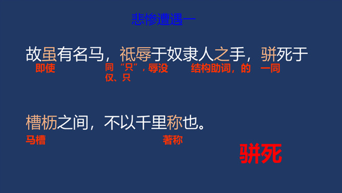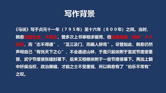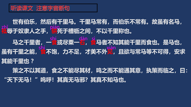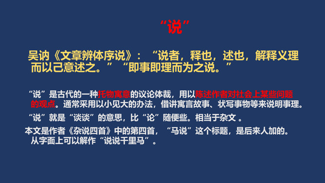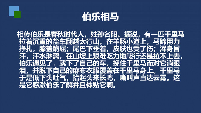 相传伯乐是春秋时代人,姓孙名阳。据说,有一匹千里马拉着沉重的盐车翻越太行山。在羊肠小道上,马蹄用力挣扎,膝盖跪屈;尾巴下垂着,皮肤也受了伤;浑身冒汗,汗水淋漓,在山坡上艰难吃力地爬行还是拉不上去,伯乐遇见了,就下了自己的车,挽住千里马而对它淌眼泪,并脱下自己的麻布衣服覆盖在千里马身上。千里马于是低下头吐气,抬起头来长鸣,嘶叫声直达云霄。这是它感激伯乐了解并且体贴它啊。 本文是作者《杂说四首》中的第四首,“马说”这个标题,是后来人加的。从字面上可以解作“说说千里马”。所属专题:马说ppt。