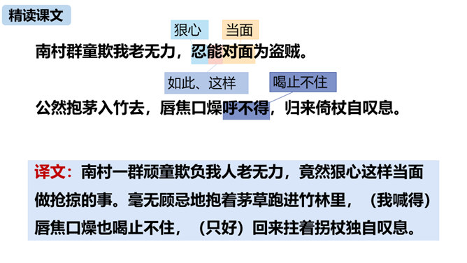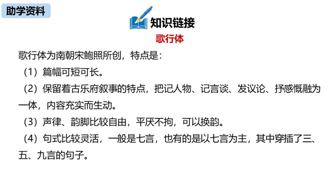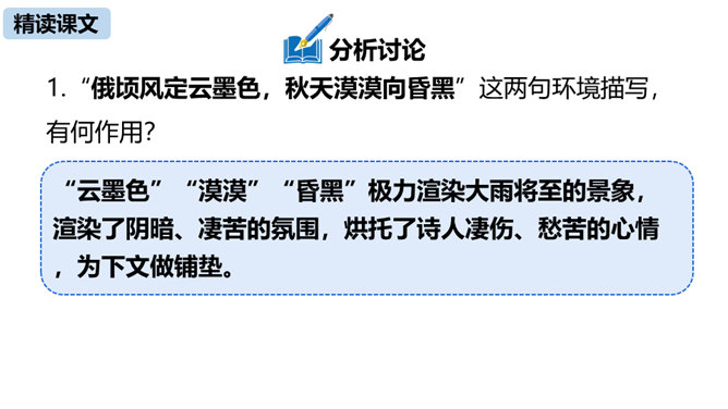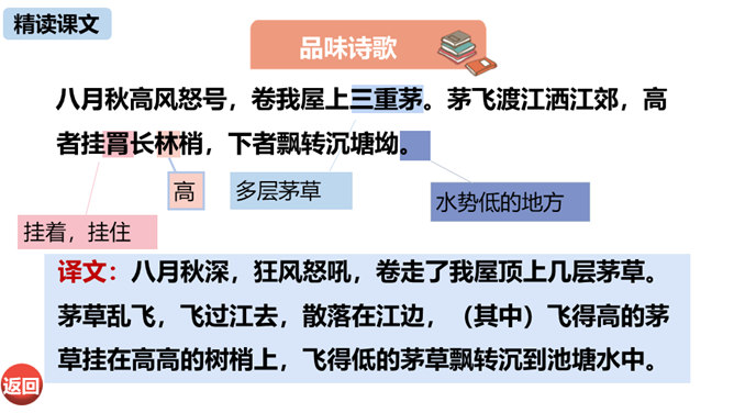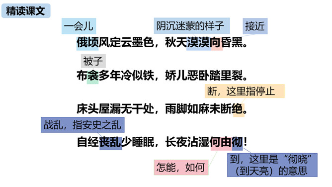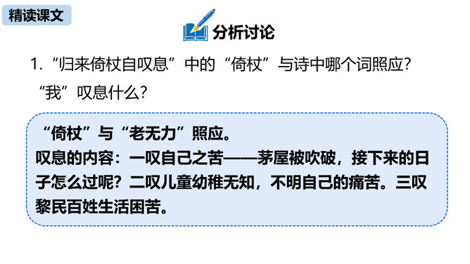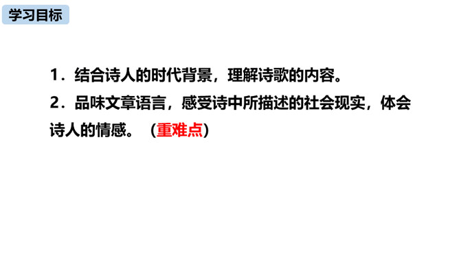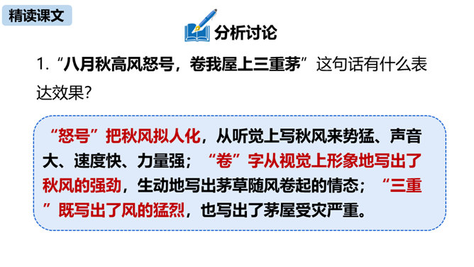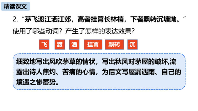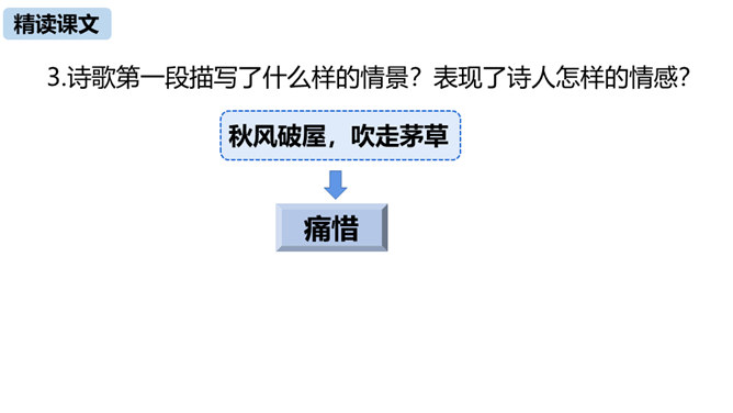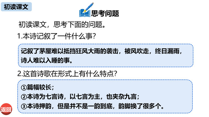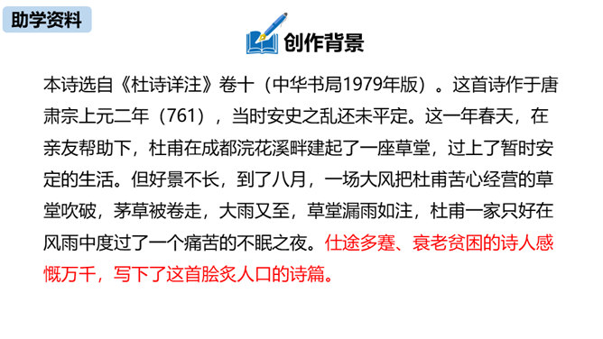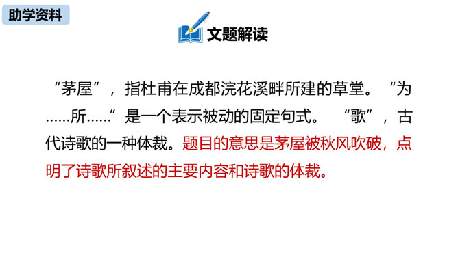 结合诗人的时代背景,理解诗歌的内容。品味文章语言,感受诗中所描述的社会现实,体会诗人的情感。(重难点)“茅屋”,指杜甫在成都浣花溪畔所建的草堂。“为……所……”是一个表示被动的固定句式。 “歌”,古代诗歌的一种体裁。题目的意思是茅屋被秋风吹破,点明了诗歌所叙述的主要内容和诗歌的体裁。本诗记叙了一件什么事?记叙了茅屋难以抵挡狂风大雨的袭击,被风吹走,终日漏雨,诗人难以入睡的事。这首诗歌在形式上有什么特点?篇幅较长;本诗为七言诗,以七言为主,也夹杂九言;本诗押韵,但是并不是一韵到底,韵脚换了很多个。所属专题:茅屋为秋风所破歌ppt。