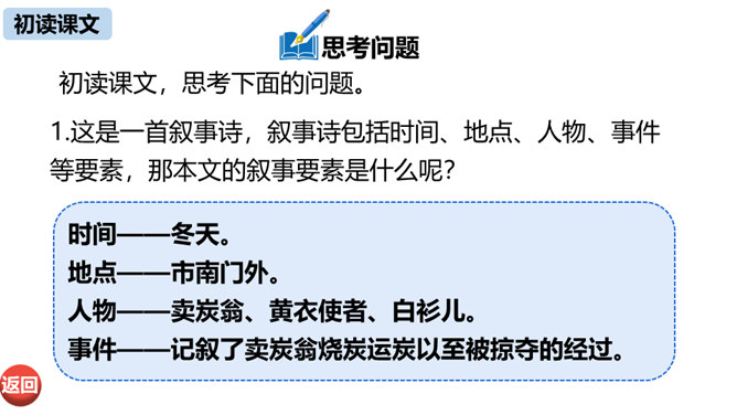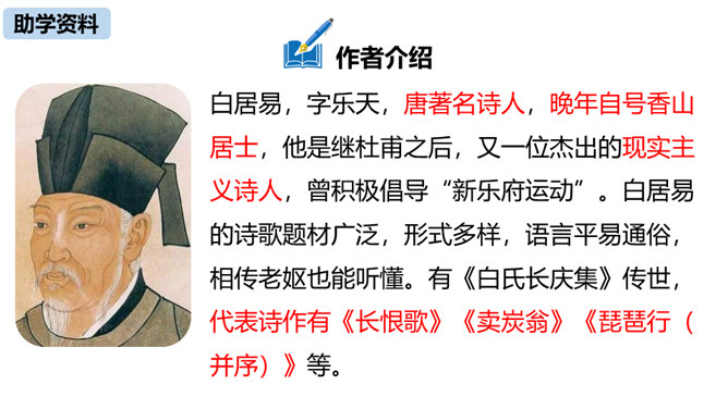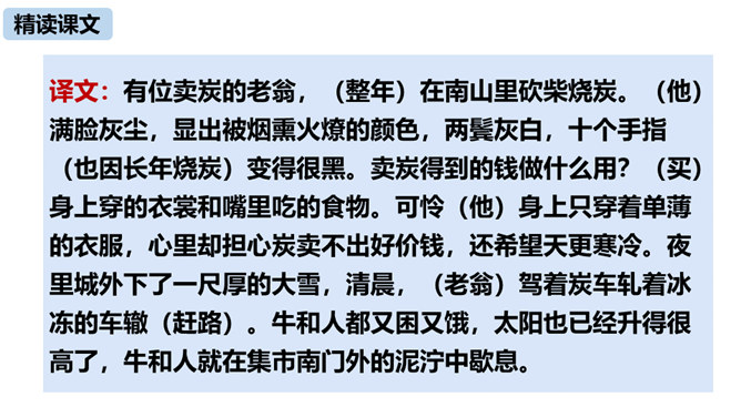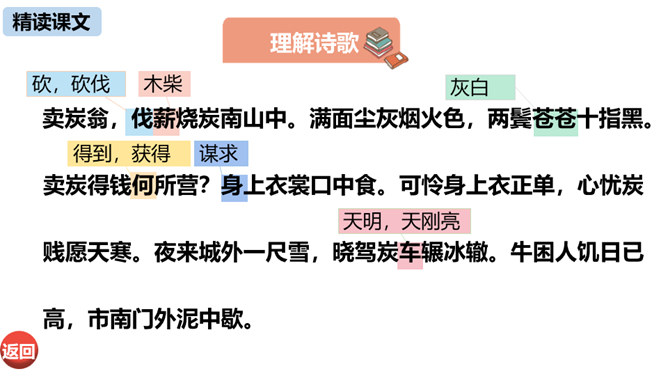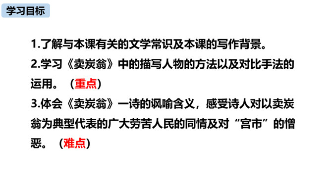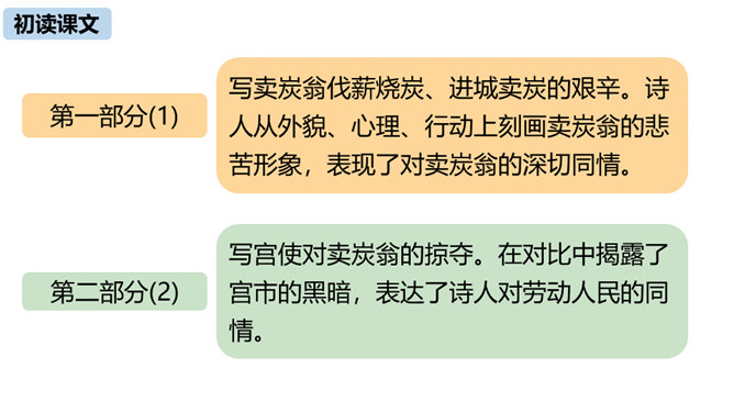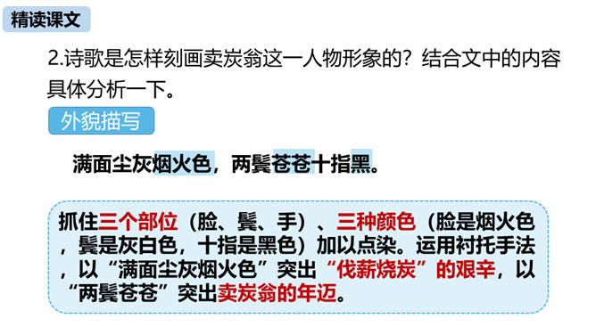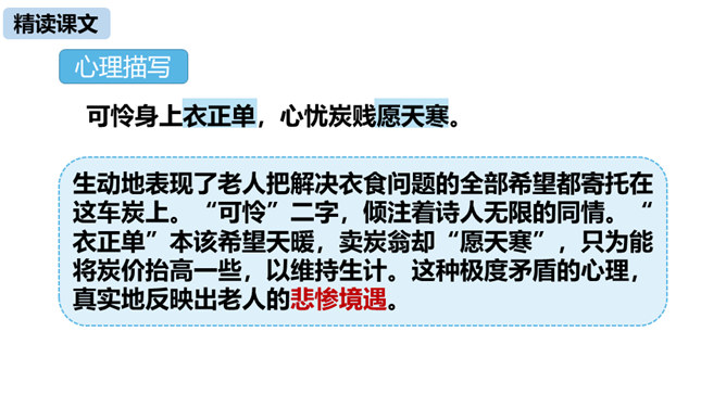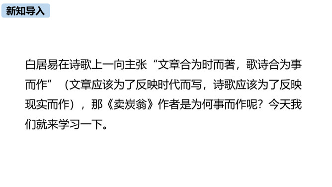 这首叙事诗,仅用一百三十五个字,便完整地叙述了一位卖炭老人烧炭、运炭和卖炭未成、被宫使掠夺的经过。全诗层次清楚,脉络分明。第1节主要写伐薪烧炭、进城卖炭的艰辛;第2节写宫使抢炭的霸道。诗人以“满面尘灰烟火色”突出“伐薪烧炭”的艰辛,以“两鬓苍苍”突出年迈,如此,老翁的命运激起了人们的同情;写老翁“衣正单”,再以夜来的“一尺雪”和路上的“冰辙”来衬托,这更使人感到老翁的“可怜”,也反衬了老翁希望之火的炽烈:天寒炭贵,可以多卖些钱。接下来,诗人以“牛困人饥”和“翩翩两骑”,写劳动者与宫使境遇的悬殊。所属专题:卖炭翁ppt。