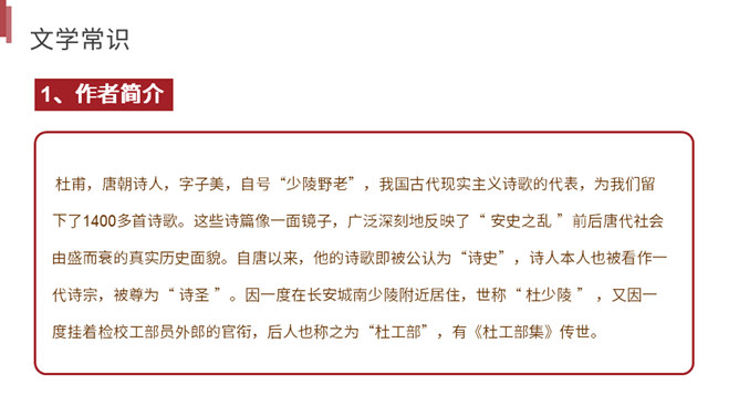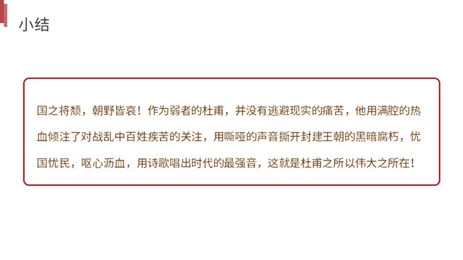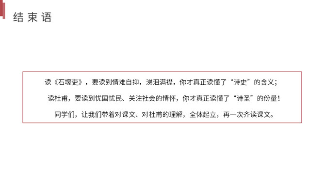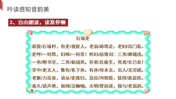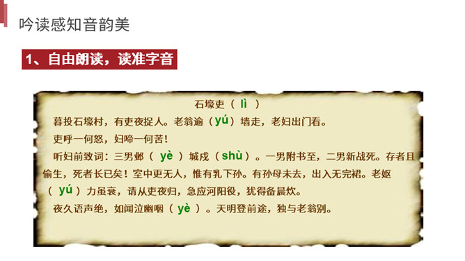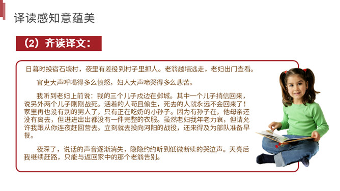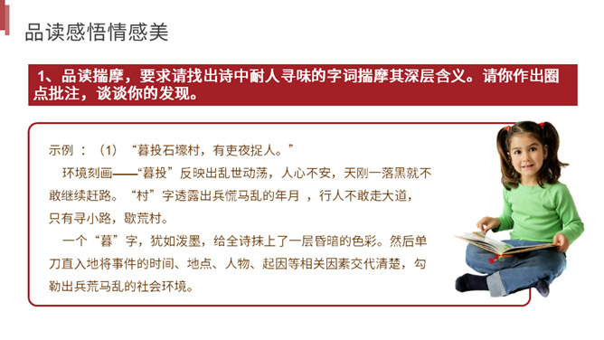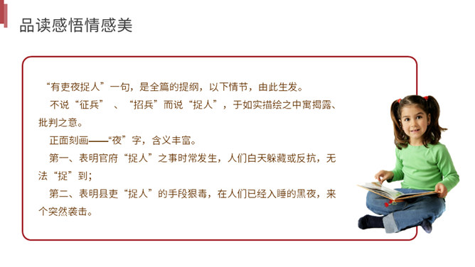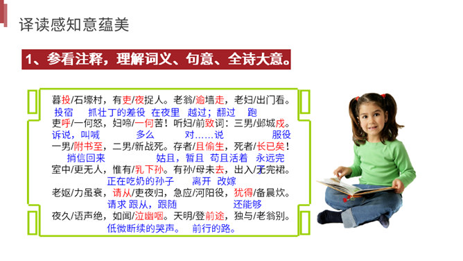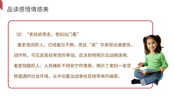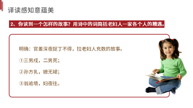 你读到一个怎样的故事?用诗中的词简括老妇人一家各个人的糟遇。明确:官差深夜捉丁不得,拉老妇人充数的故事。①三男戍,二男死;②孙方乳,媳无裙;③翁逾墙,妇夜往。品读揣摩,要求请找出诗中耐人寻味的字词揣摩其深层含义。请你作出圈点批注,谈谈你的发现。示例 :“暮投石壕村,有吏夜捉人。” 环境刻画——“暮投”反映出乱世动荡,人心不安,天刚一落黑就不敢继续赶路。“村”字透露出兵慌马乱的年月 ,行人不敢走大道,只有寻小路,歇荒村。一个“暮”字,犹如泼墨,给全诗抹上了一层昏暗的色彩。所属专题:石壕吏ppt。