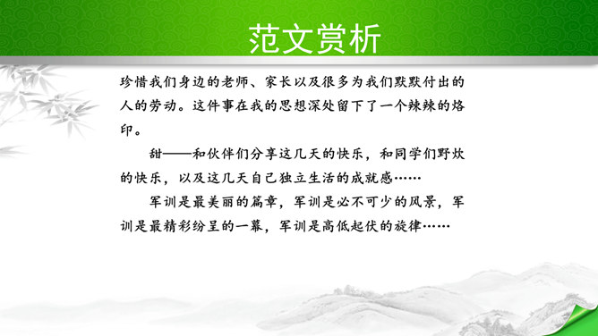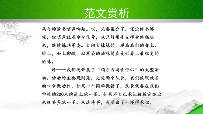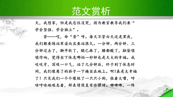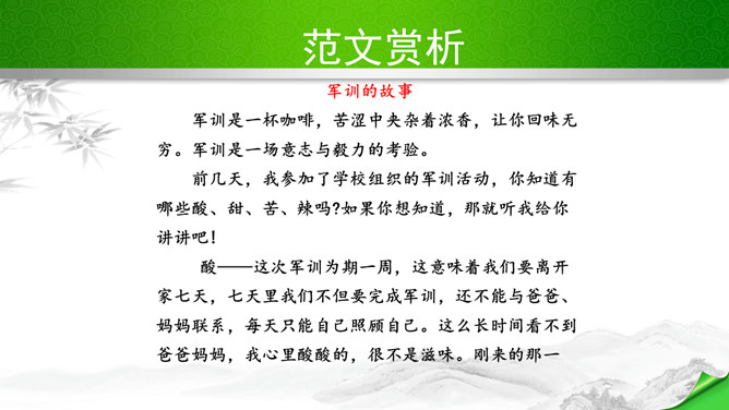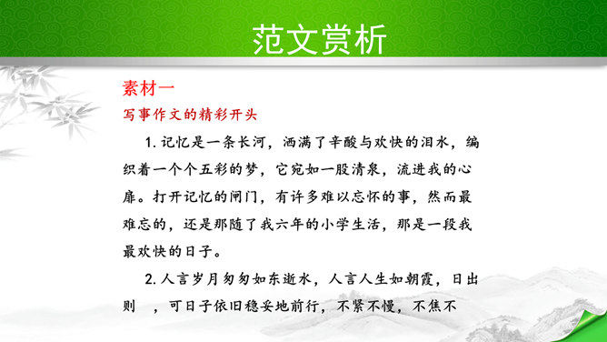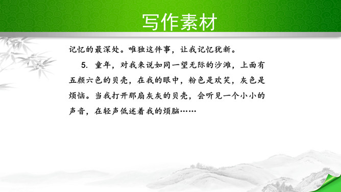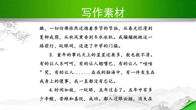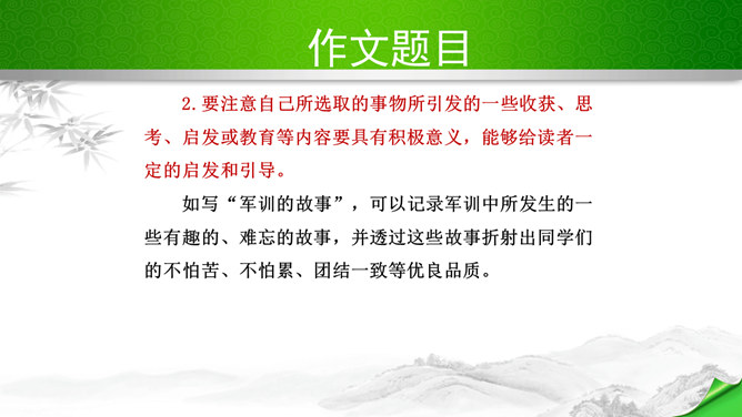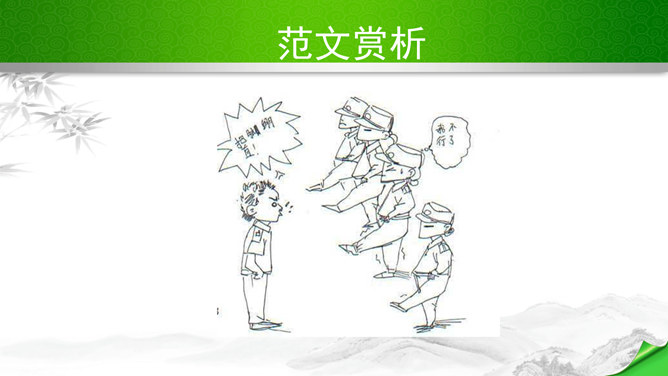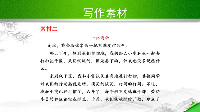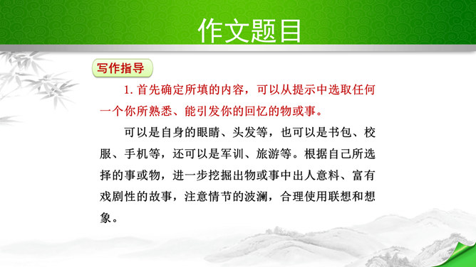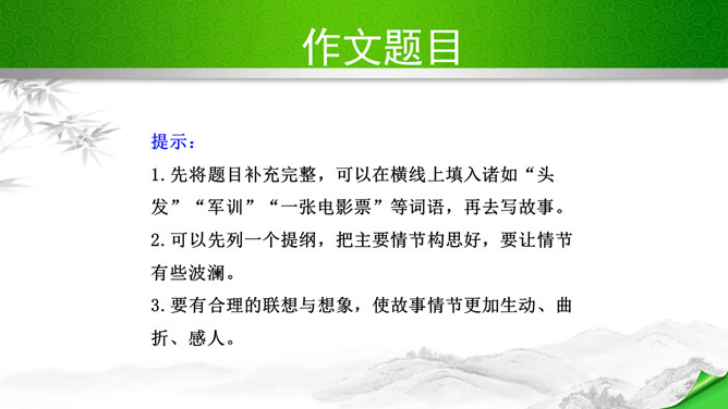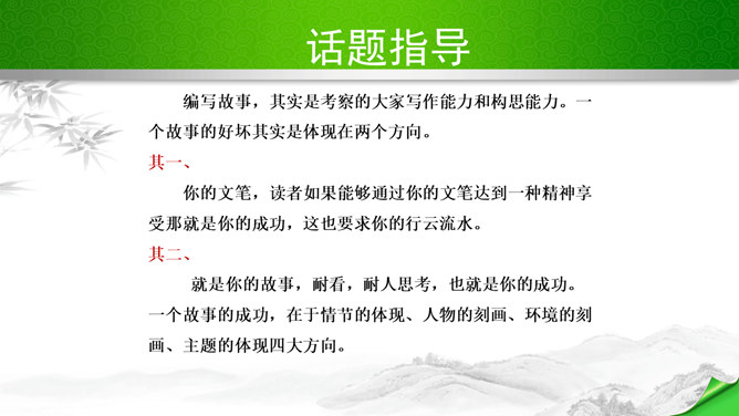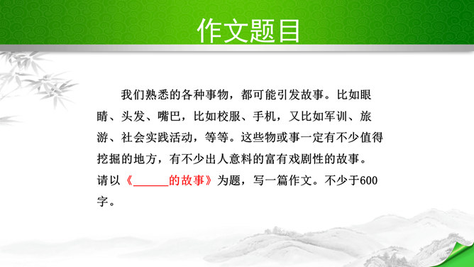 编写故事,其实是考察的大家写作能力和构思能力。一个故事的好坏其实是体现在两个方向。其一、你的文笔,读者如果能够通过你的文笔达到一种精神享受那就是你的成功,这也要求你的行云流水。其二、就是你的故事,耐看,耐人思考,也就是你的成功。一个故事的成功,在于情节的体现、人物的刻画、环境的刻画、主题的体现四大方向。我们熟悉的各种事物,都可能引发故事。比如眼睛、头发、嘴巴,比如校服、手机,又比如军训、旅游、社会实践活动,等等。这些物或事一定有不少值得挖掘的地方,有不少出人意料的富有戏剧性的故事。所属专题:学写故事ppt。