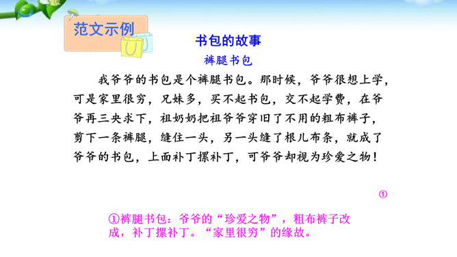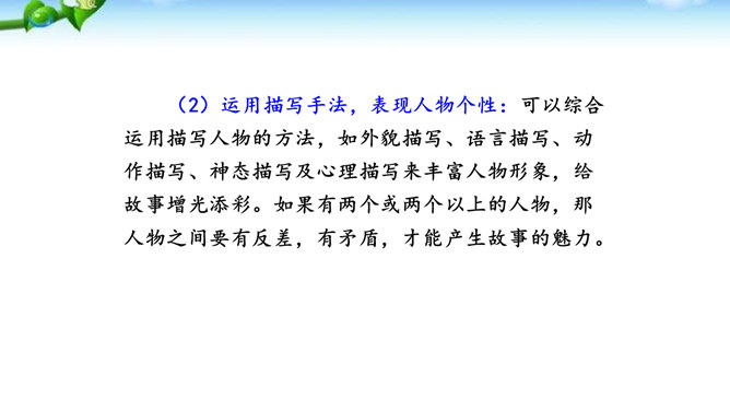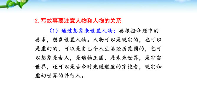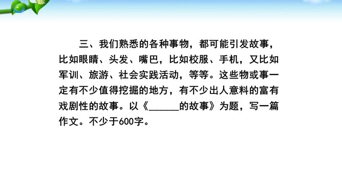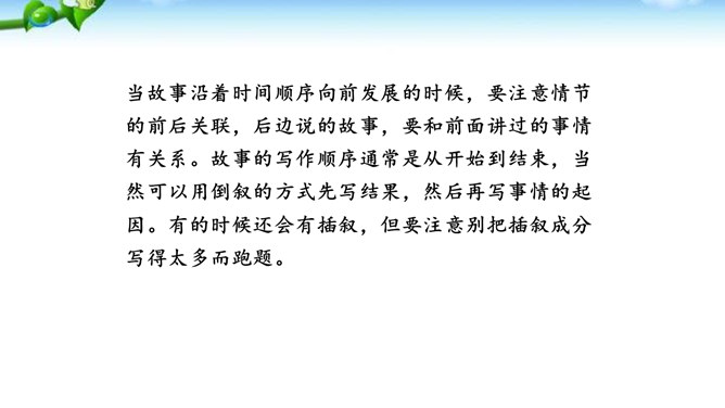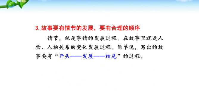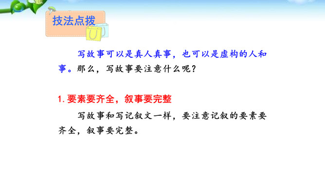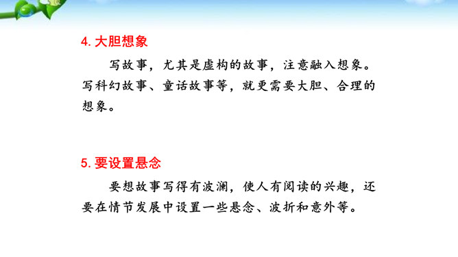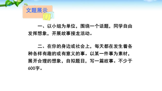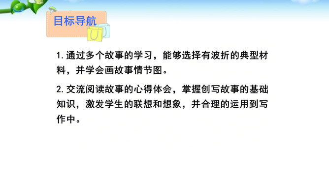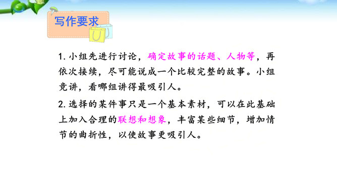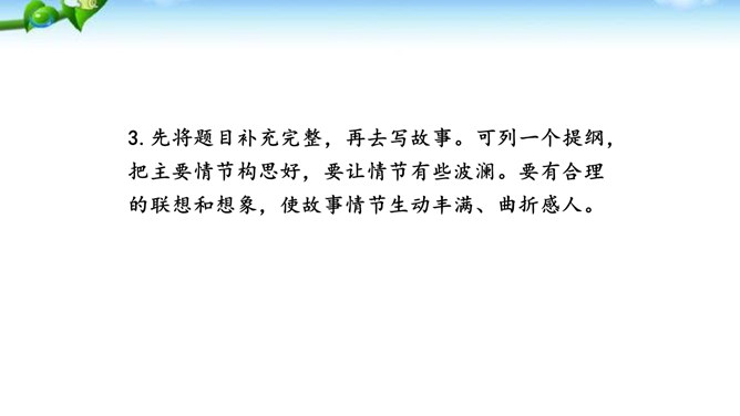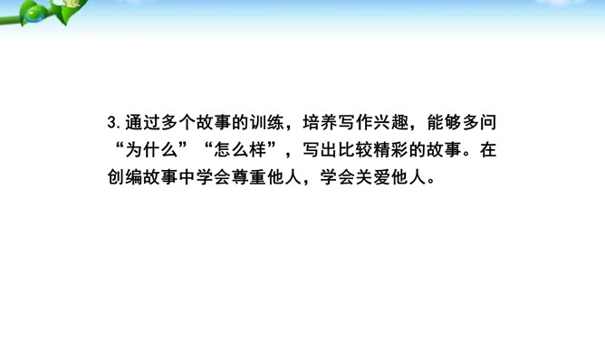 1.通过多个故事的学习,能够选择有波折的典型材料,并学会画故事情节图。2.交流阅读故事的心得体会,掌握创写故事的基础知识,激发学生的联想和想象,并合理的运用到写作中。3.通过多个故事的训练,培养写作兴趣,能够多问“为什么”“怎么样”,写出比较精彩的故事。在创编故事中学会尊重他人,学会关爱他人。以小组为单位,围绕一个话题,同学自由发挥想象,开展故事接龙活动。在你的身边或社会上,每天都在发生着各种各样有趣的或有意义的事。以某一件事为素材,展开合理的想象,自拟题目,写一篇故事。所属专题:学写故事ppt。