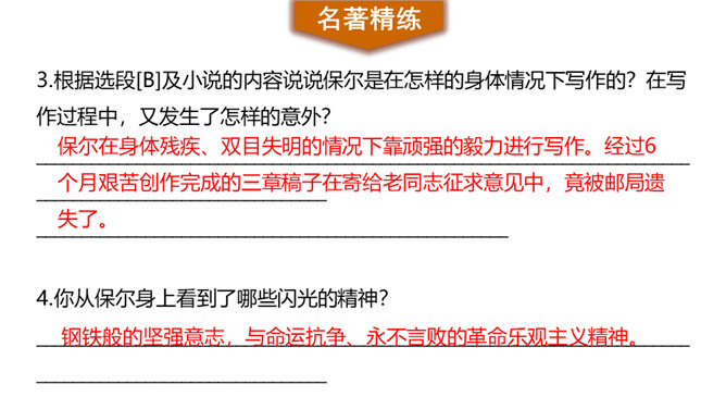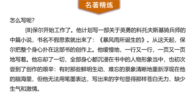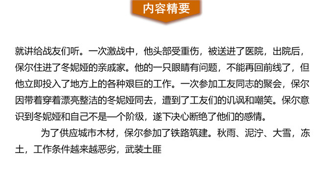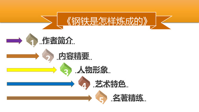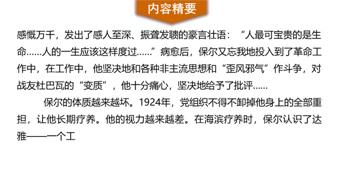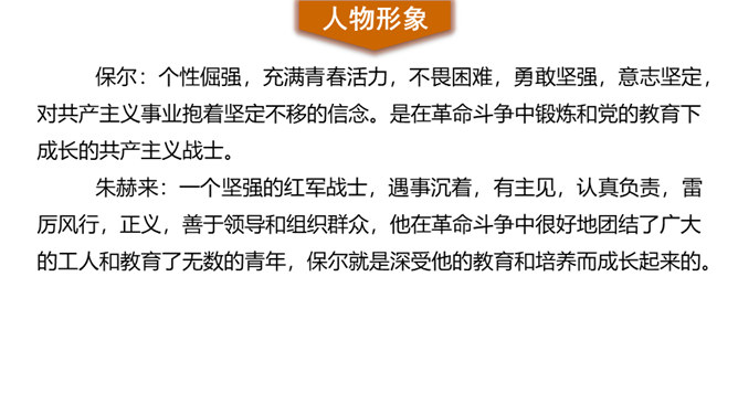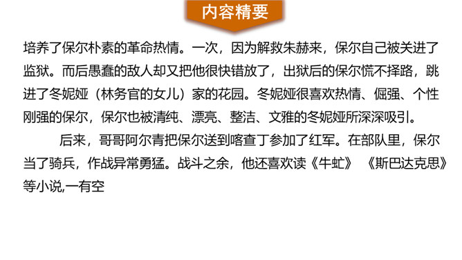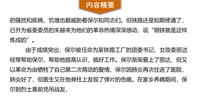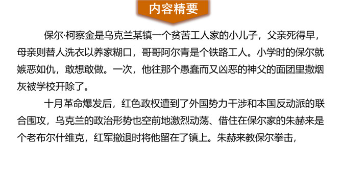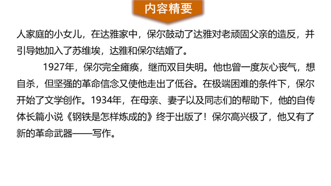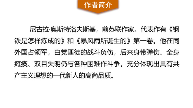尼古拉·奥斯特洛夫斯基,前苏联作家。代表作有《钢铁是怎样炼成的》和《暴风雨所诞生的》第一卷。他在同外国占领军,白党匪徒的战斗负伤,后来身带弹伤、全身瘫痪、双目失明仍与各种困难作斗争,充分体现出具有共产主义理想的一代新人的高尚品质。保尔·柯察金是乌克兰某镇一个贫苦工人家的小儿子,父亲死得早,母亲则替人洗衣以养家糊口,哥哥阿尔青是个铁路工人。小学时的保尔就嫉恶如仇,敢想敢做。一次,他往那个愚蠢而又凶恶的神父的面团里撒烟灰被学校开除了。所属专题:钢铁是怎样炼成的ppt。