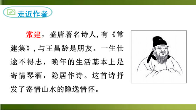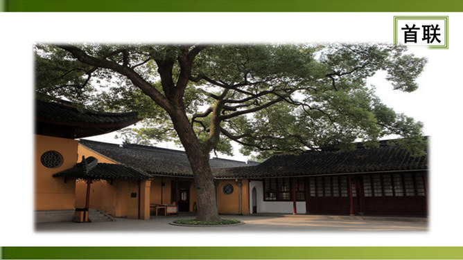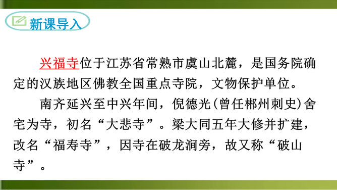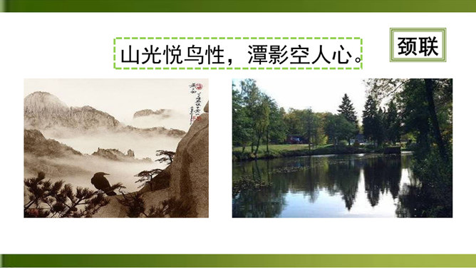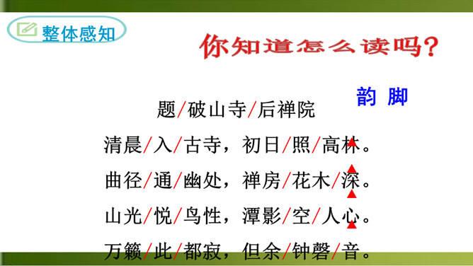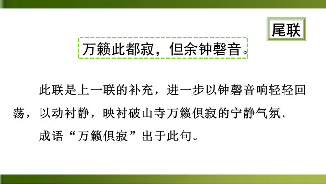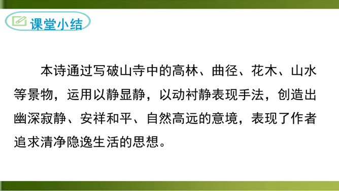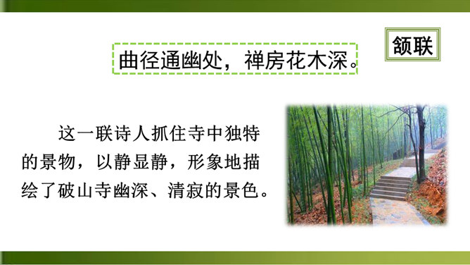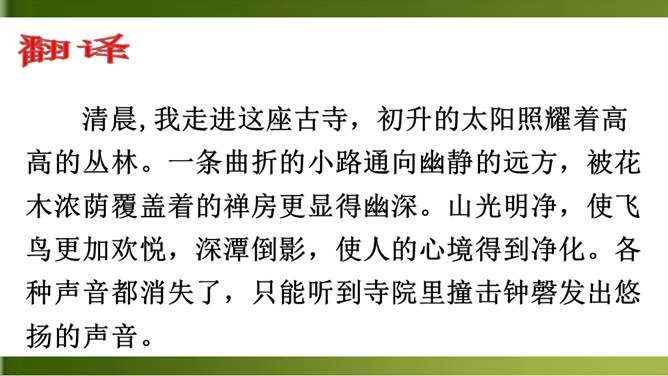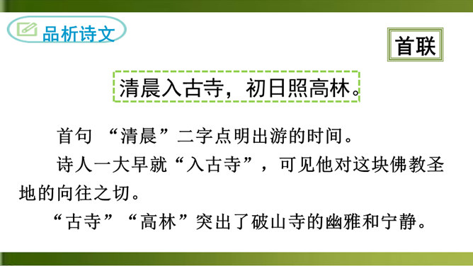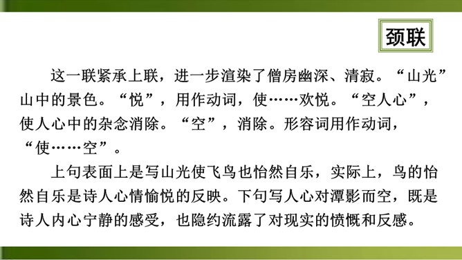 首句 “清晨”二字点明出游的时间。诗人一大早就“入古寺”,可见他对这块佛教圣地的向往之切。“古寺”“高林”突出了破山寺的幽雅和宁静。这一联诗人抓住寺中独特的景物,以静显静,形象地描绘了破山寺幽深、清寂的景色。这一联紧承上联,进一步渲染了僧房幽深、清寂。“山光”山中的景色。“悦”,用作动词,使……欢悦。“空人心”,使人心中的杂念消除。“空”,消除。形容词用作动词,“使……空”。上句表面上是写山光使飞鸟也怡然自乐,实际上,鸟的怡然自乐是诗人心情愉悦的反映。所属专题:题破山寺后禅院ppt。