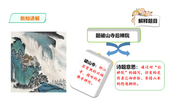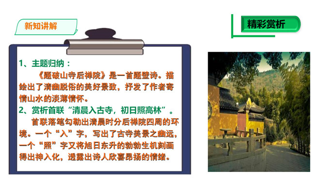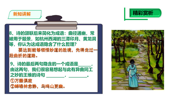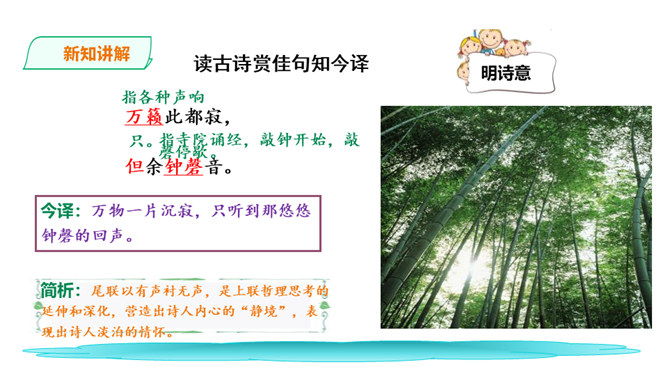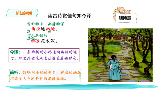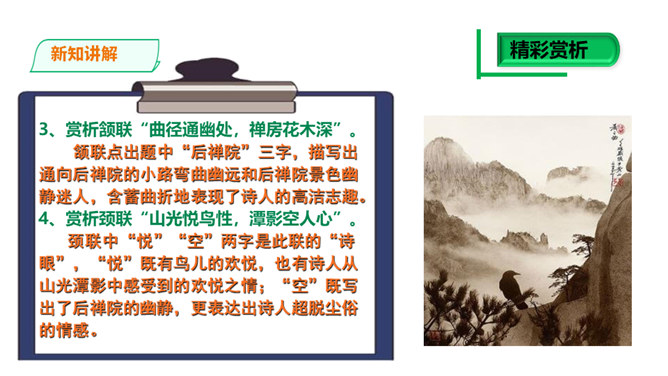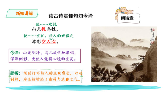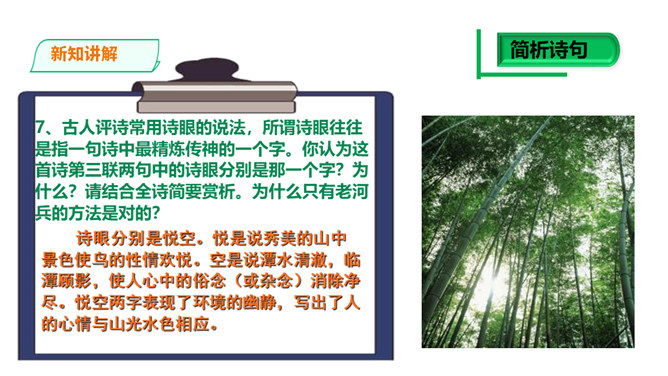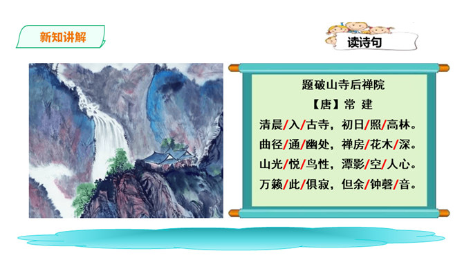 在我国源远流长、丰富多彩的长河中,古诗词就像一朵馨香独具的奇葩,永开不败。有的诗人,他胸怀大志,博览群书;有的诗人,他屡受排挤,报国无门;有的诗人,他独登高楼,难觅知音。于是他们百感交集,写下了一首首千古绝唱。今天我们就一起走进诗人们的内心世界,领略中华古诗的魅力!古人评诗常用诗眼的说法,所谓诗眼往往是指一句诗中最精炼传神的一个字。你认为这首诗第三联两句中的诗眼分别是那一个字?为什么?请结合全诗简要赏析。为什么只有老河兵的方法是对的?所属专题:题破山寺后禅院ppt。