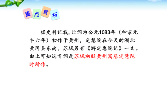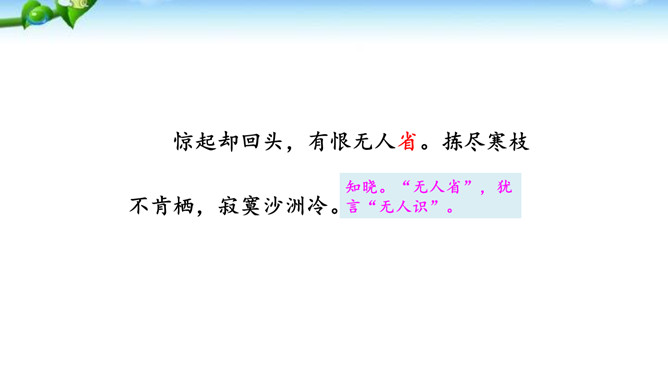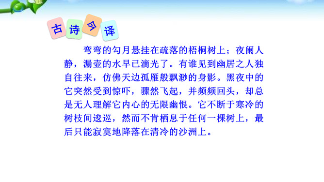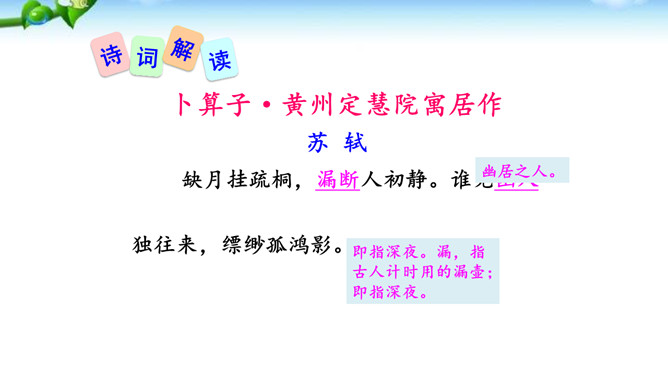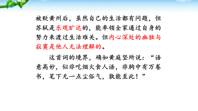在这首词中,作者借月夜孤鸿这一形象托物寓怀,表达了孤高自许、蔑视流俗的心境。被贬黄州后,虽然自己的生活都有问题,但苏轼是乐观旷达的,能率领全家通过自身的努力来渡过生活难关。但内心深处的幽独与寂寞是他人无法理解的。这首词的境界,确如黄庭坚所说:“语意高妙,似非吃烟火食人语,非胸中有万卷书,笔下无一点尘俗气,孰能至此!”这种高旷洒脱、绝去尘俗的境界,得益于高妙的艺术技巧。作者“以性灵咏物语”,取神题外,意中设境,托物寓人;对孤鸿和月夜环境背景的描写中,选景叙事均简约凝练,空灵飞动,含蓄蕴藉。