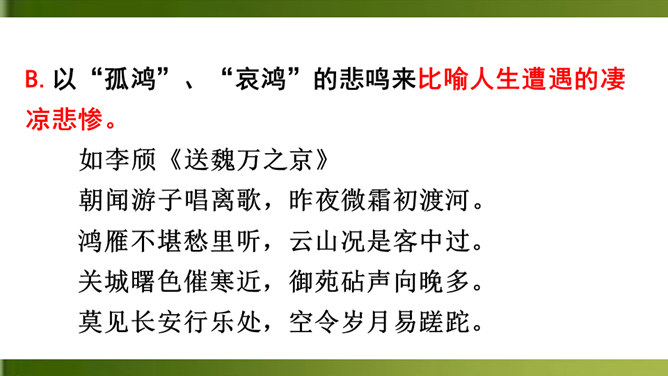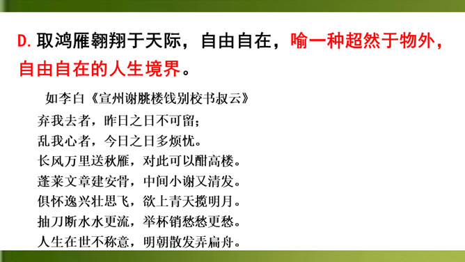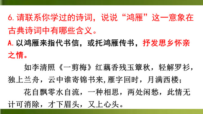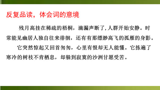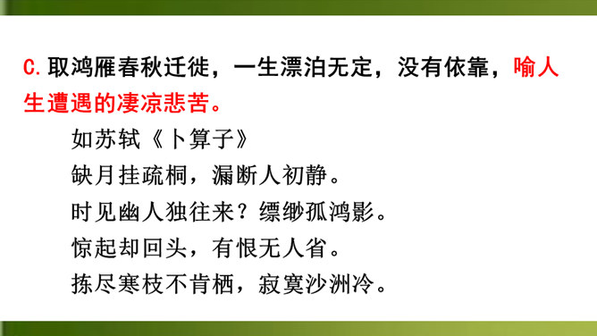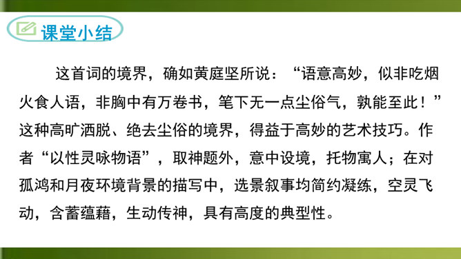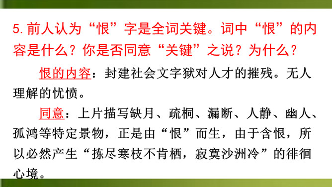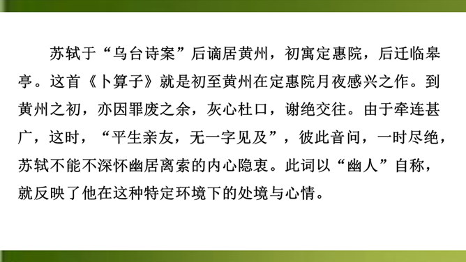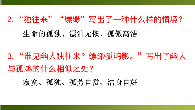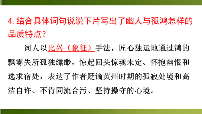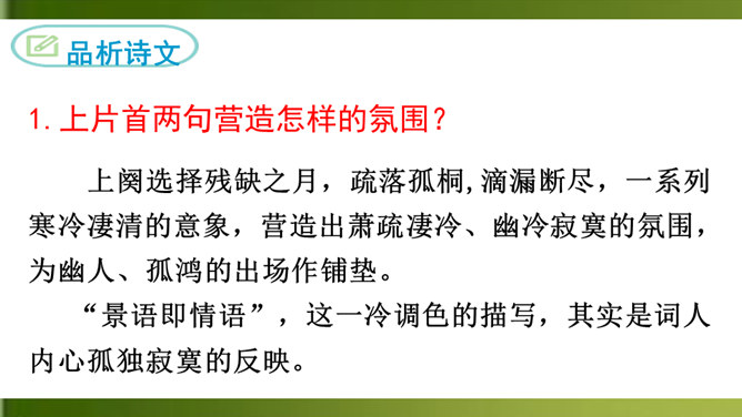 上片首两句营造怎样的氛围?上阕选择残缺之月,疏落孤桐,滴漏断尽,一系列寒冷凄清的意象,营造出萧疏凄冷、幽冷寂寞的氛围,为幽人、孤鸿的出场作铺垫。“景语即情语”,这一冷调色的描写,其实是词人内心孤独寂寞的反映。 “独往来”“缥缈”写出了一种什么样的情境?生命的孤独、漂泊无依、孤傲高洁。“谁见幽人独往来?缥缈孤鸿影。”写出了幽人与孤鸿的什么相似之处?寂寞、孤独、孤芳自赏、洁身自好。结合具体词句说说下片写出了幽人与孤鸿怎样的品质特点?