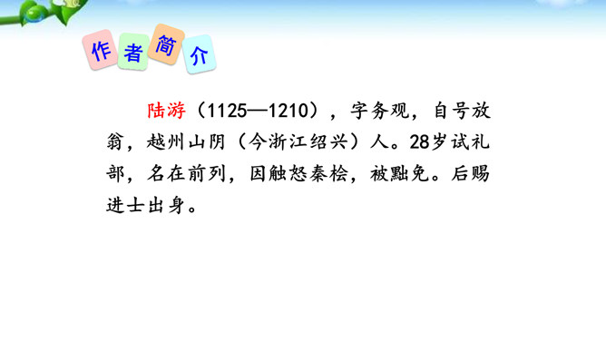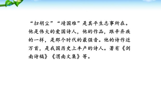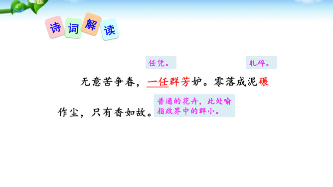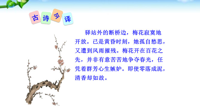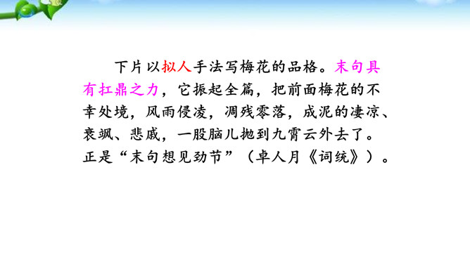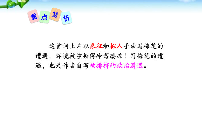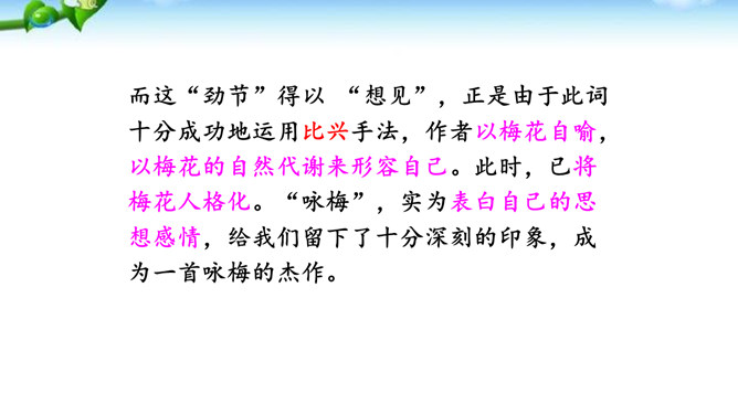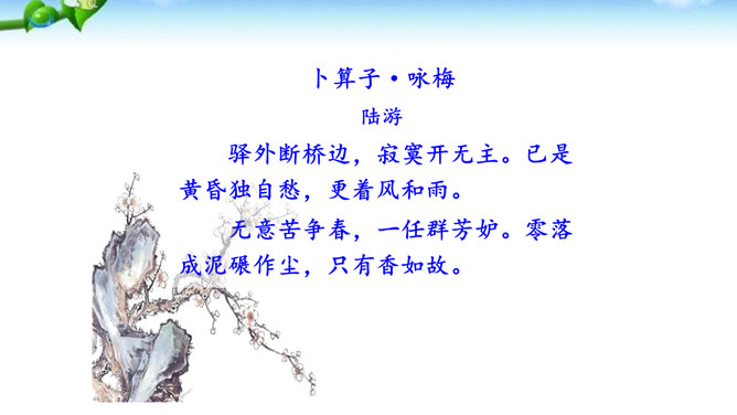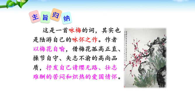 这是一首咏梅的词,其实也是陆游自己的咏怀之作。作者以梅花自喻,借梅花孤高正直、操节自守、矢志不渝的高尚品质,抒发自己请缨无路、壮志难酬的苦闷和炽热的爱国情怀。这首词上片以象征和拟人手法写梅花的遭遇,环境被渲染得冷落凄凉!写梅花的遭遇,也是作者自写被排挤的政治遭遇。下片以拟人手法写梅花的品格。末句具有扛鼎之力,它振起全篇,把前面梅花的不幸处境,风雨侵凌,凋残零落,成泥的凄凉、衰飒、悲戚,一股脑儿抛到九霄云外去了。而这“劲节”得以 “想见”,正是由于此词十分成功地运用比兴手法。所属专题:卜算子咏梅ppt。
